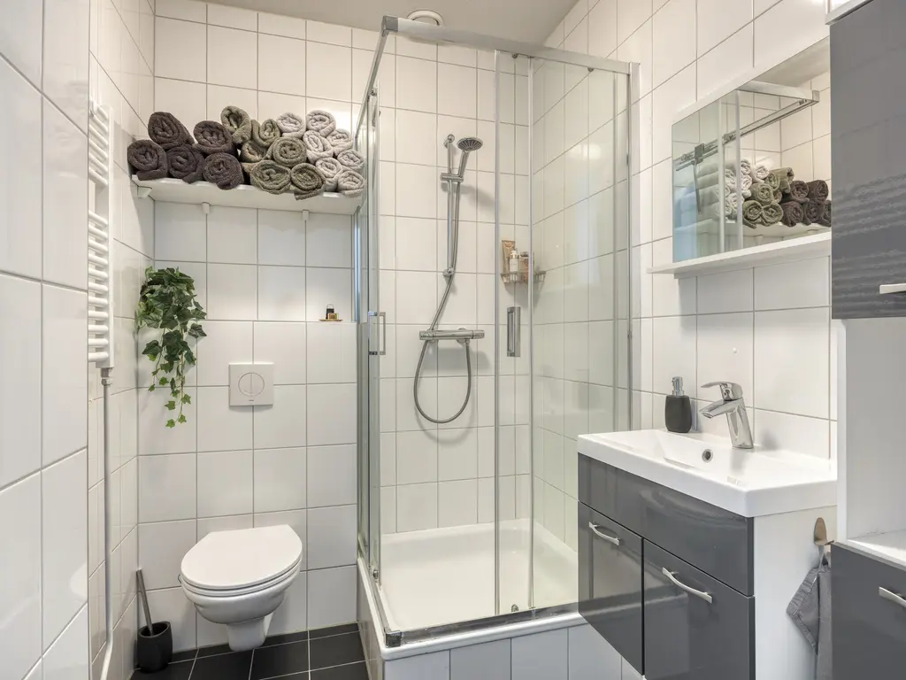 The bedroom is generously sized, with space for a double bed and a walk-in closet. The bathroom is stylishly finished and equipped with a walk-in shower, washbasin cabinet, and toilet.
