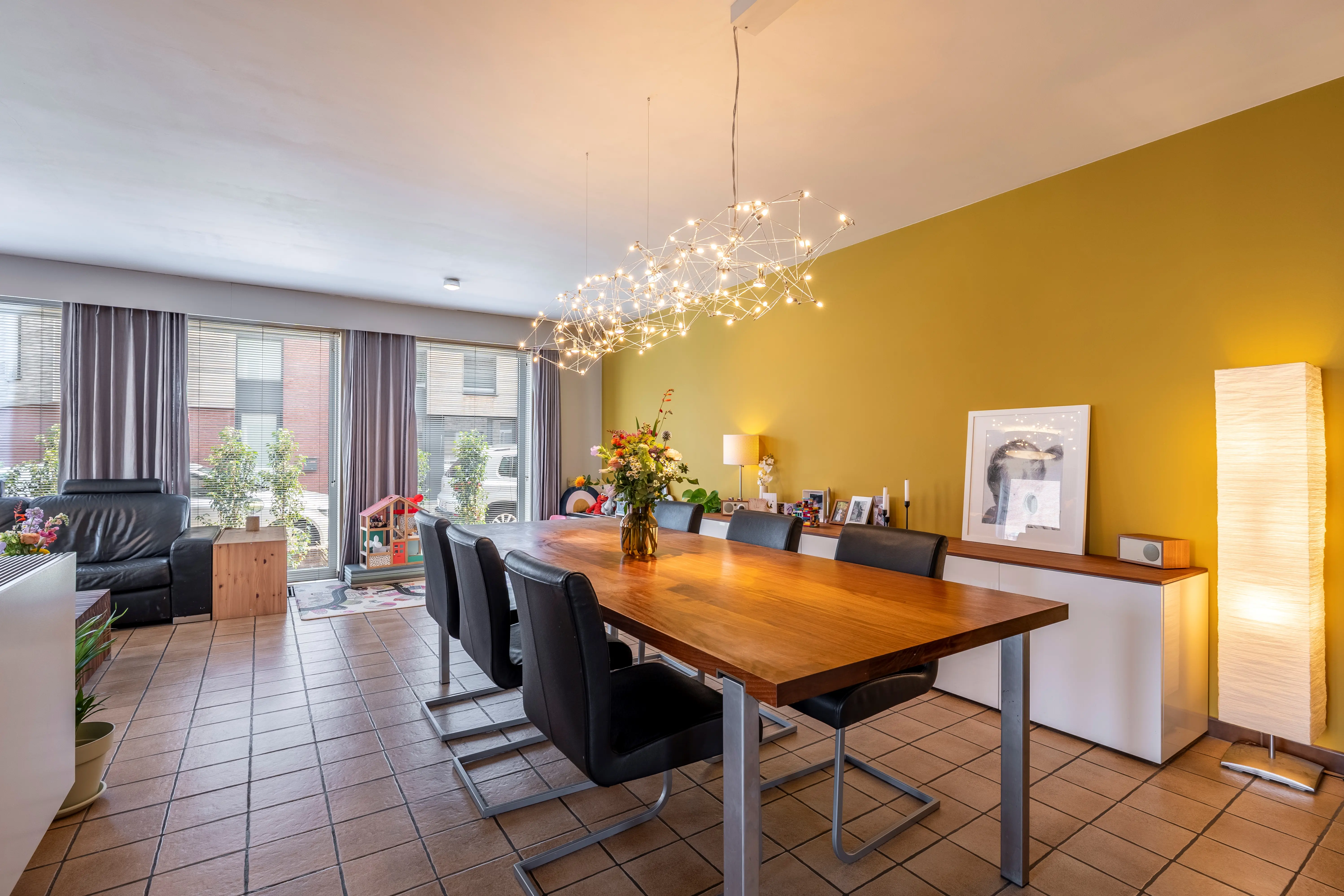 De woonkamer is verdeeld in een zitgedeelte (vooraan) en een eetgedeelte (achteraan) en geniet van veel natuurlijk daglicht door de grote raampartijen.