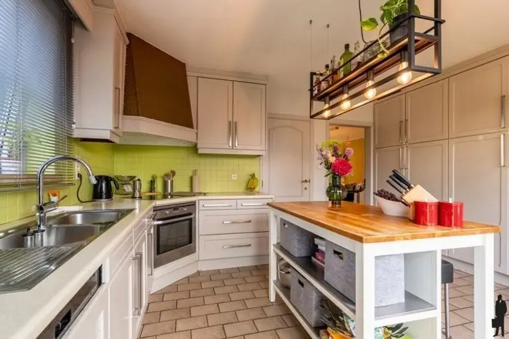 De keuken met eiland is geïnstalleerd met volgende recente kwaliteitstoestellen (AEG en Miele): koelkast, vaatwas, keramische kookplaat, heteluchtoven en voldoende kastruimte.