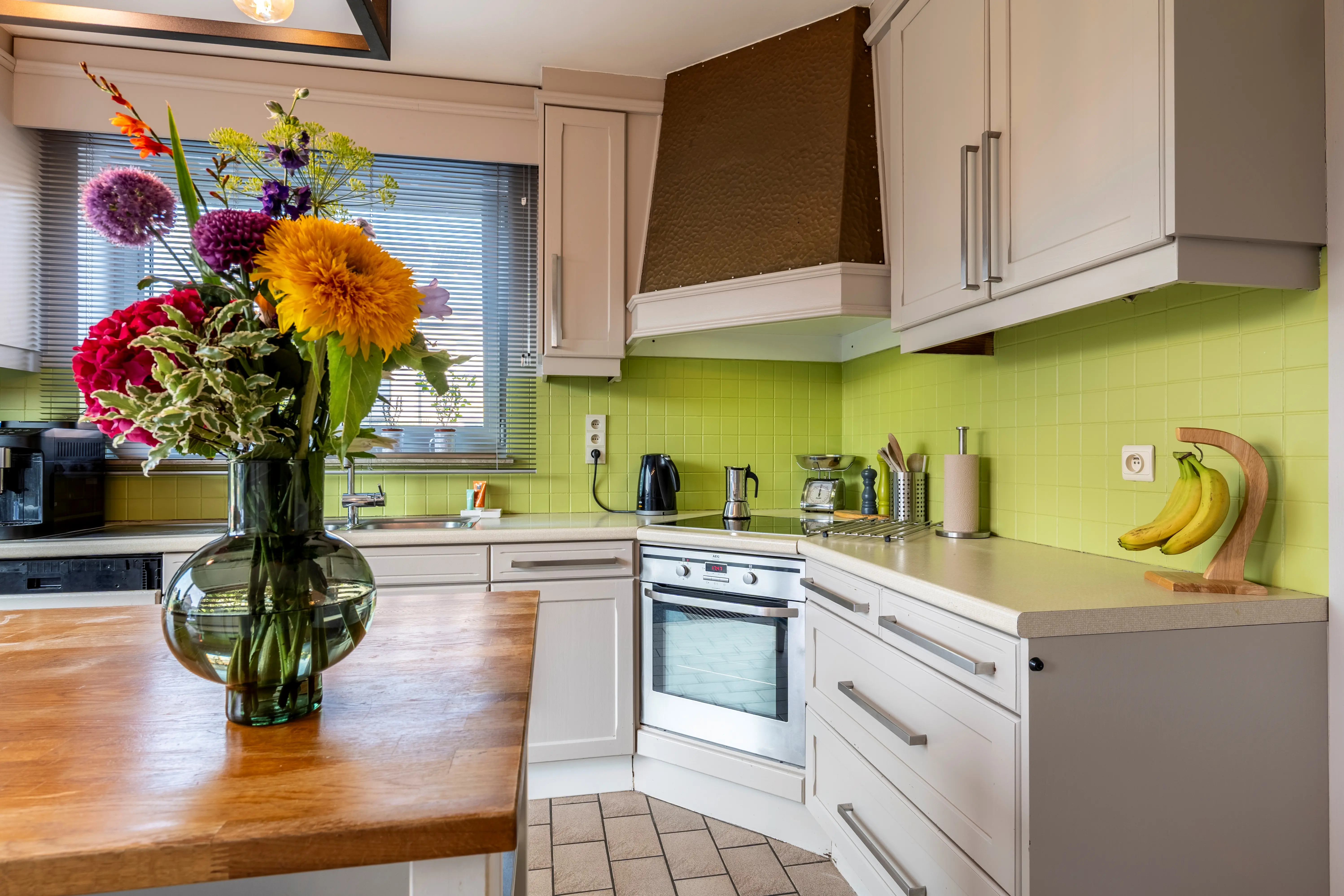 De grote schuifraam die de keuken verbindt met het buitenterras zorgt ervoor dat ook in deze kamer veel natuurlijk daglicht invalt.