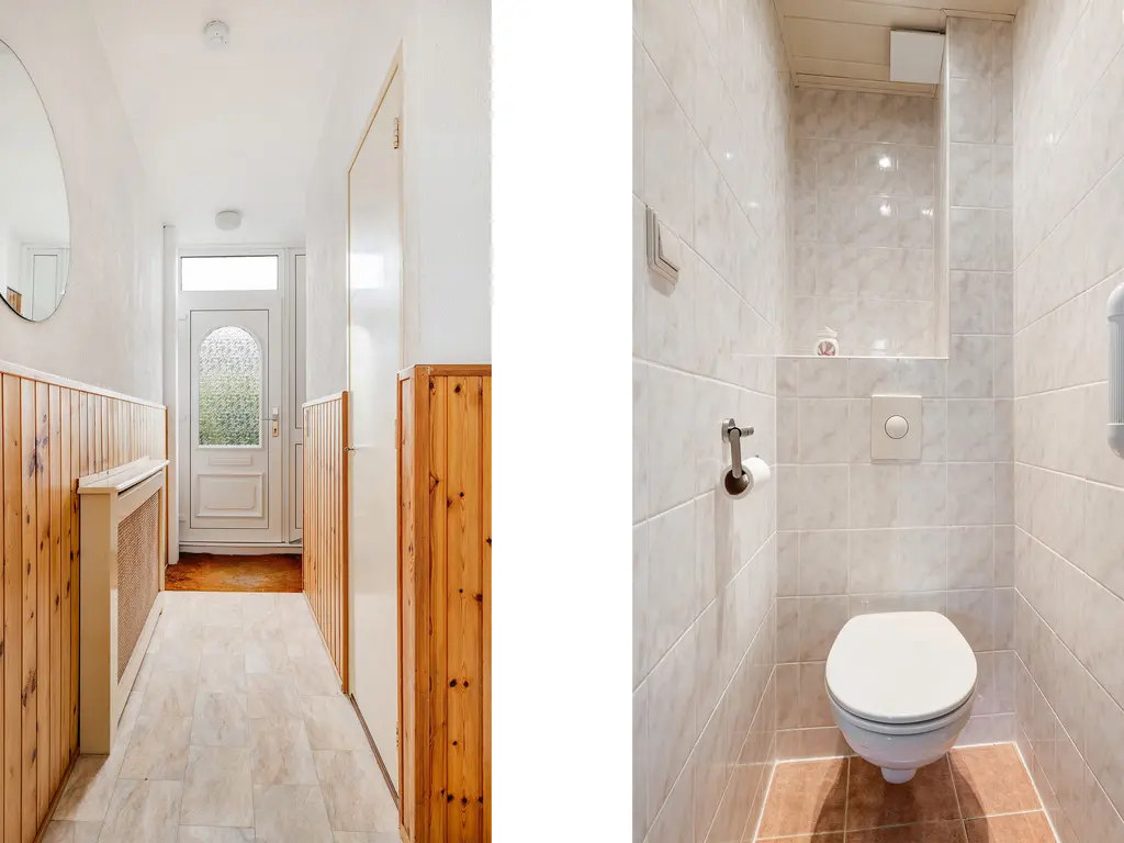 U betreedt de woning via de entreehal, waar zich de meterkast, trapkast, lichte toiletruimte met hangend toilet en de trap naar de eerste verdieping bevinden. Vanuit de hal heeft u toegang tot de woonkamer, keuken en bijkeuken.