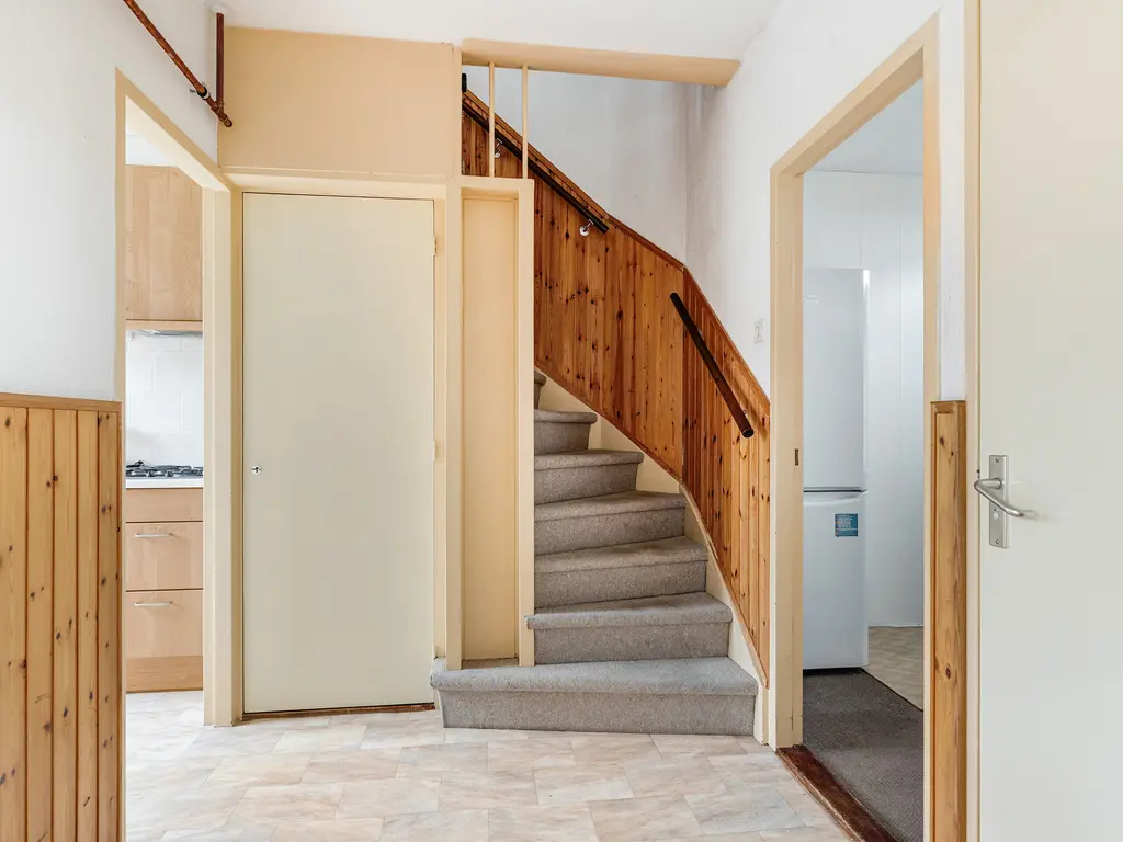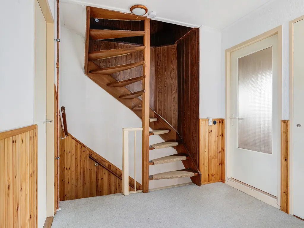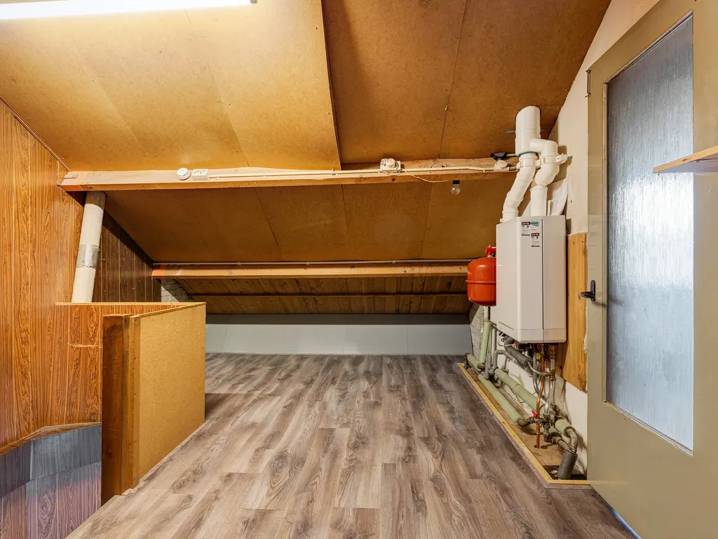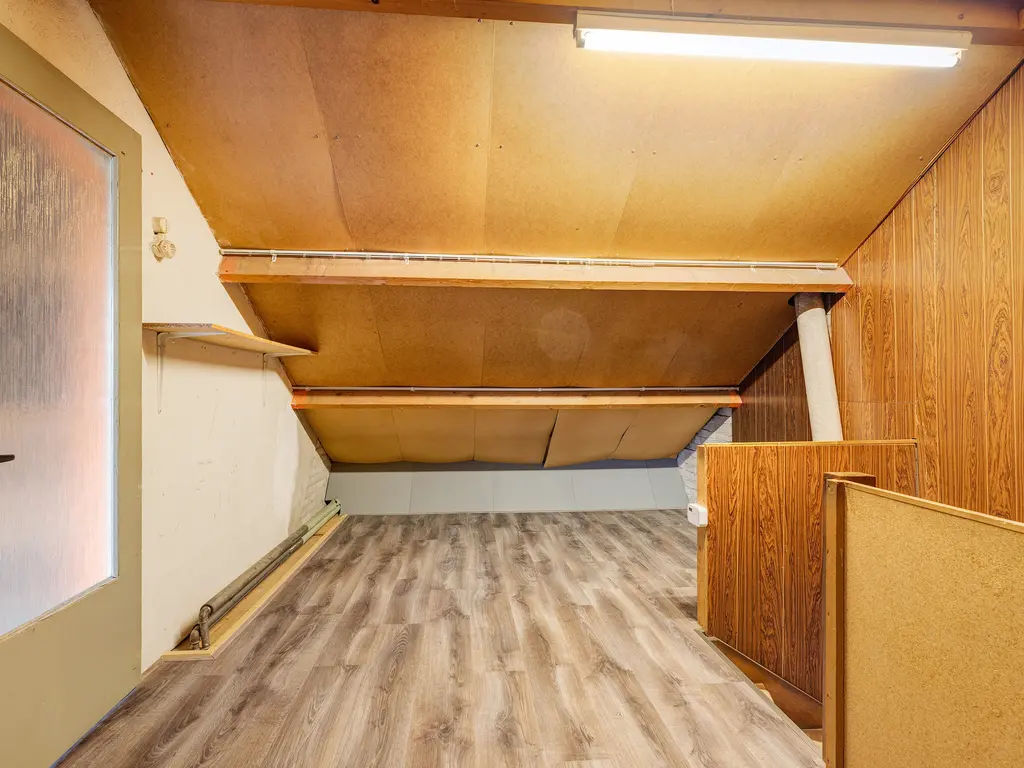 Via de vaste trap bereikt u de tweede verdieping met overloop, CV-opstelling en bergruimte achter de knieschotten.