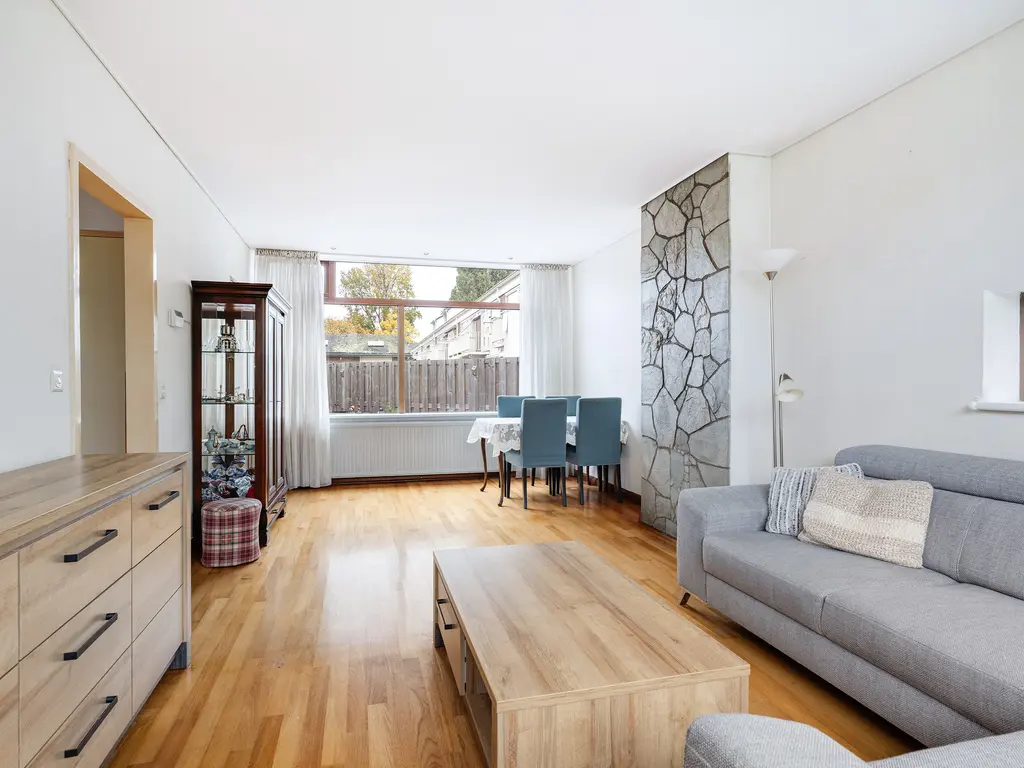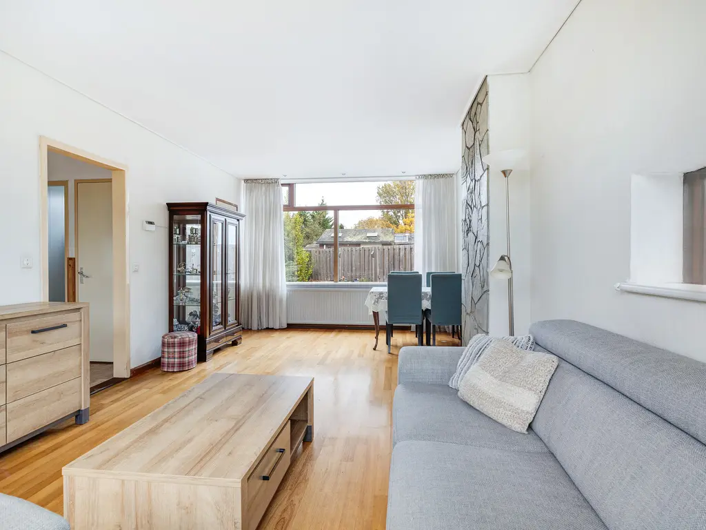 De doorzonwoonkamer is heel licht dankzij de grote ramen aan zowel de voor- als achterzijde. Hier ervaart u direct de prettige sfeer van deze woning. De kamer is voorzien van een parketvloer.