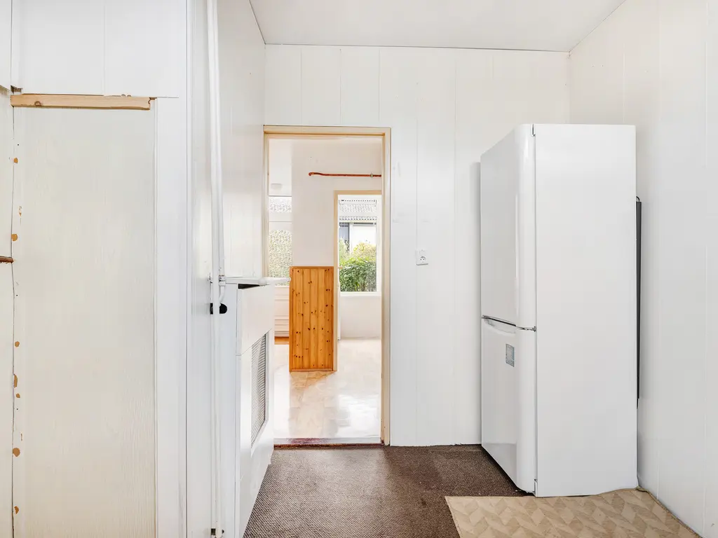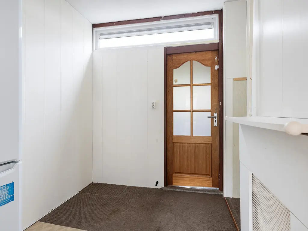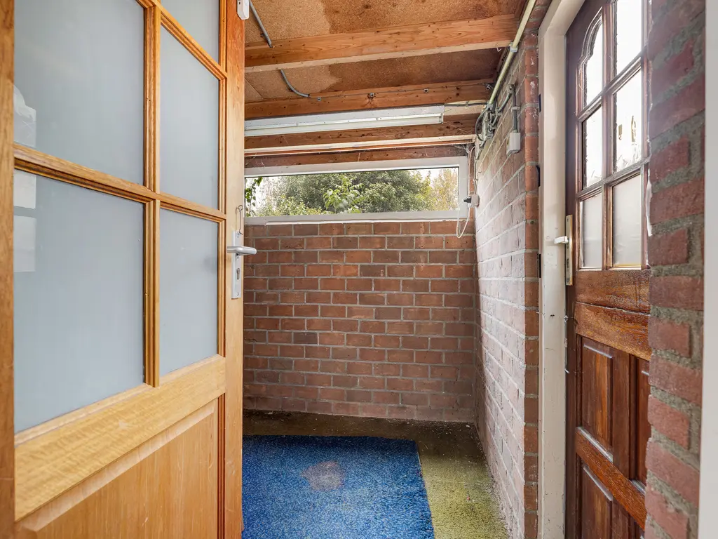 Via de hal komt u in de bijkeuken, met extra bergruimte en ruimte voor bijvoorbeeld een tweede koelkast. Vanuit hier bereikt u de aangebouwde berging, ideaal voor fietsen, tuinmeubilair of gereedschap, en via de berging loopt u zo de achtertuin in.