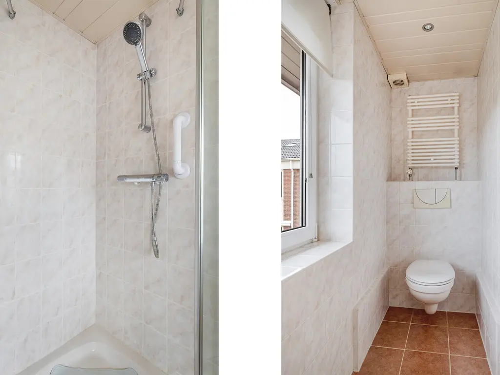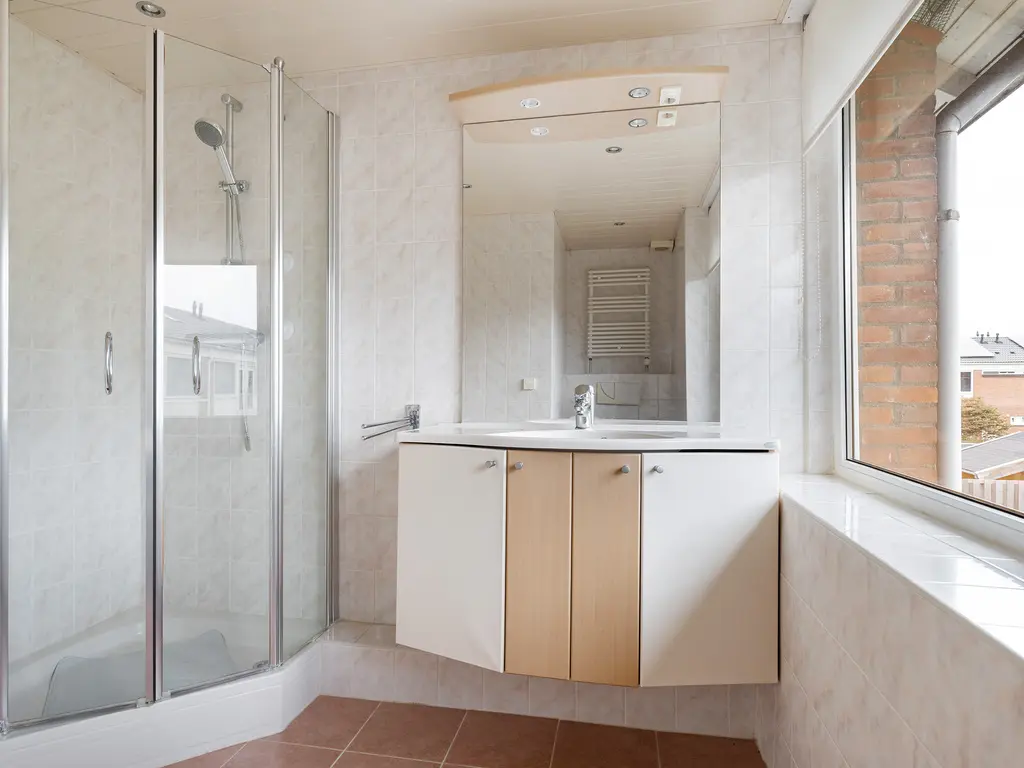 De badkamer is licht en netjes, voorzien van een douchecabine, wastafelmeubel met spiegel en opbergruimte, en een tweede hangend toilet. Dankzij het grote raam is er volop daglicht en natuurlijke ventilatie.