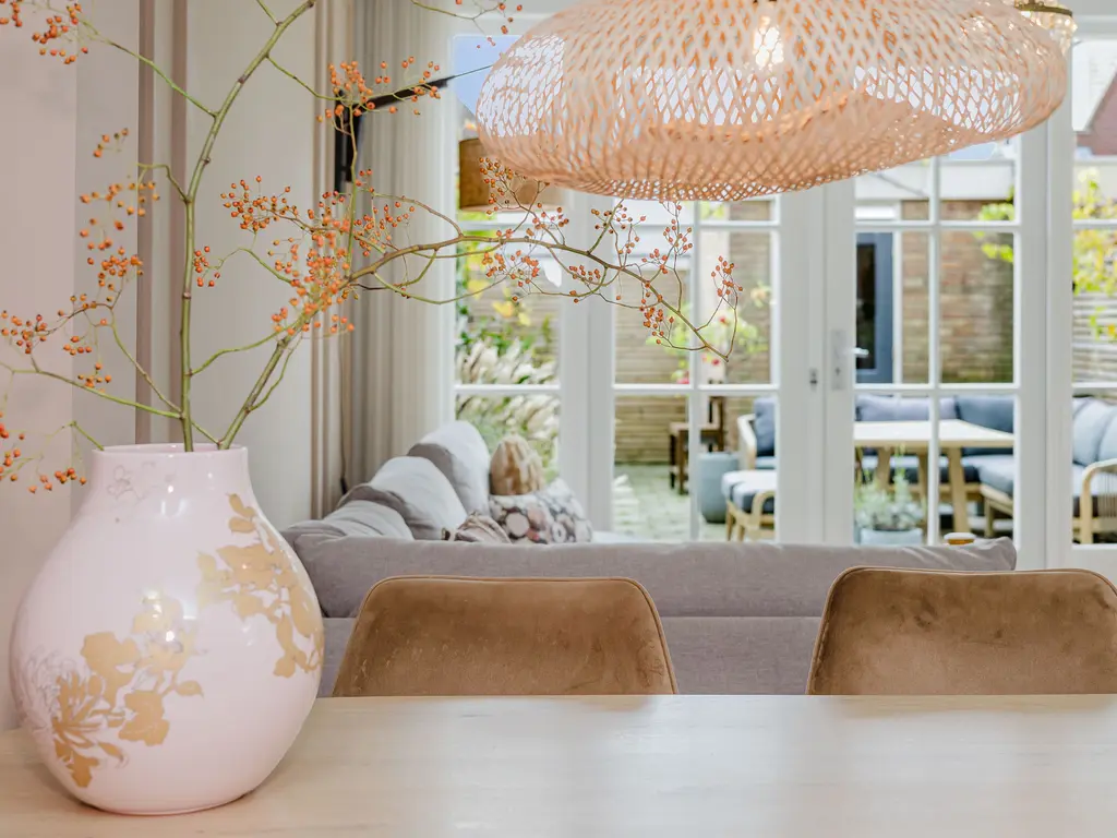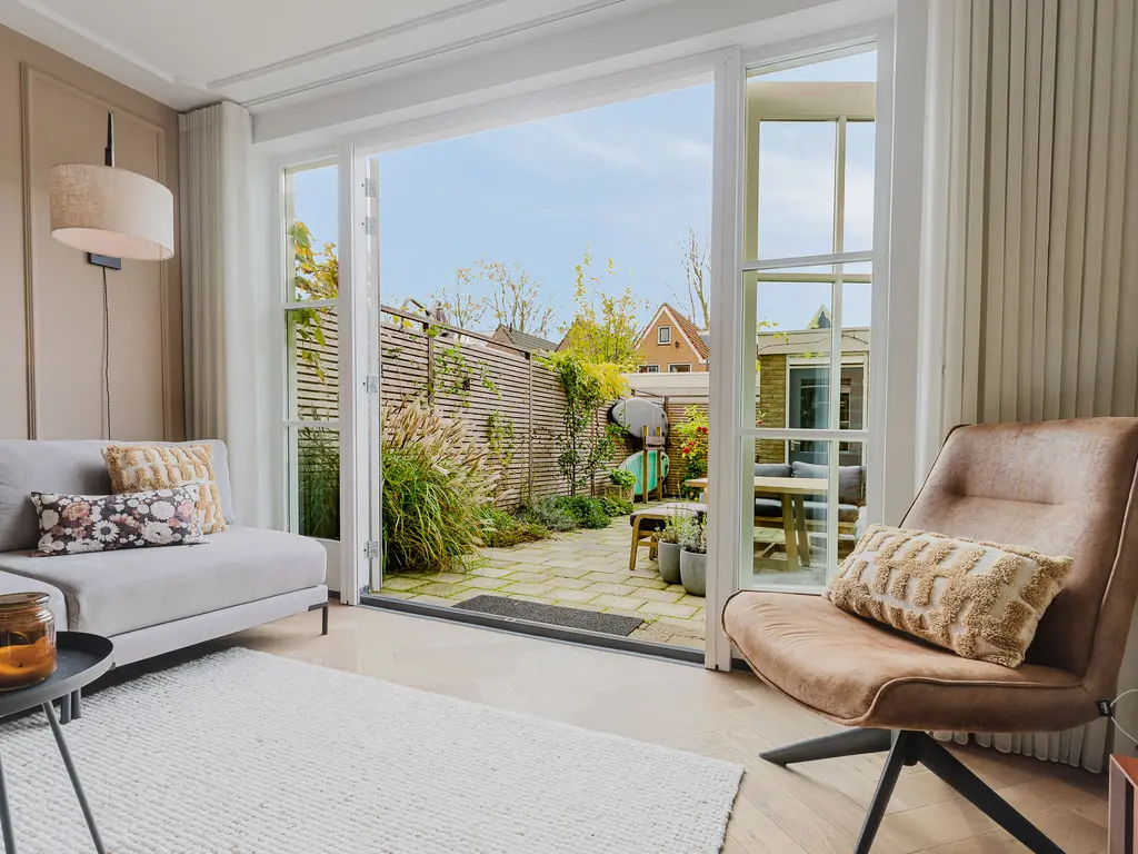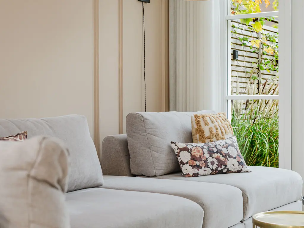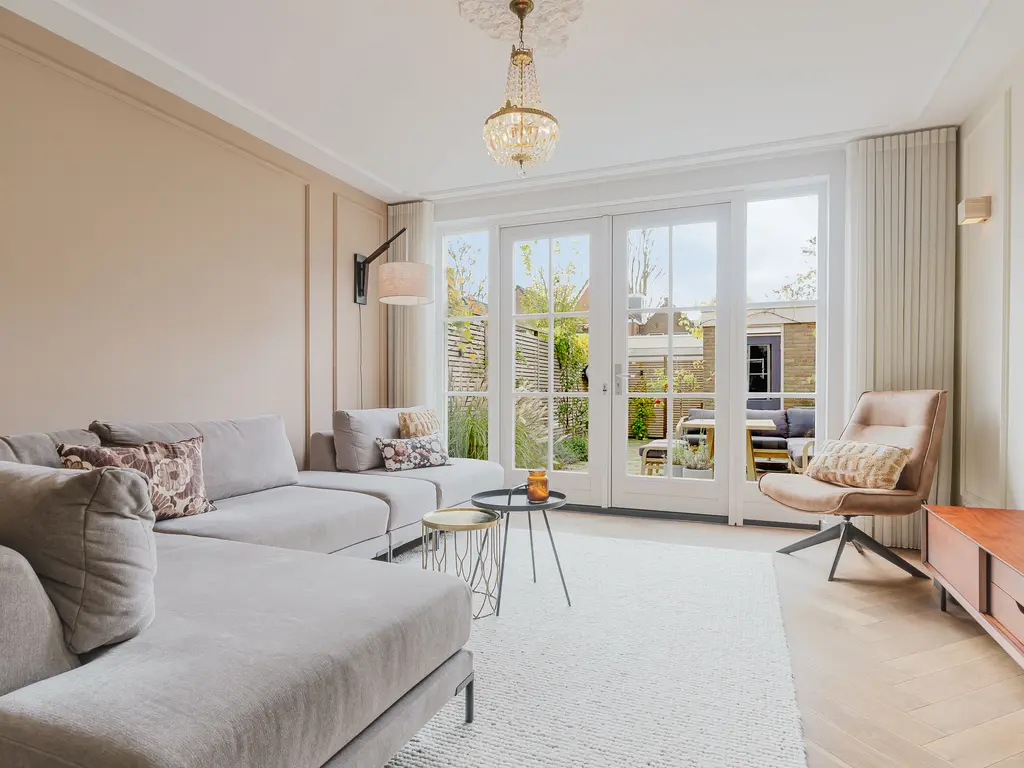 De woonkamer is licht en ruim, dankzij de vernieuwde achterpui met openslaande deuren naar de tuin. Hier geniet je van een fijne zithoek en een royale eethoek met ruimte voor lange avonden tafelen.