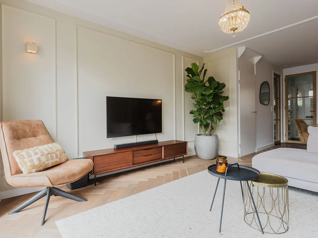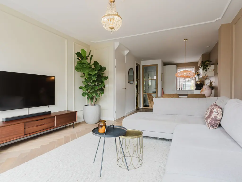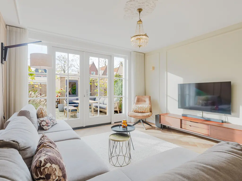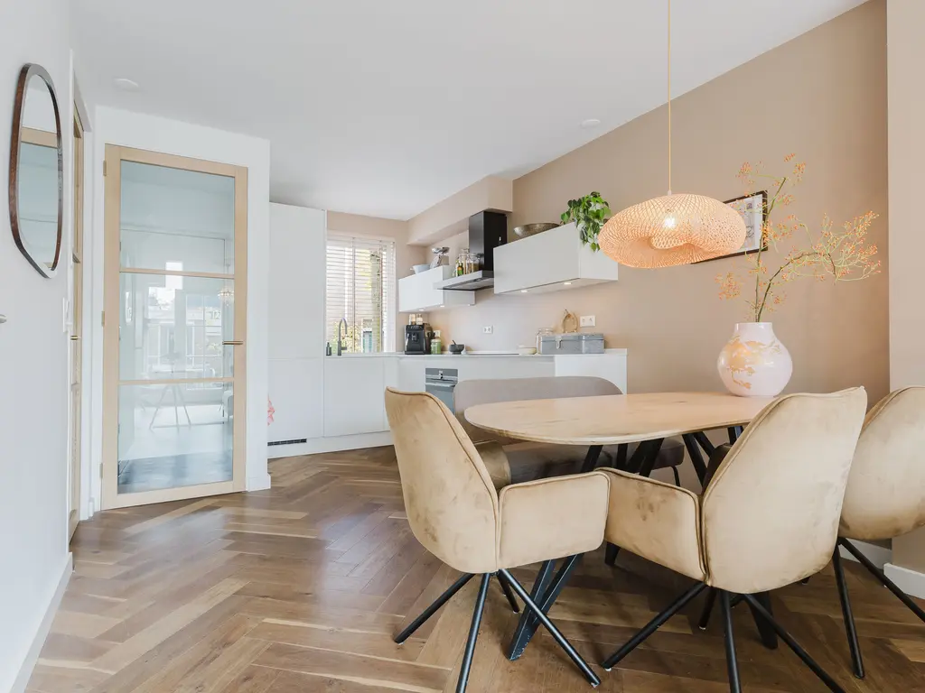 De woonkamer is licht en ruim, dankzij de vernieuwde achterpui met openslaande deuren naar de tuin. Hier geniet je van een fijne zithoek en een royale eethoek met ruimte voor lange avonden tafelen.