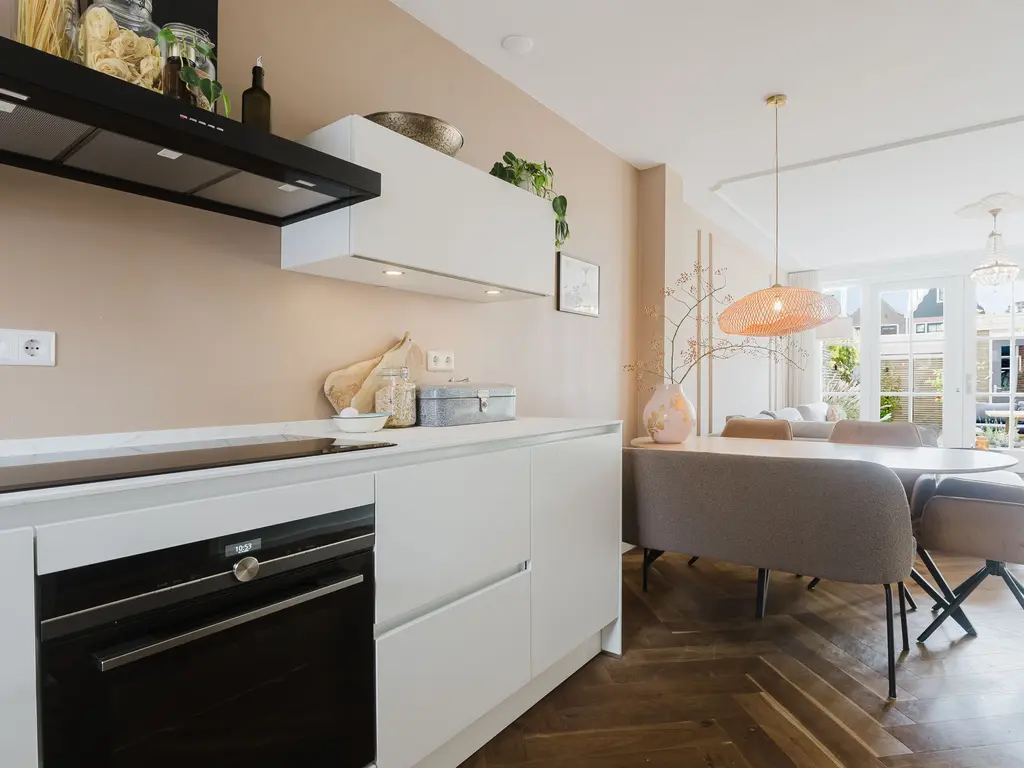 De open keuken (vernieuwd in 2021) is een echte eyecatcher: strak wit met een warme accentmuur, uitgerust met o.a. een Quooker, inductiekookplaat, vaatwasser, koel-vriescombinatie, afzuigkap en oven. Alles wat je nodig hebt om met plezier te koken!