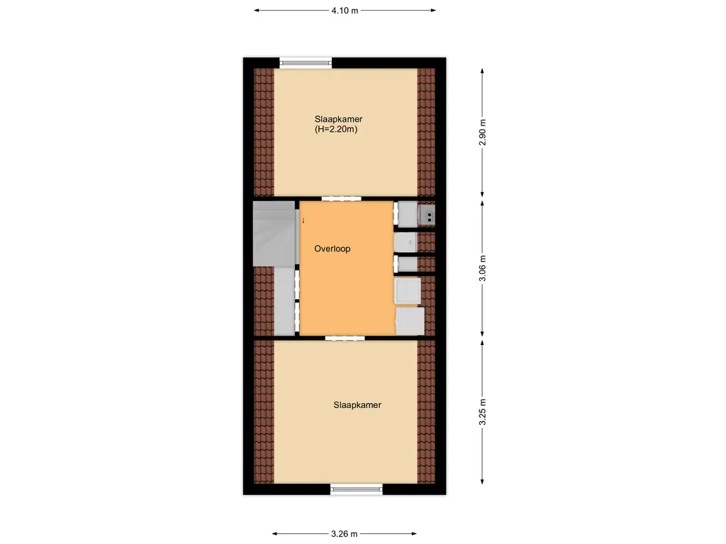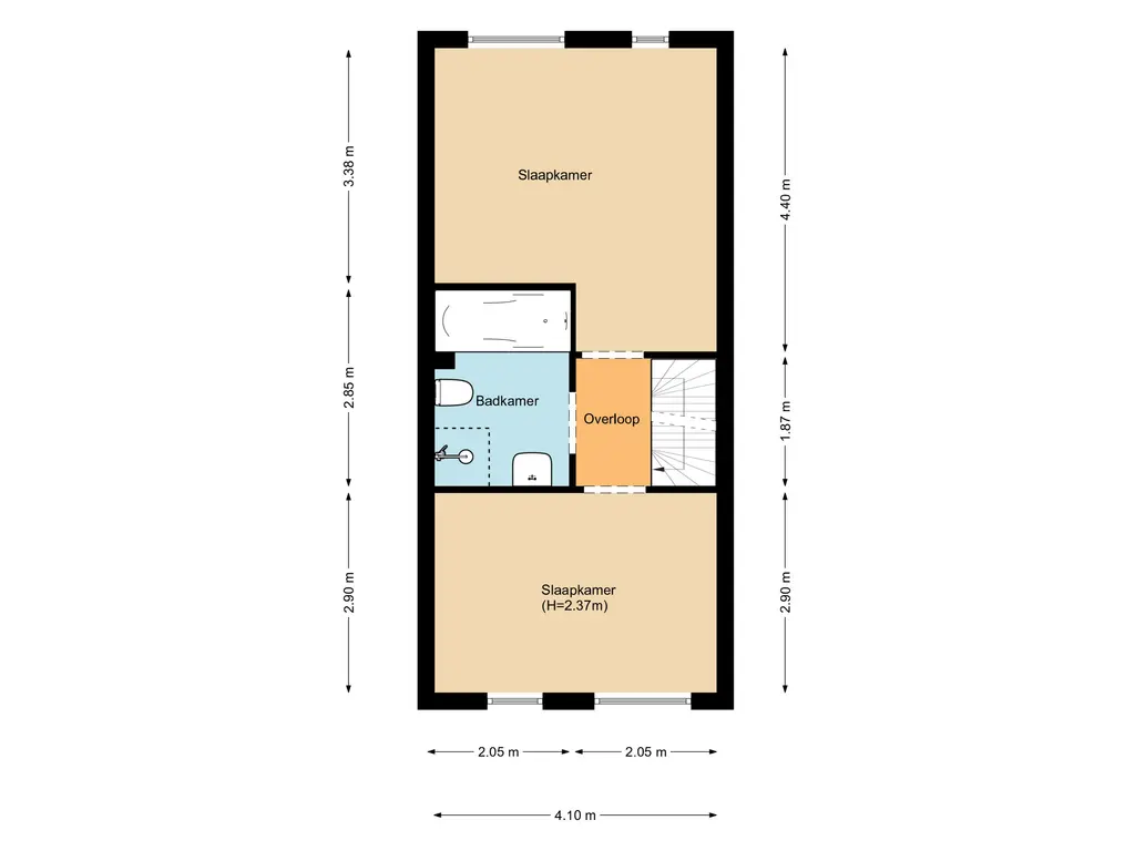 De overloop geeft toegang tot twee ruime slaapkamers — één aan de voorzijde en één aan de achterzijde, beide over de volledige breedte van de woning. De badkamer, vernieuwd in 2020, straalt hotelallure uit: volledig betegeld, met een inloopdouche, ligbad, hangtoilet, wastafelmeubel en vloerverwarming.