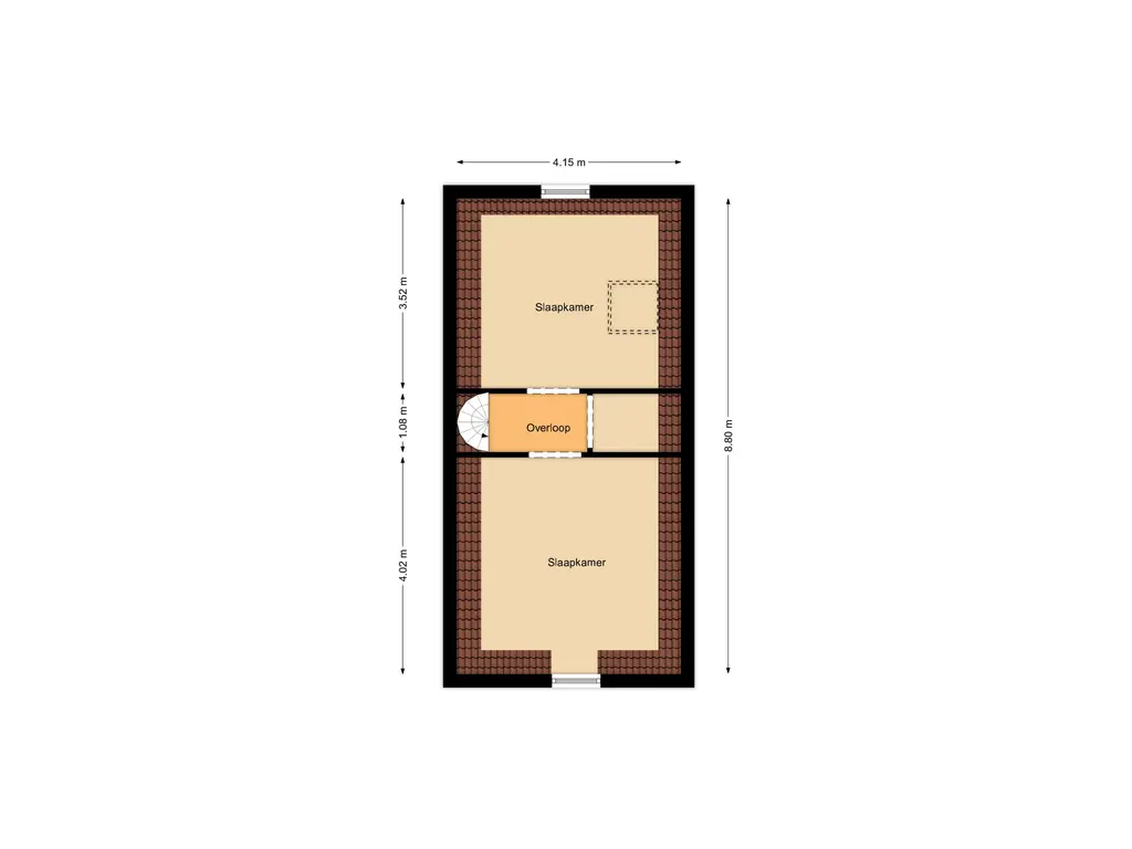 Op de eerste verdieping bevindt zich een ruime overloop die toegang biedt tot het zonnige dakterras. Hier vindt u ook de badkamer voorzien van bad, wastafel en een raam dat voor natuurlijk licht zorgt. De royale slaapkamer op deze verdieping beslaat de volledige breedte van het huis en is voorzien van een ruime inloopkast.