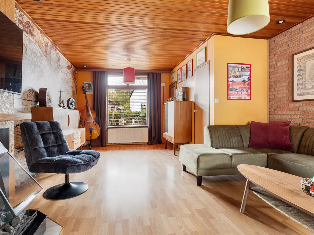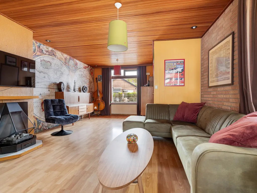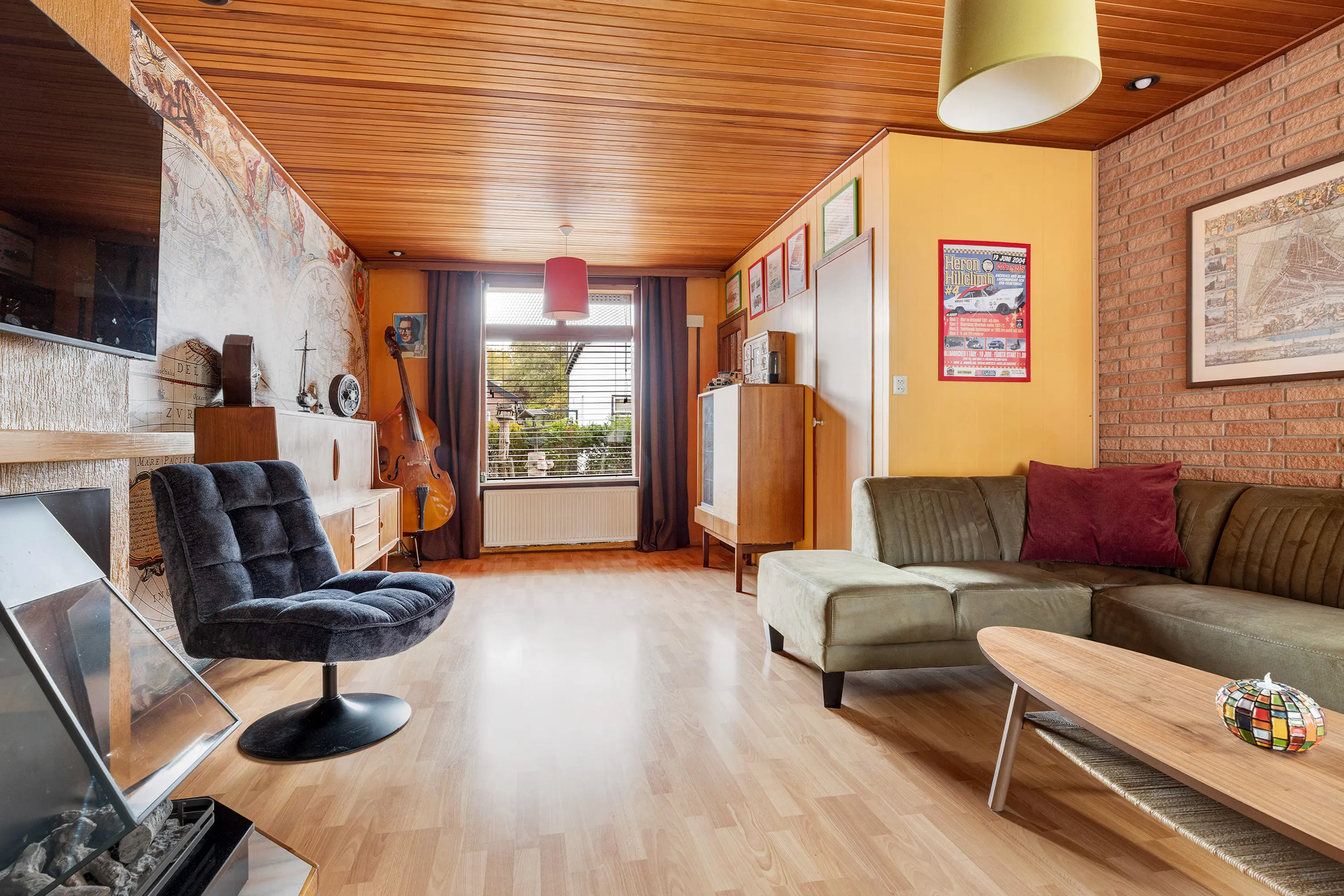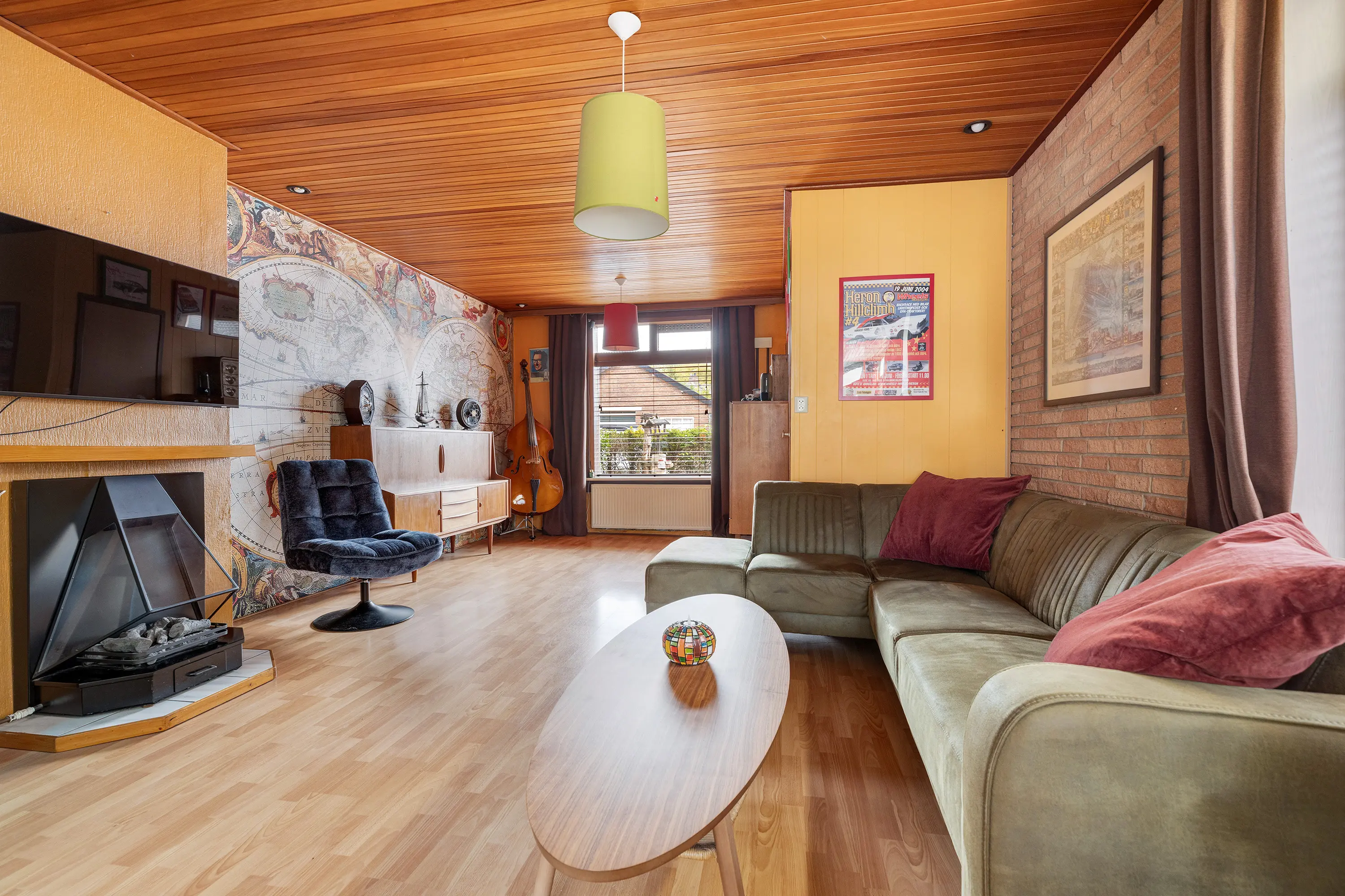 Via de entree komt u binnen in de hal met trapopgang naar de eerste verdieping. De gezellige woonkamer (ca. 26 m²) heeft een warme uitstraling dankzij de laminaatvloer en de sfeervolle gashaard. De grote ramen zorgen voor veel lichtinval en bieden een prettig uitzicht op de omgeving.
