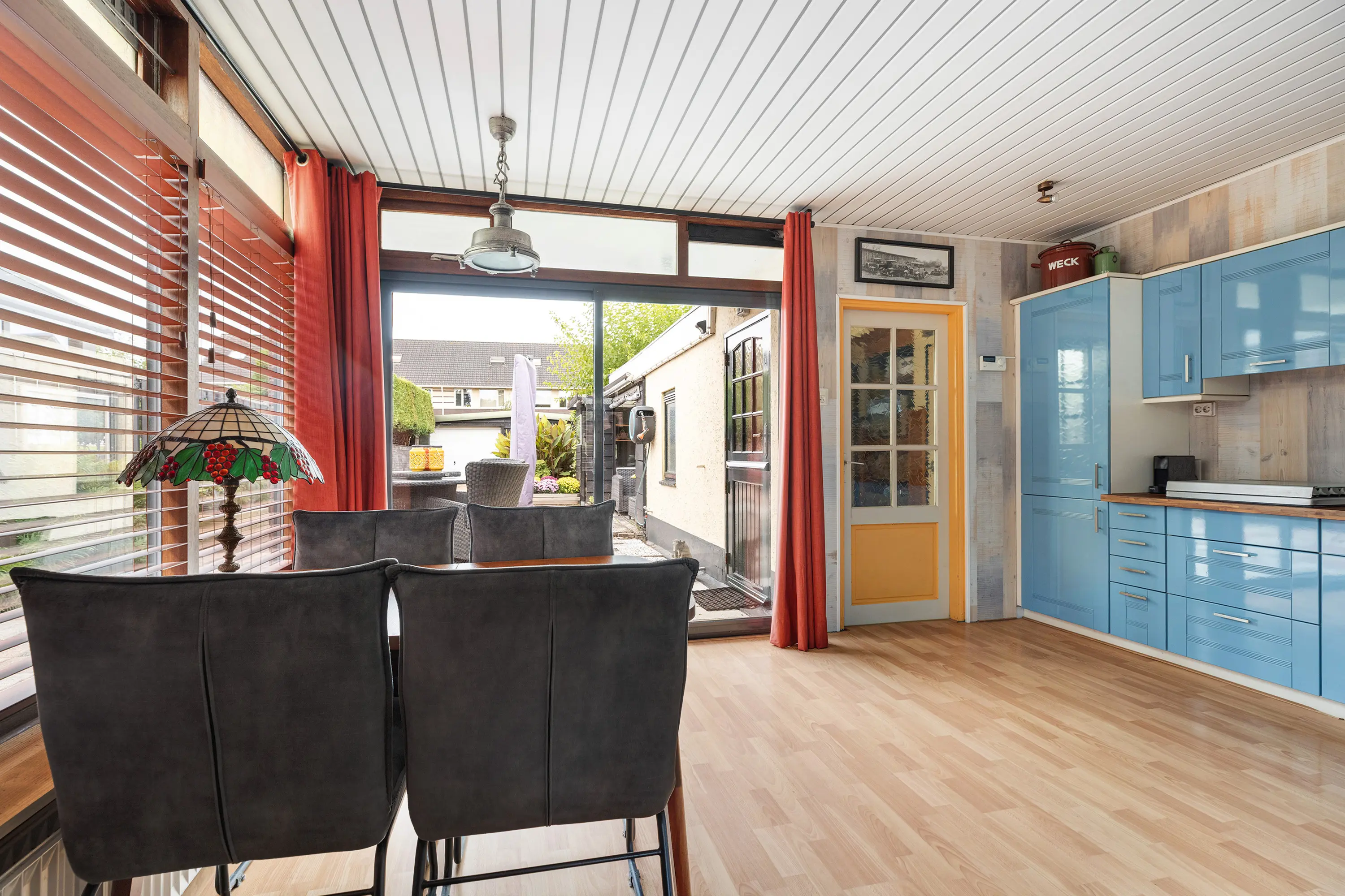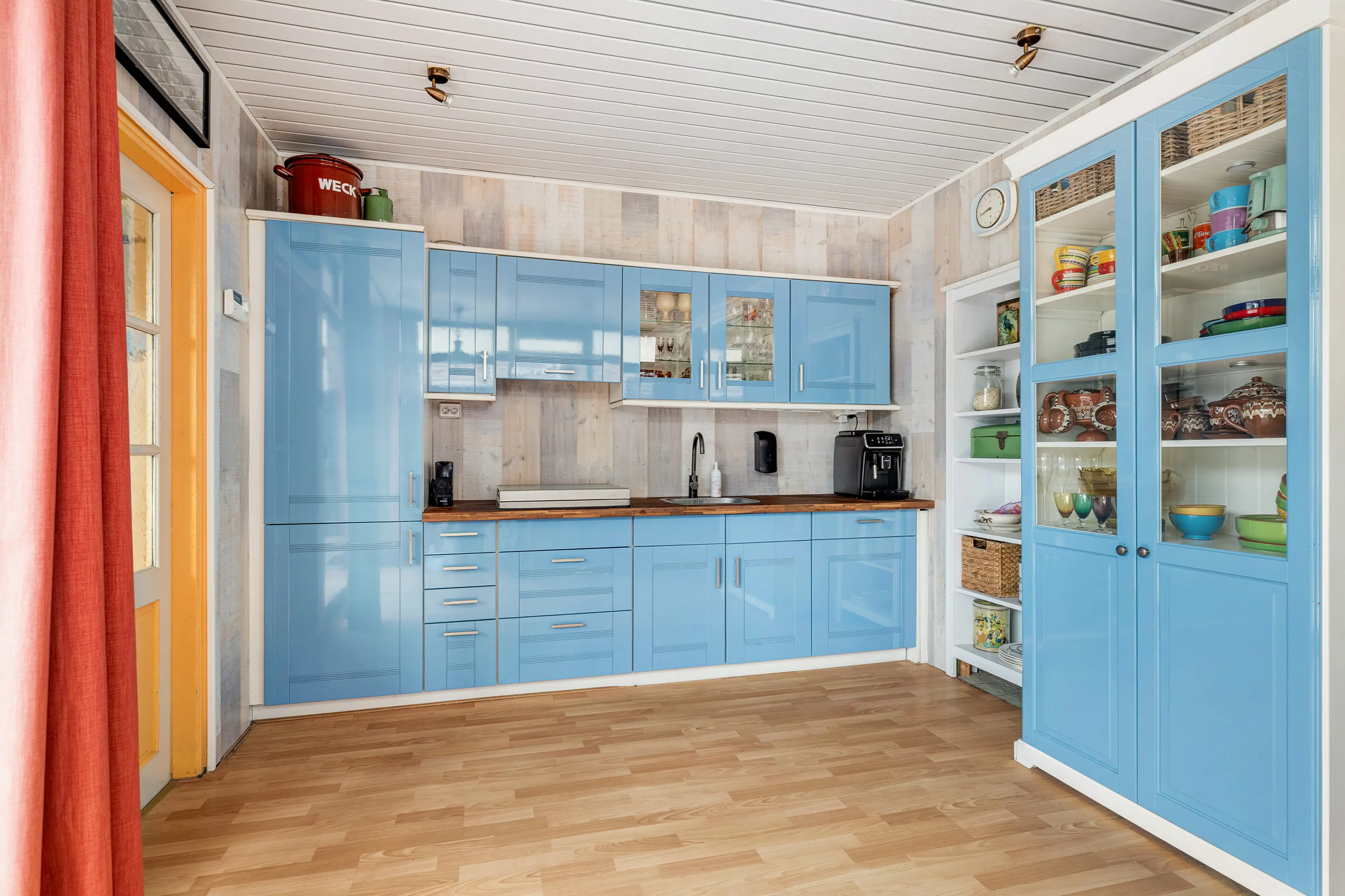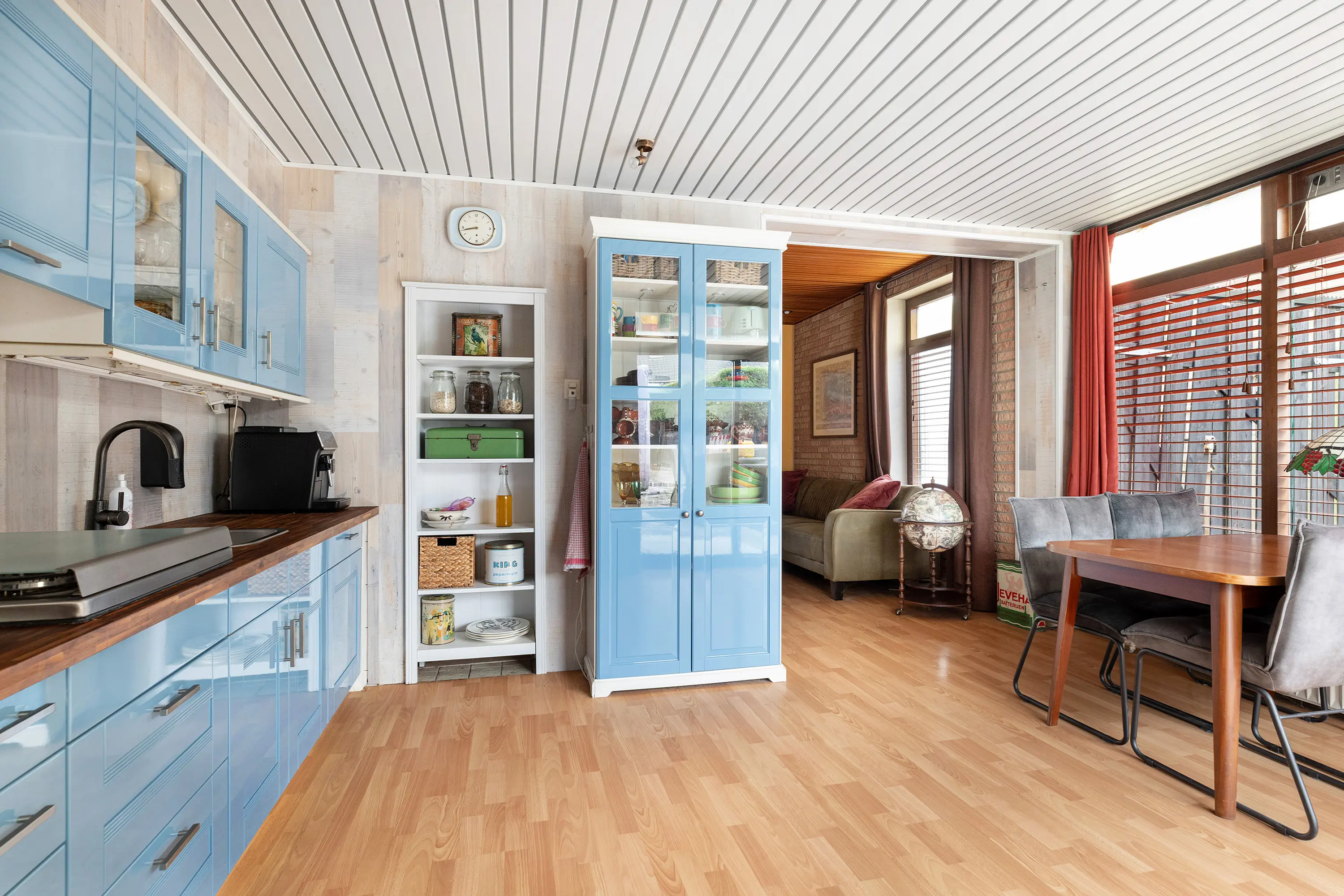 Aan de achterzijde bevindt zich de ruime woonkeuken (ca. 14 m²) met voldoende plek voor een grote eettafel. De keuken is uitgevoerd in een rechte opstelling en voorzien van diverse inbouwapparatuur, waaronder een koel-/vriescombinatie, 4-pits gaskookplaat, geïntegreerde afzuigkap en vaatwasser. De vele raampartijen zorgen voor een lichte, open sfeer met prachtig zicht op de tuin.