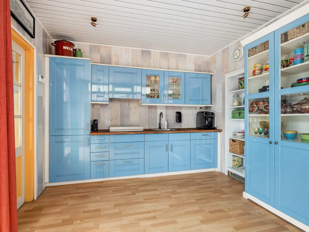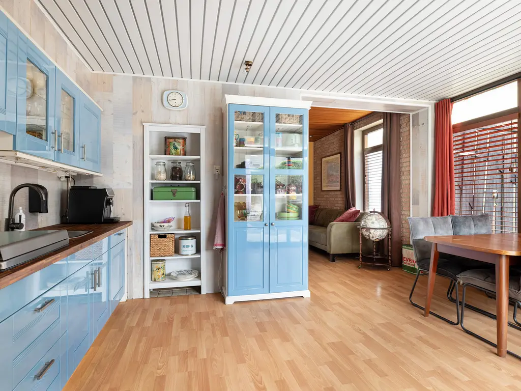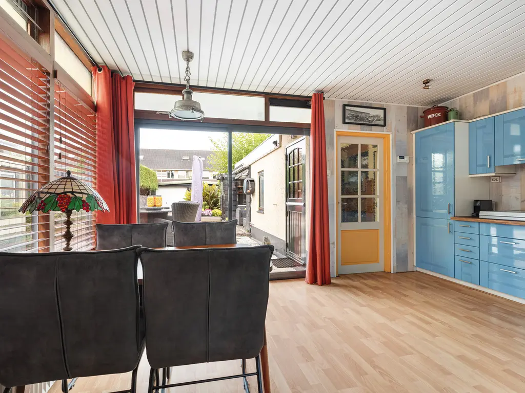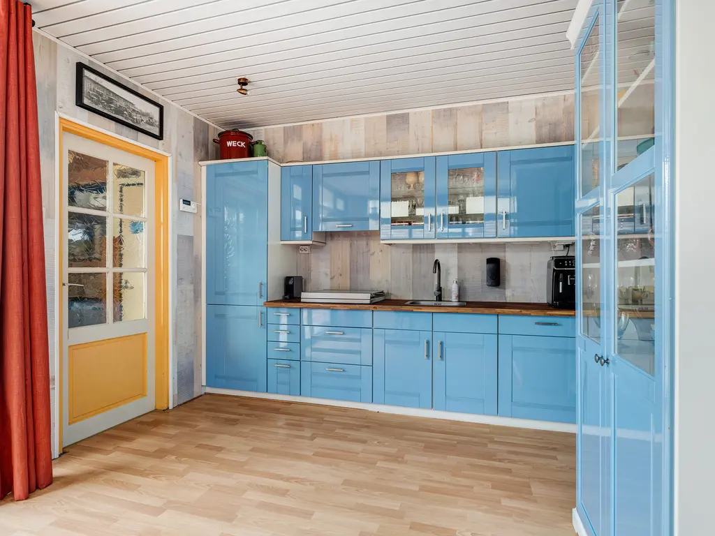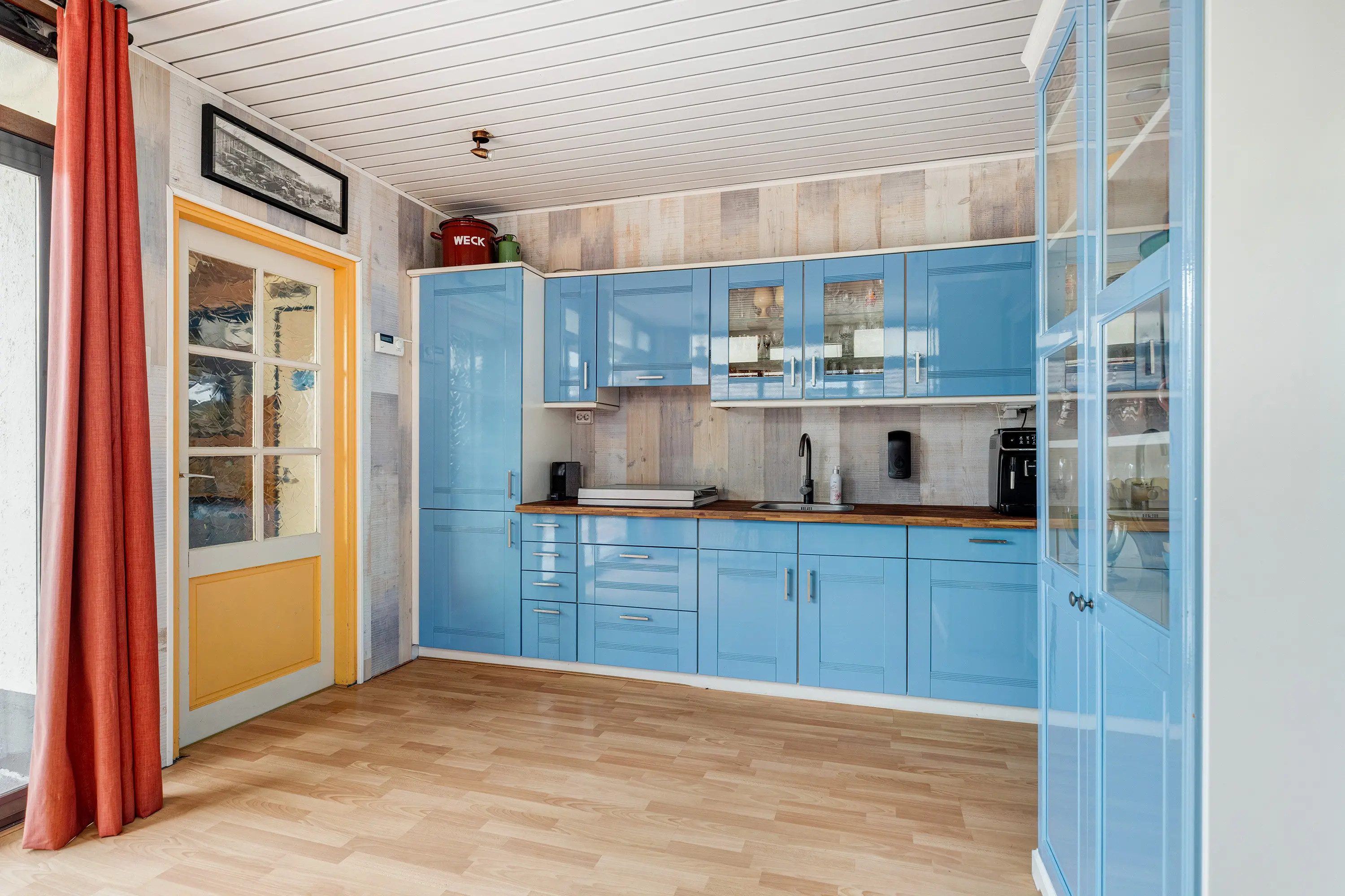 Aan de achterzijde bevindt zich de ruime woonkeuken (ca. 14 m²) met voldoende plek voor een grote eettafel. De keuken is uitgevoerd in een rechte opstelling en voorzien van diverse inbouwapparatuur, waaronder een koel-/vriescombinatie, 4-pits gaskookplaat, geïntegreerde afzuigkap en vaatwasser. De vele raampartijen zorgen voor een lichte, open sfeer met prachtig zicht op de tuin.