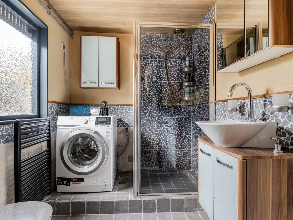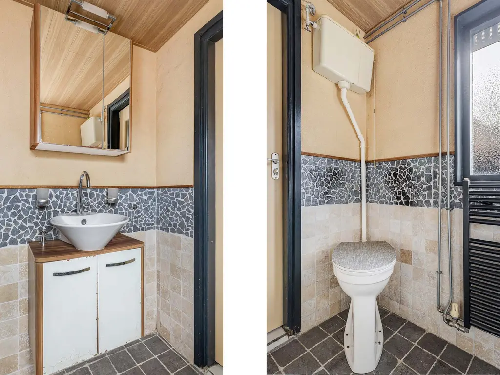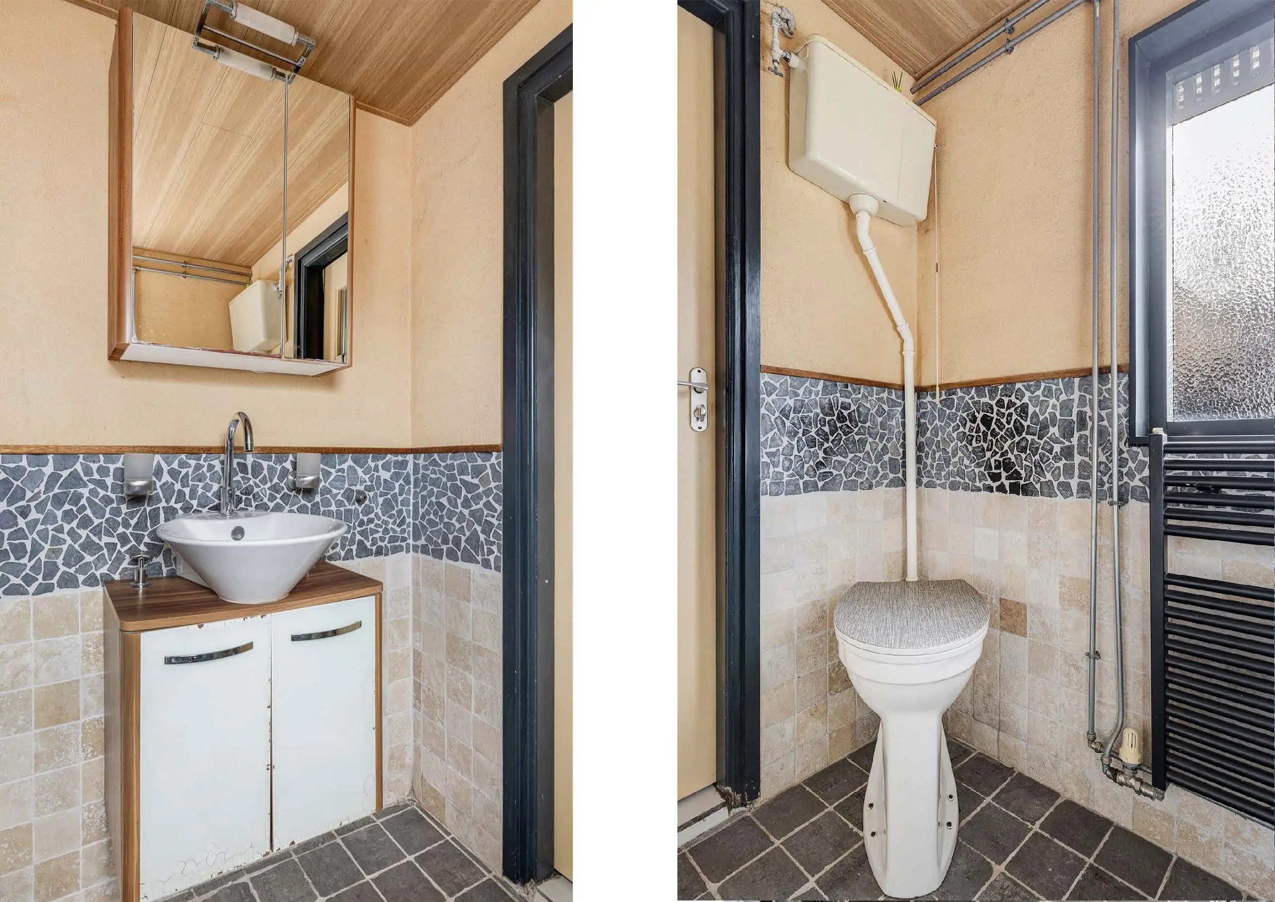 Vanuit de tussenhal heeft u toegang tot de badkamer (ca. 4 m²), voorzien van een douchecabine, duoblok toilet, wastafelmeubel met spiegelkast en aansluiting voor de wasmachine. In de tussenhal bevindt zich ook de kast met de CV-opstelling.