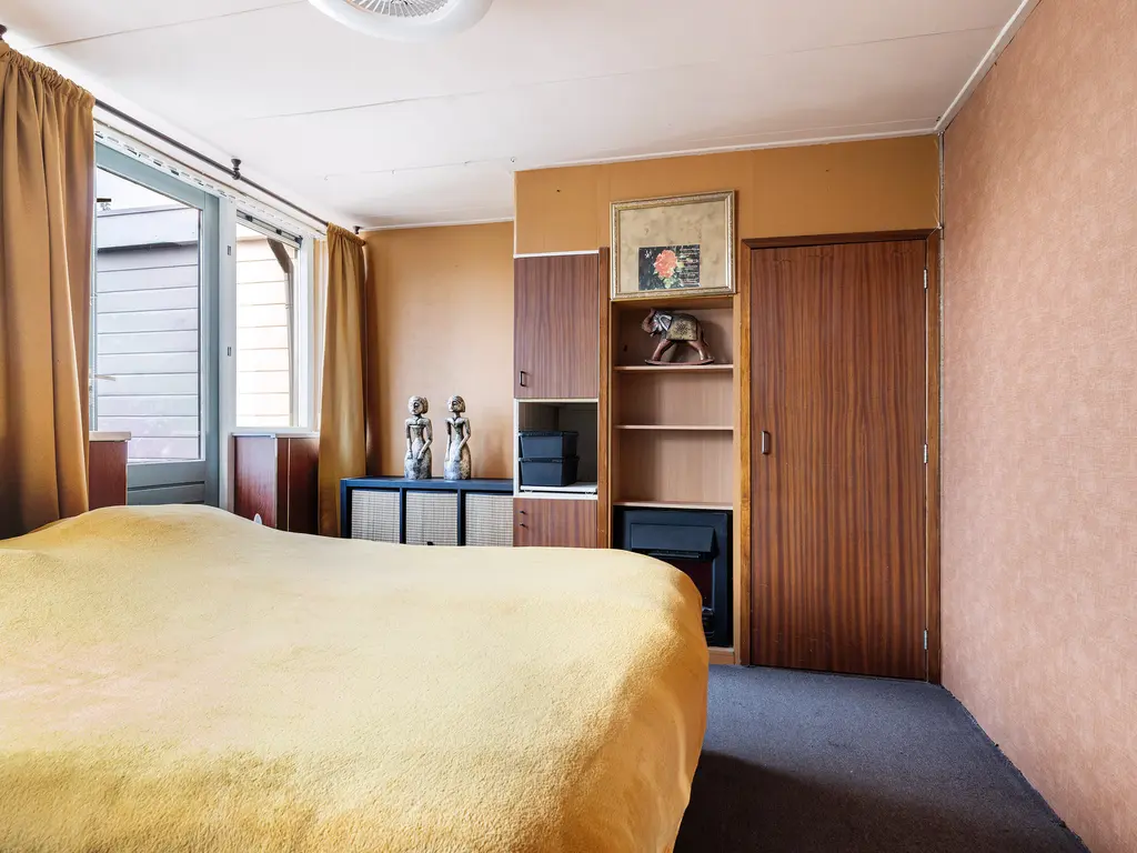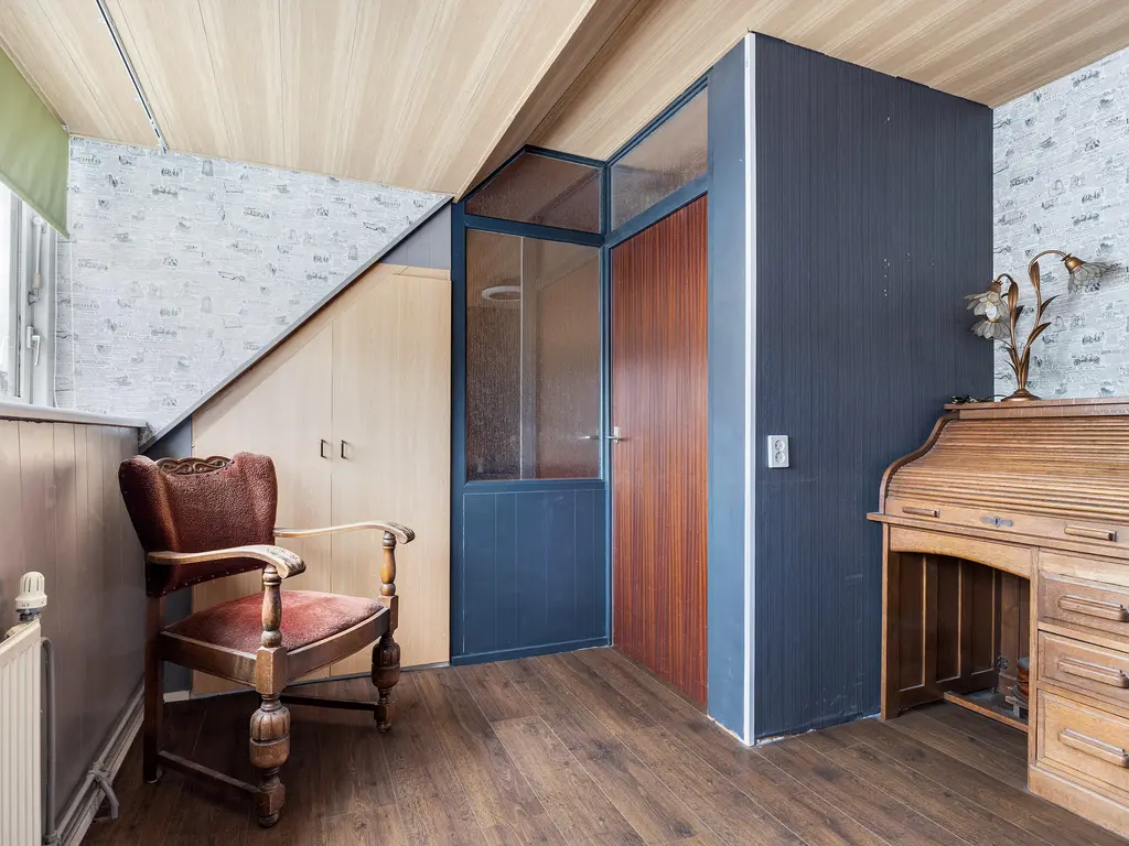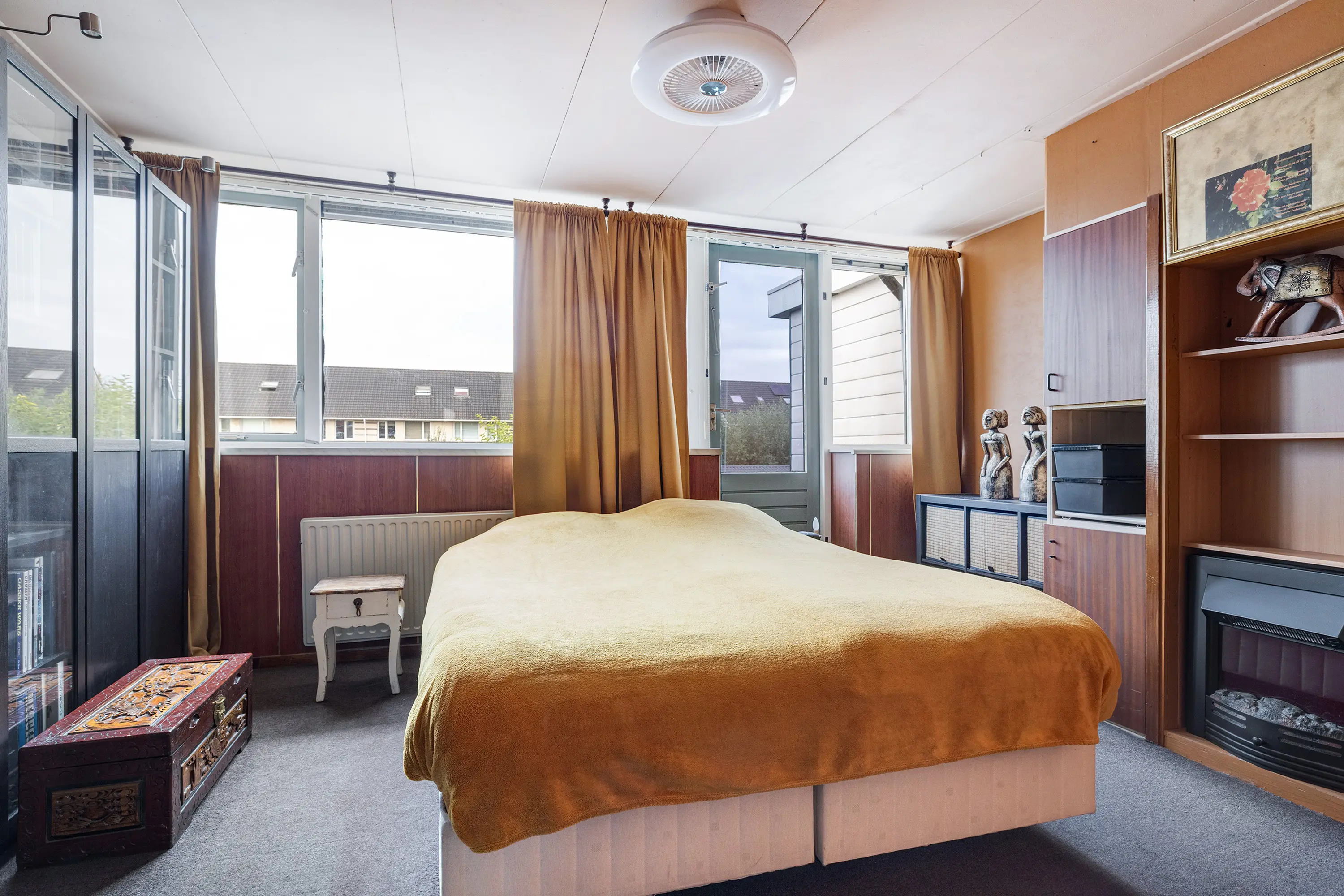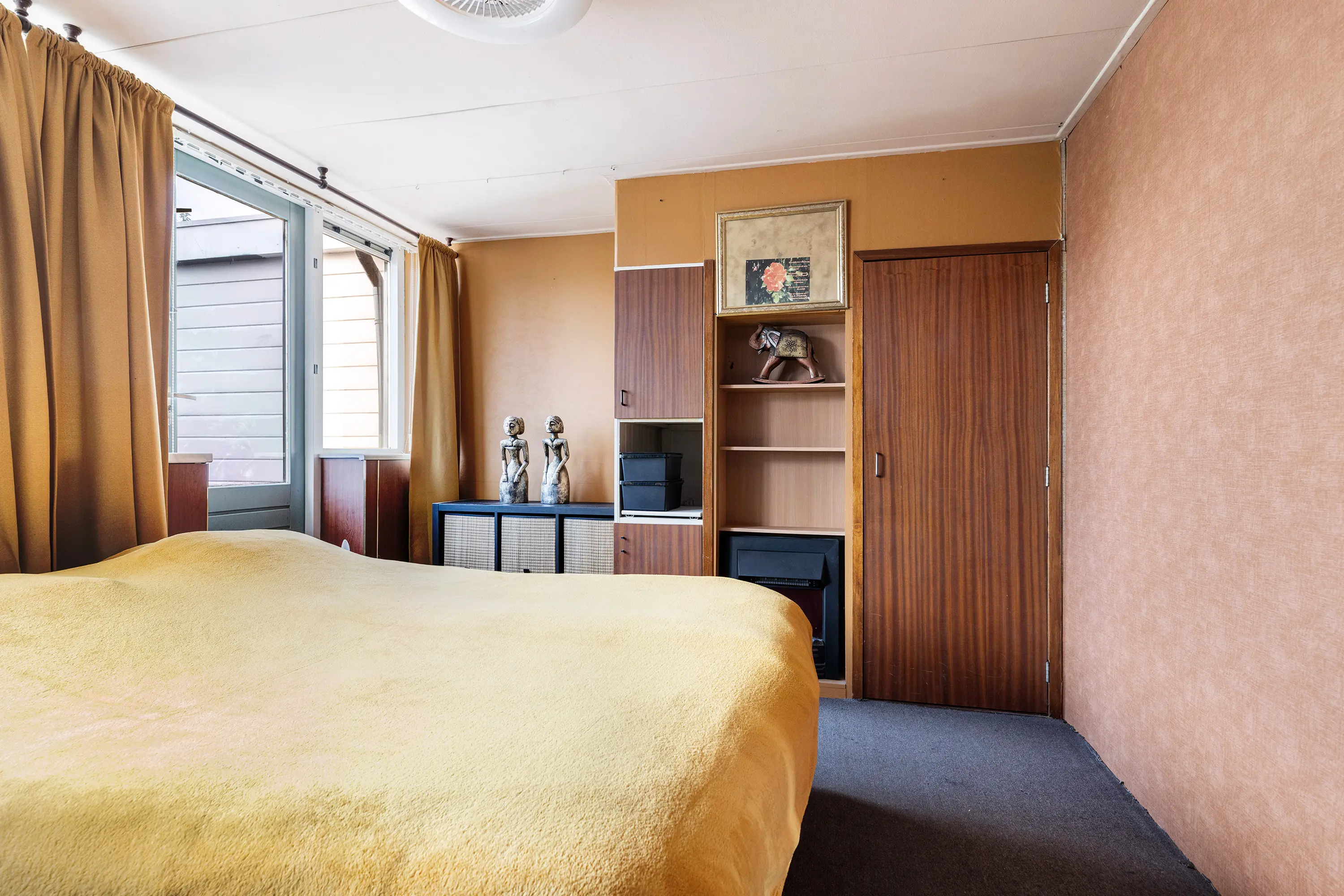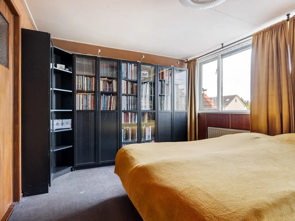 Slaapkamer 2 (ca. 15 m²) bevindt zich aan de achterzijde, eveneens met een dakkapel, inbouwkast en toegang tot het platte dak.