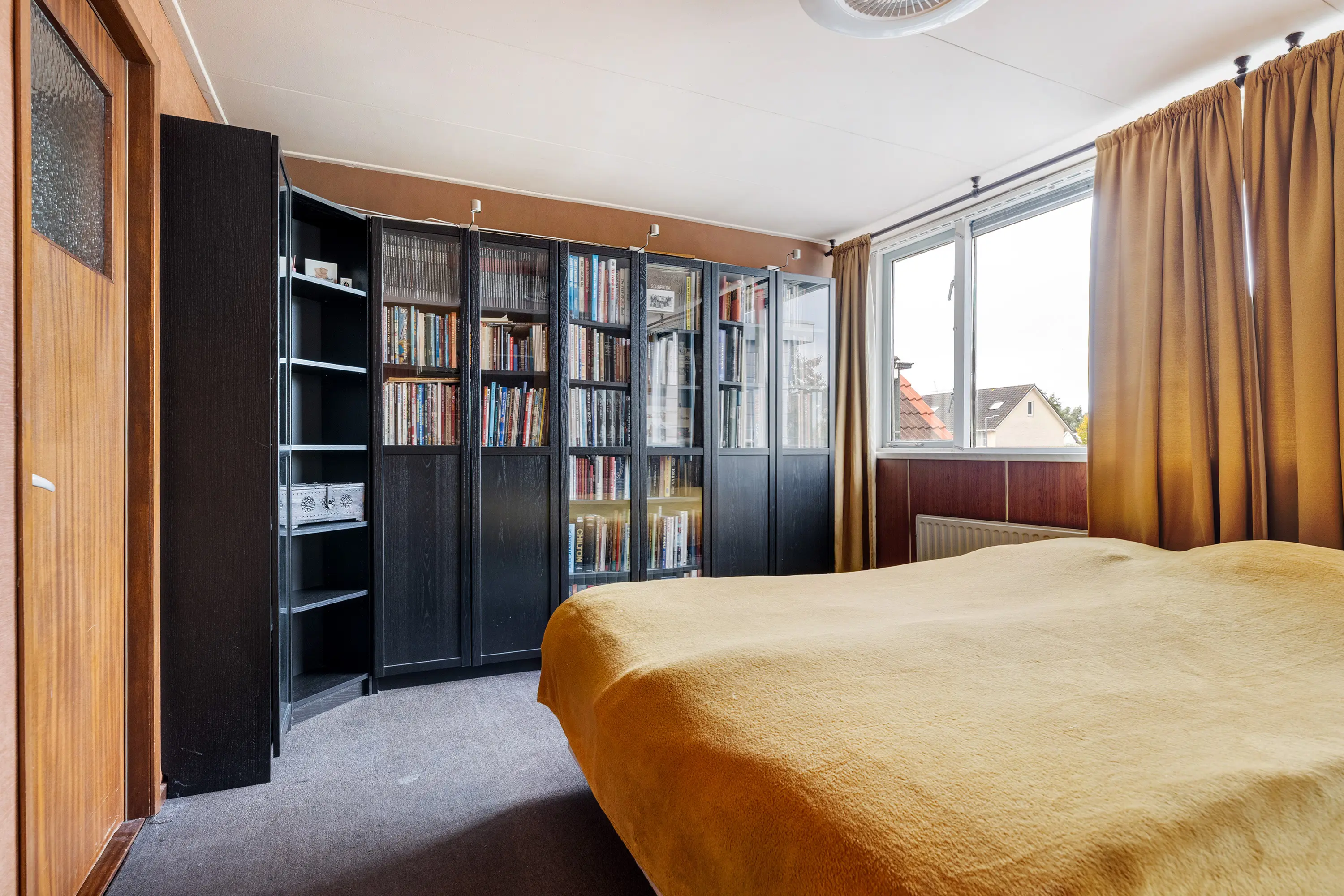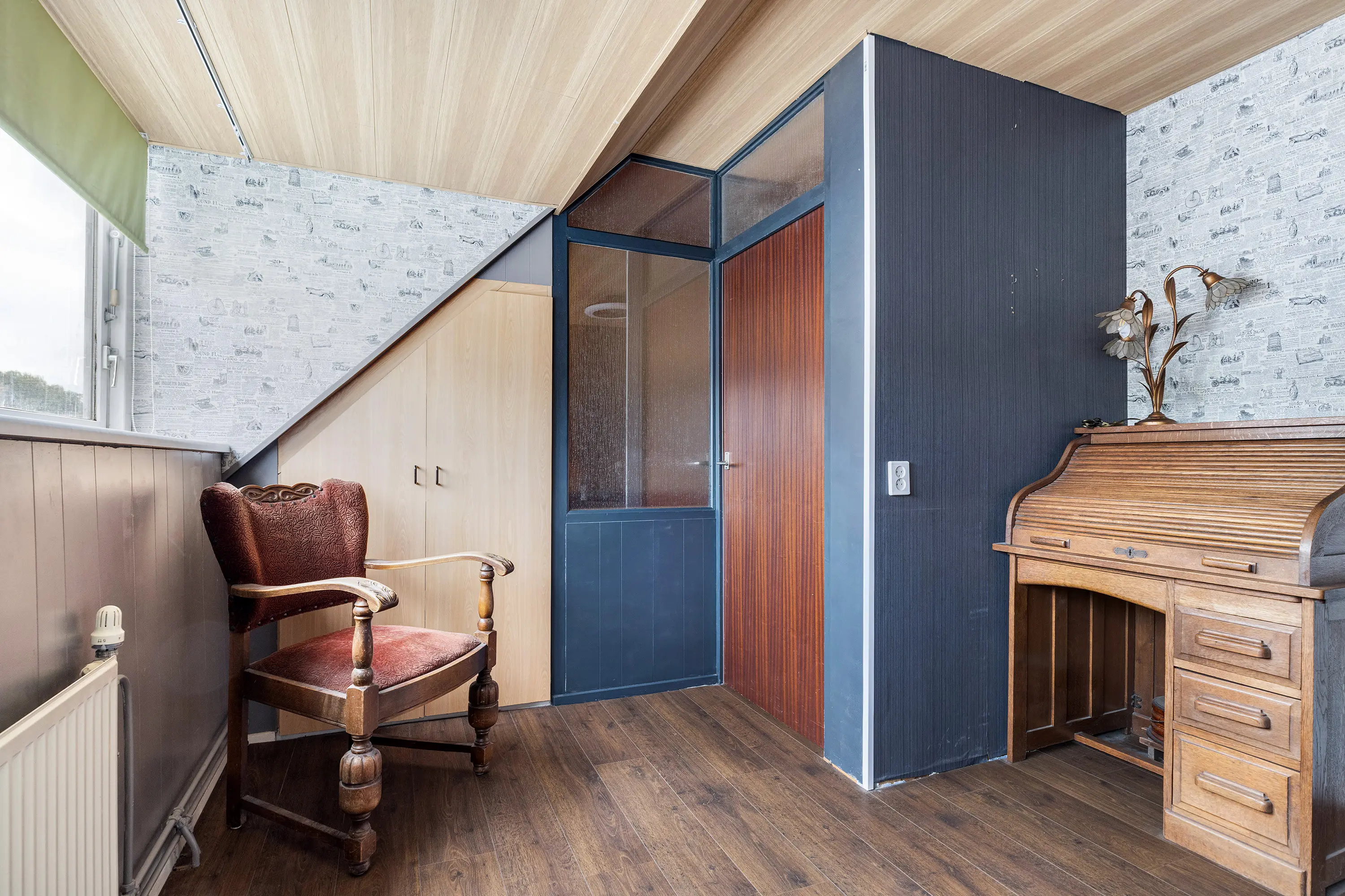 Slaapkamer 1 (ca. 10 m²) ligt aan de voorzijde, heeft een dakkapel, een vaste inbouwkast en is afgewerkt met een laminaatvloer.