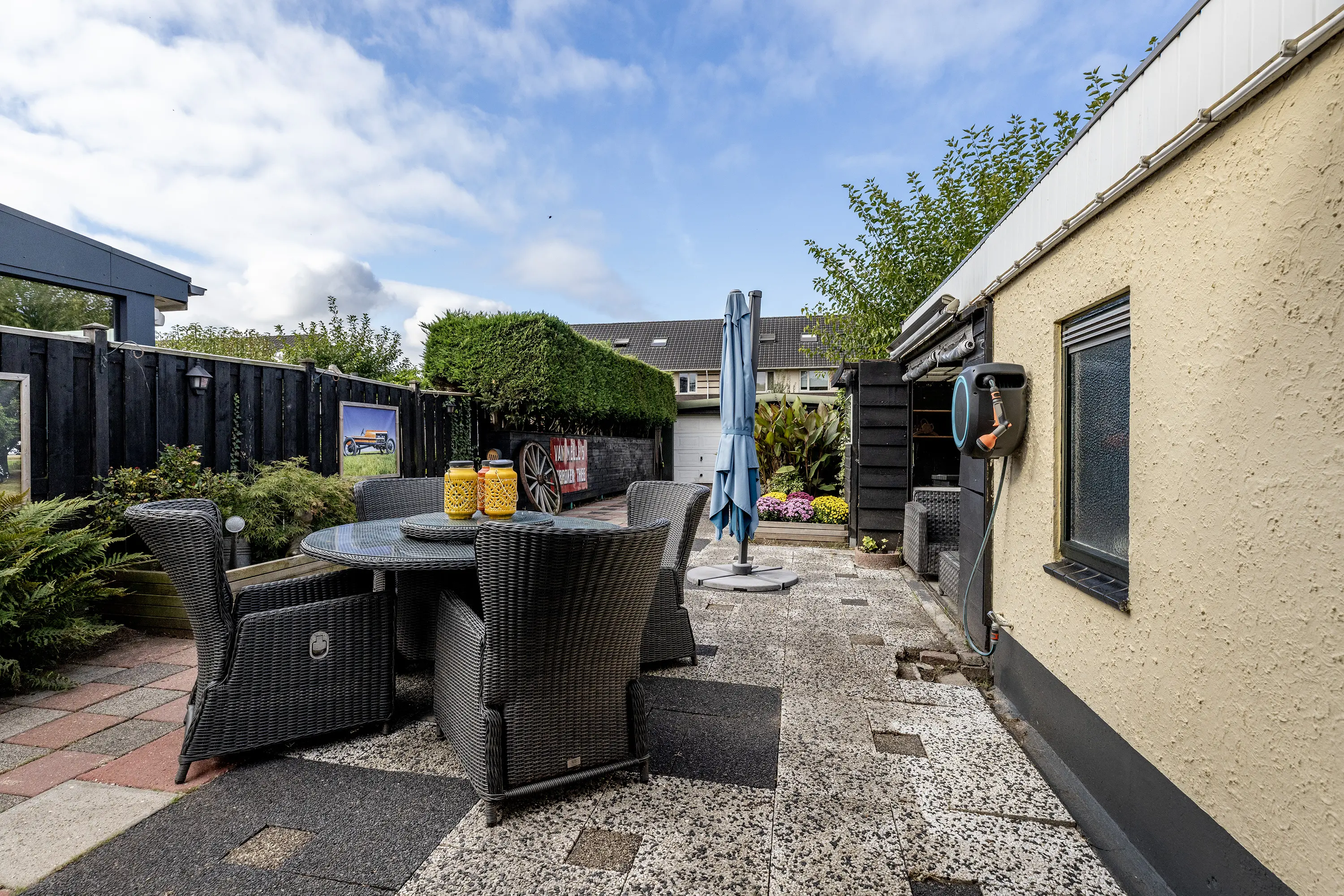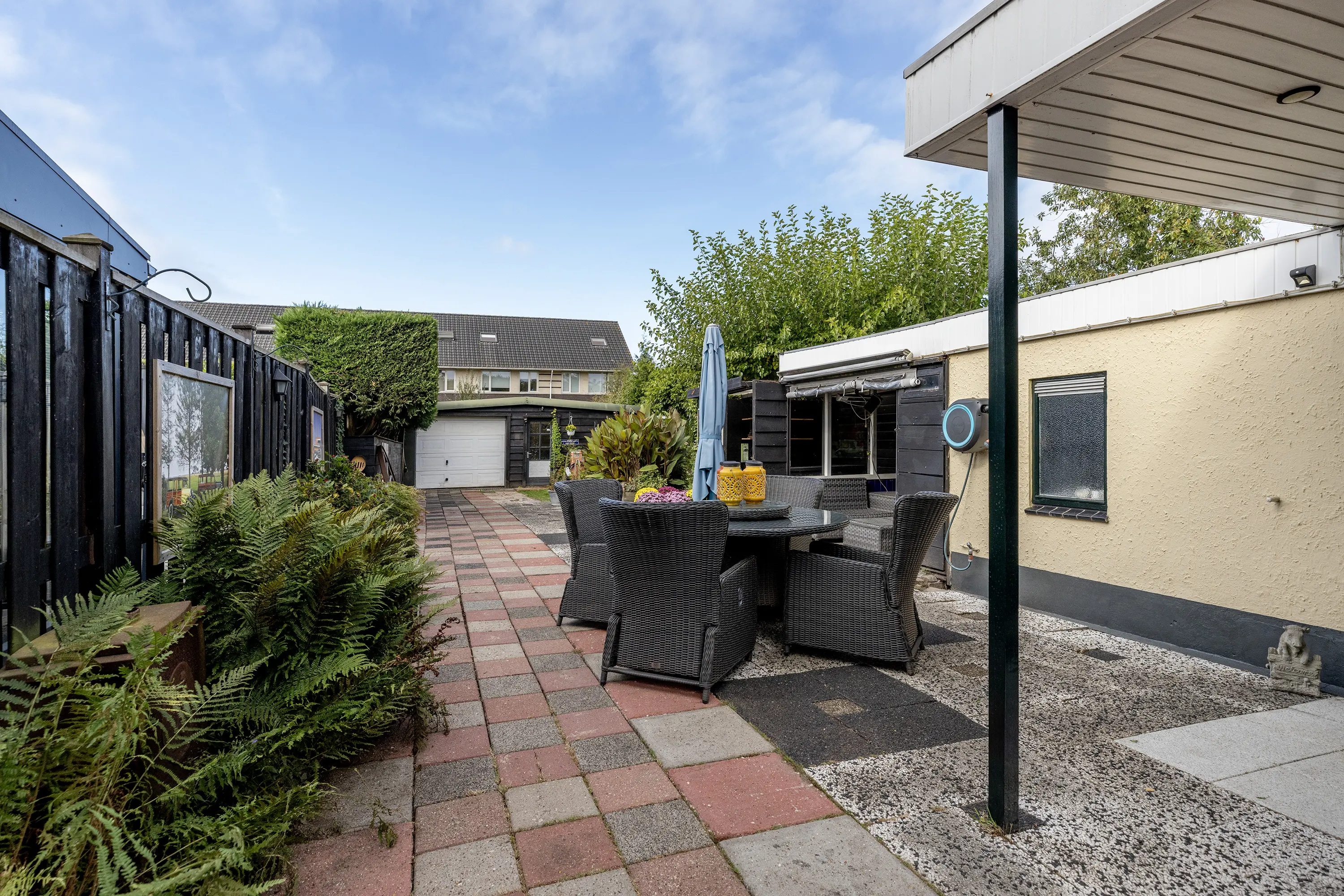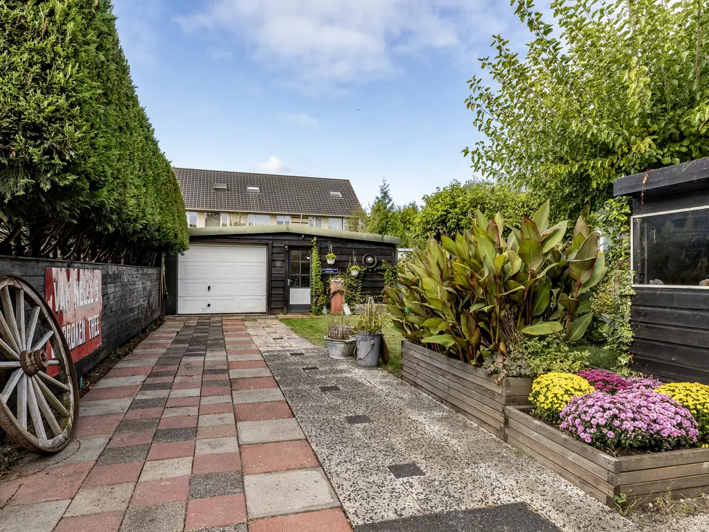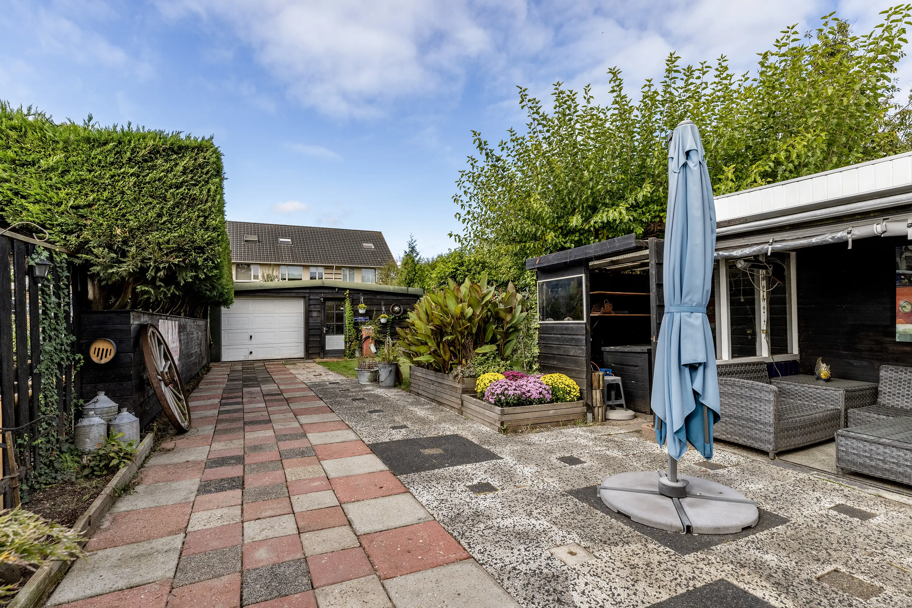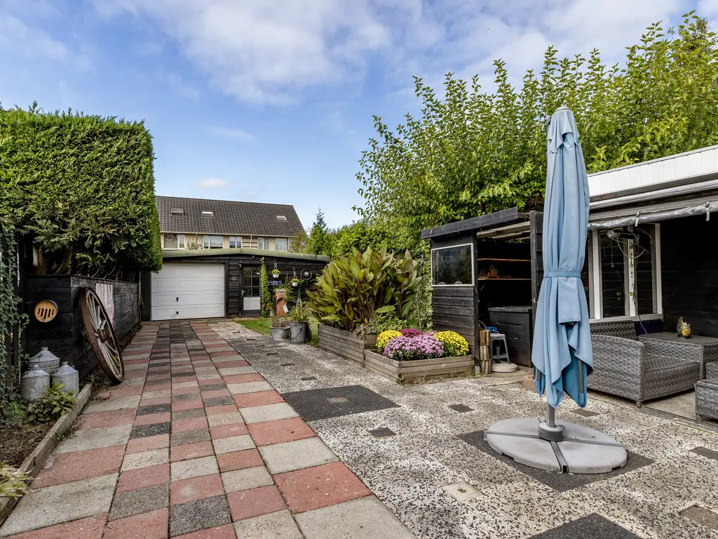 De achtertuin is opvallend diep en biedt volop privacy en mogelijkheden. U vindt er twee kleine overkappingen direct achter de woning – perfect voor extra bergruimte of een knus zitje. De rest van de tuin biedt ruimte voor speeltoestellen, een moestuin of meerdere terrassen.