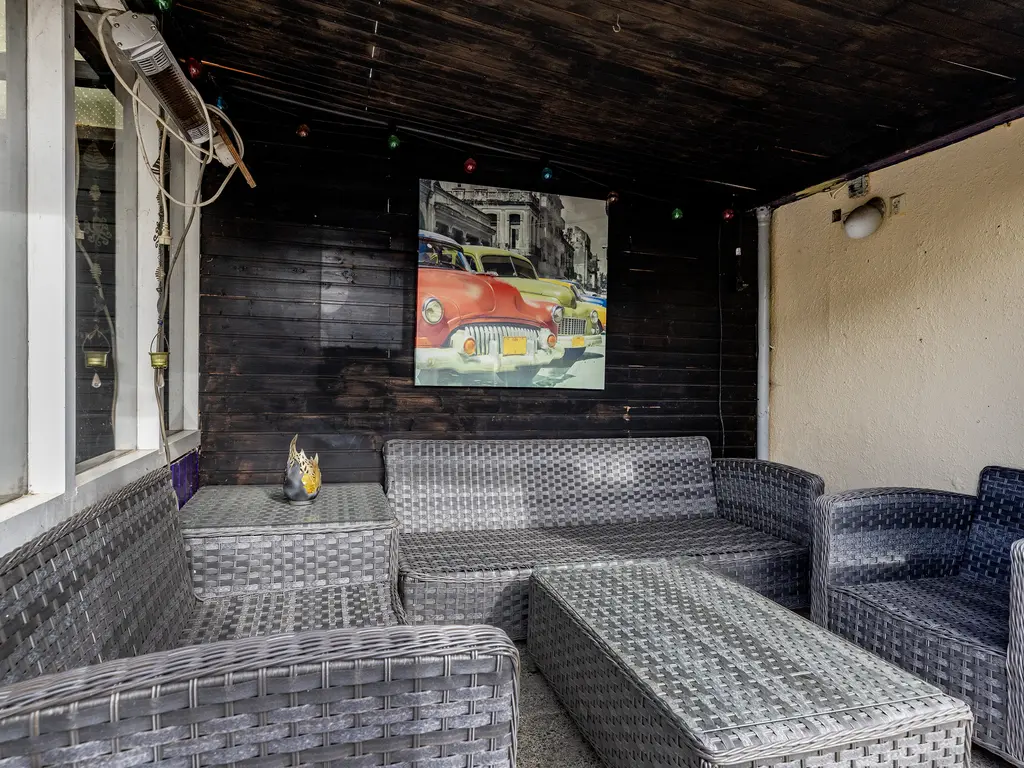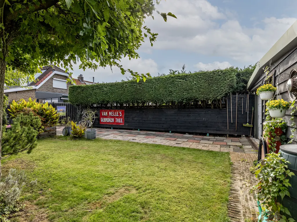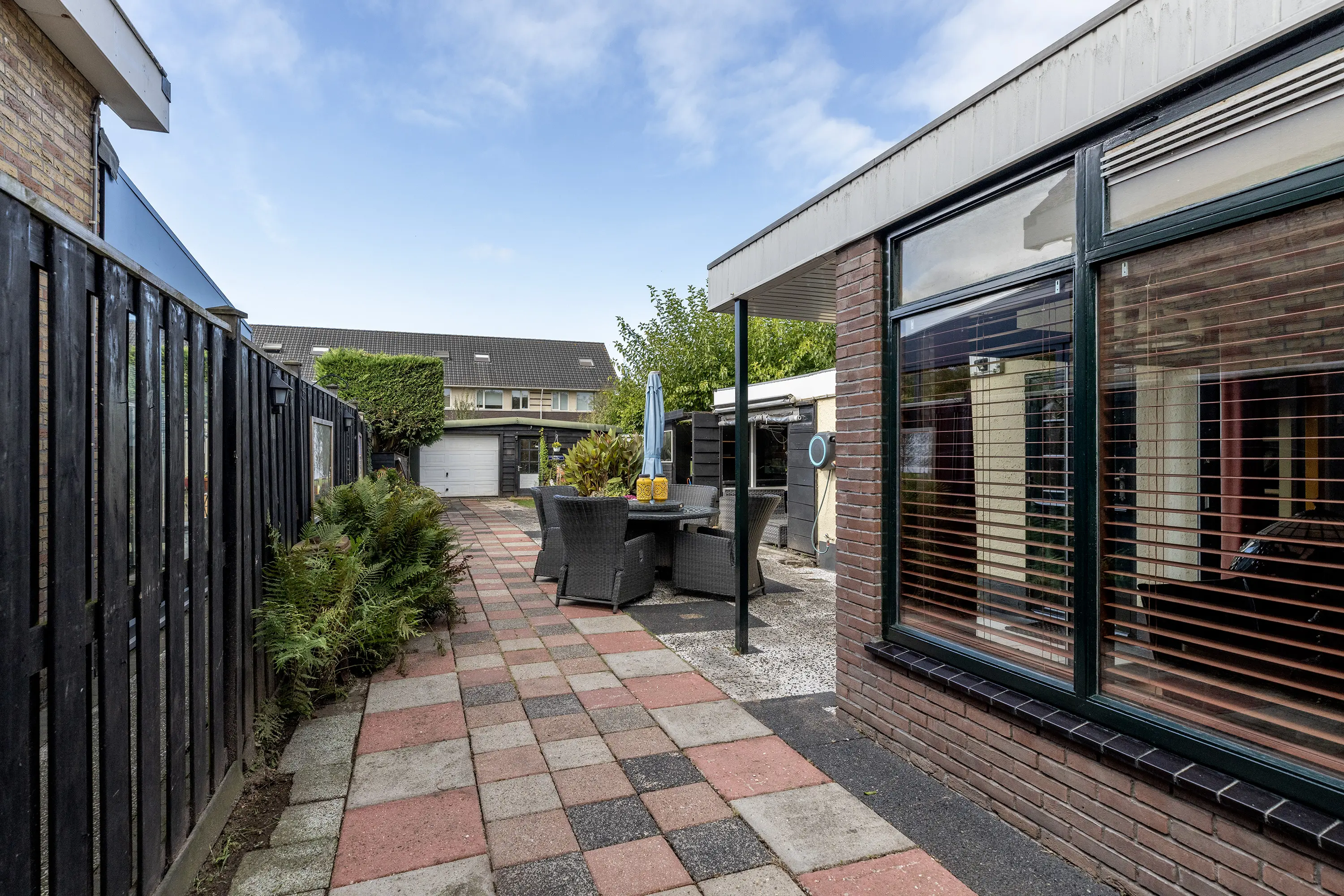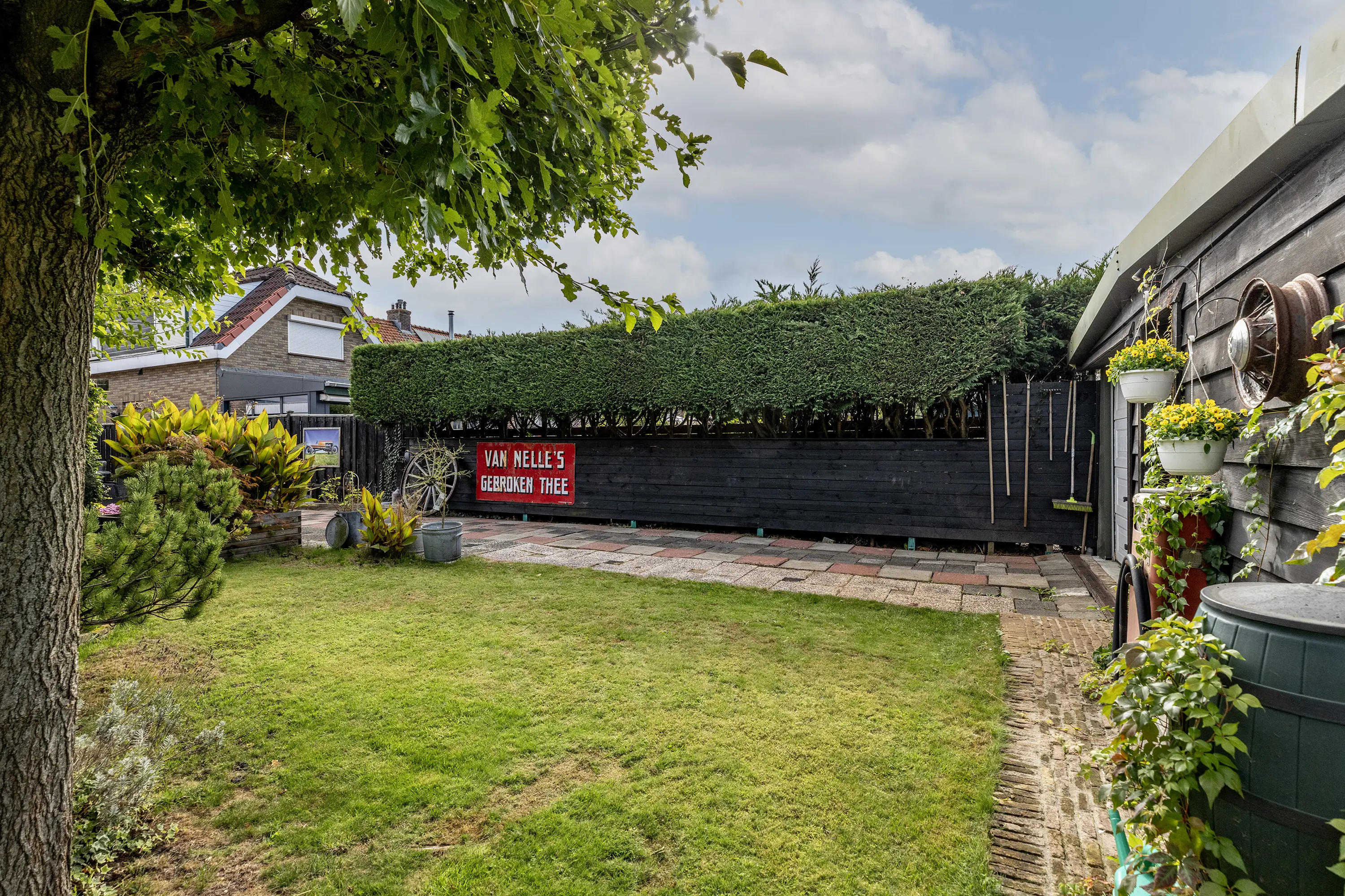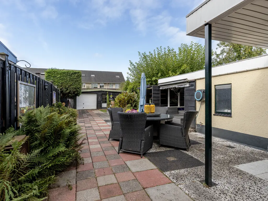 De achtertuin is opvallend diep en biedt volop privacy en mogelijkheden. U vindt er twee kleine overkappingen direct achter de woning – perfect voor extra bergruimte of een knus zitje. De rest van de tuin biedt ruimte voor speeltoestellen, een moestuin of meerdere terrassen.