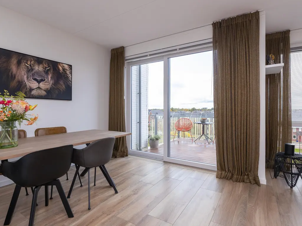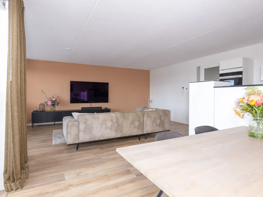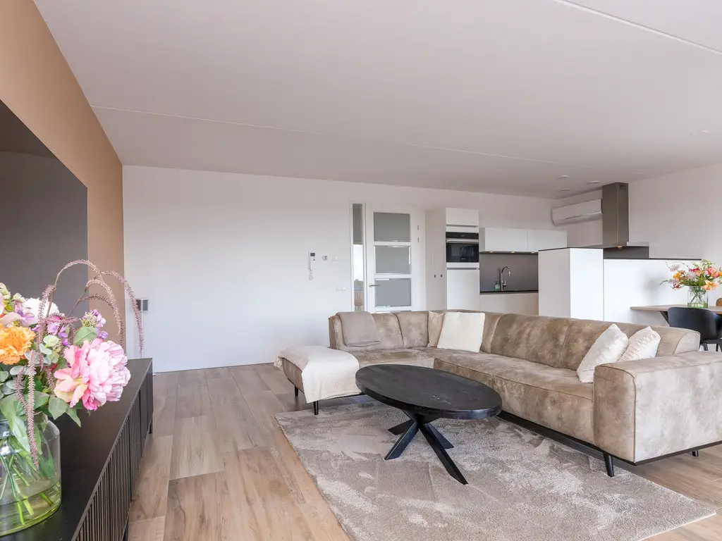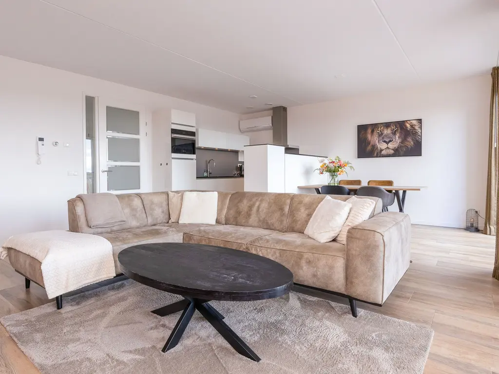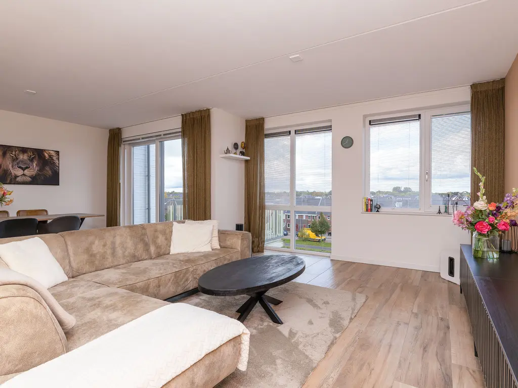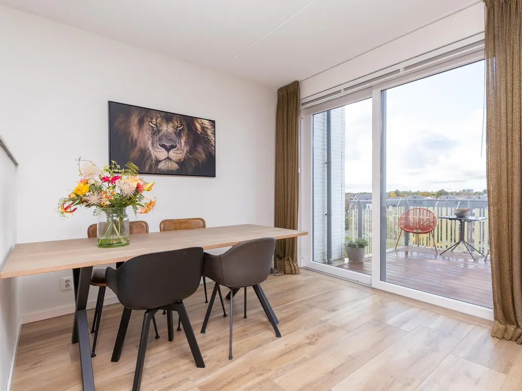 Geniet van de lichte woonkamer met directe toegang tot het ruime balkon op het zuidwesten: de ideale plek om te ontspannen met een goed glas wijn of een kop koffie in de middag- en avondzon.