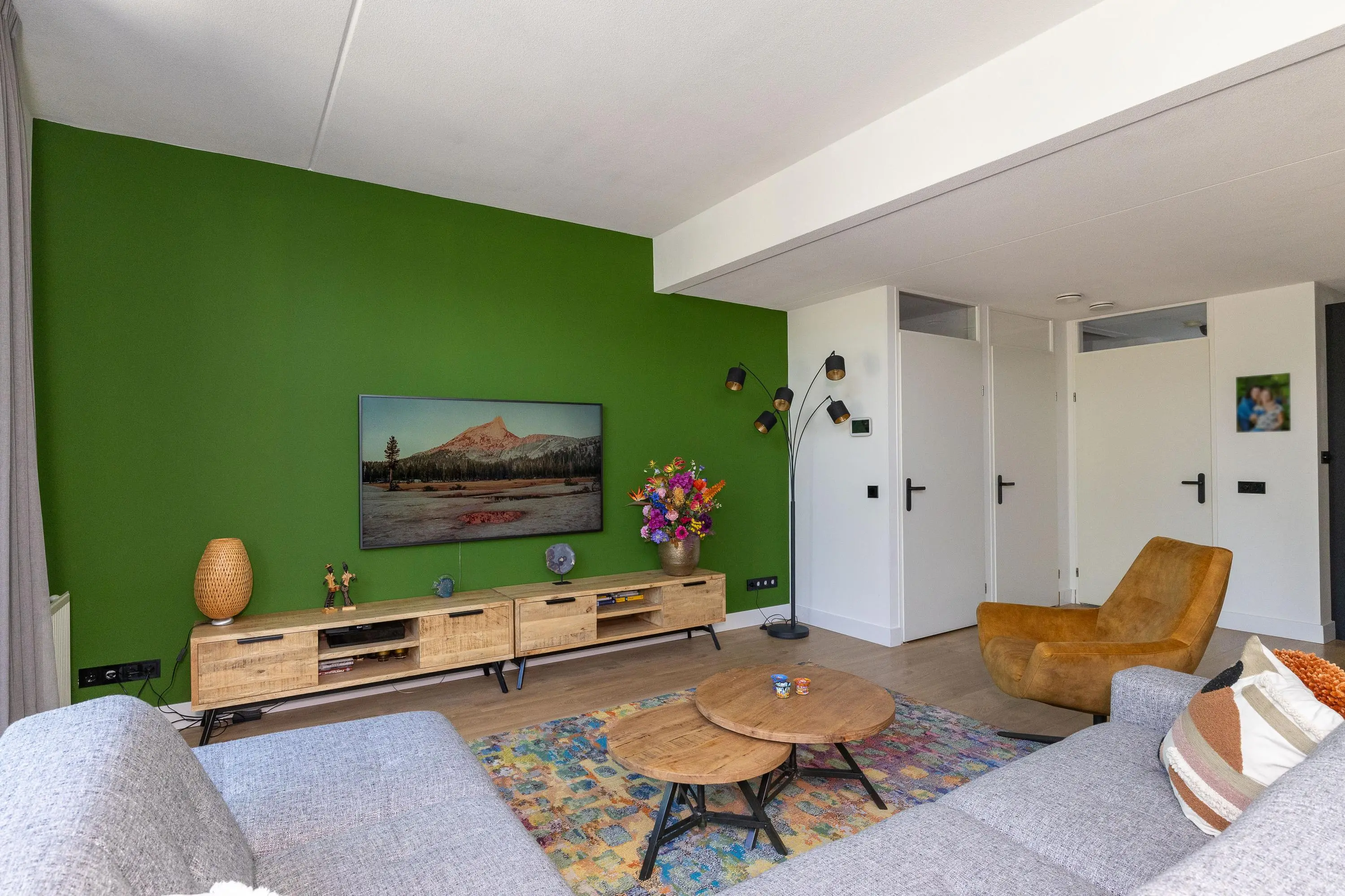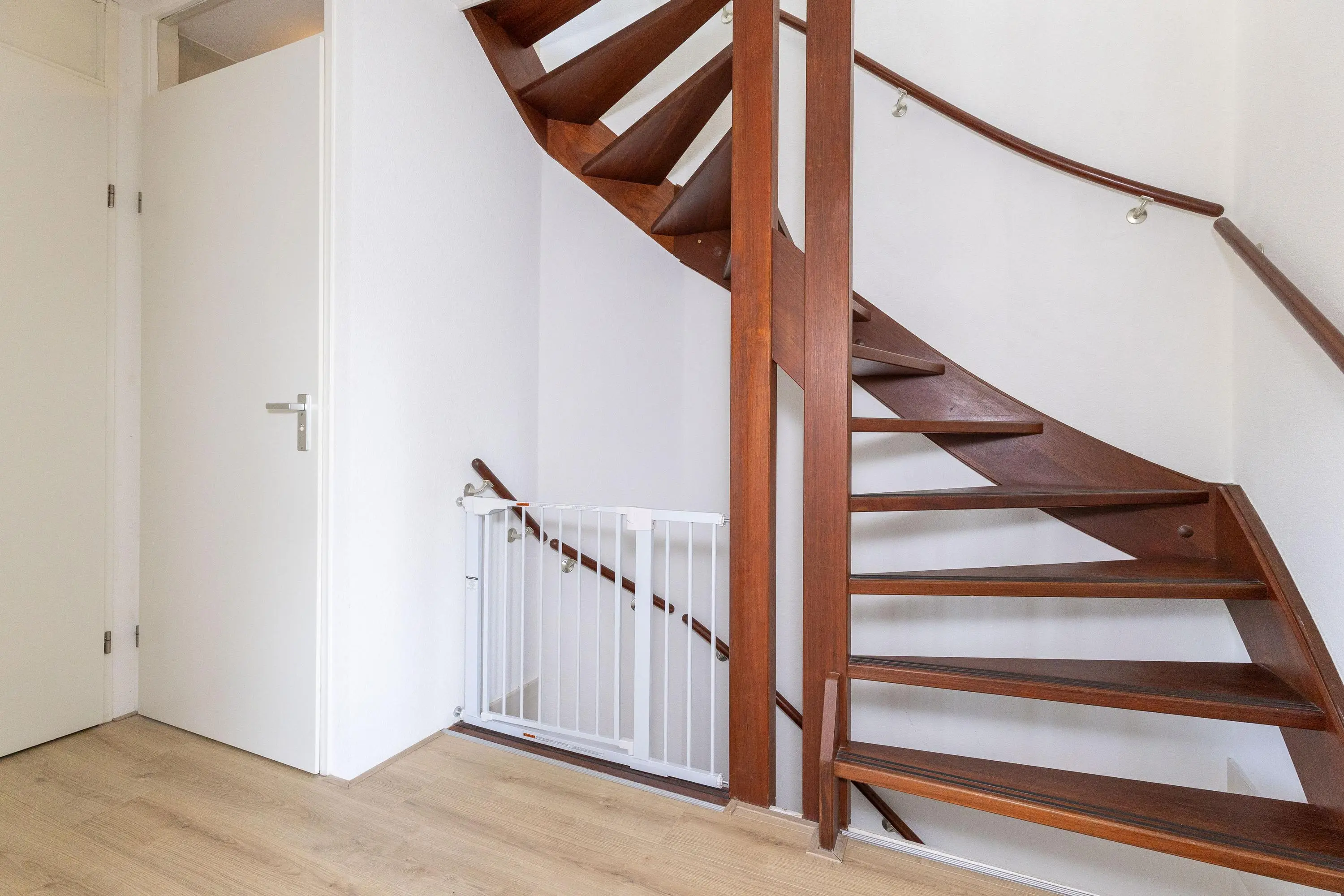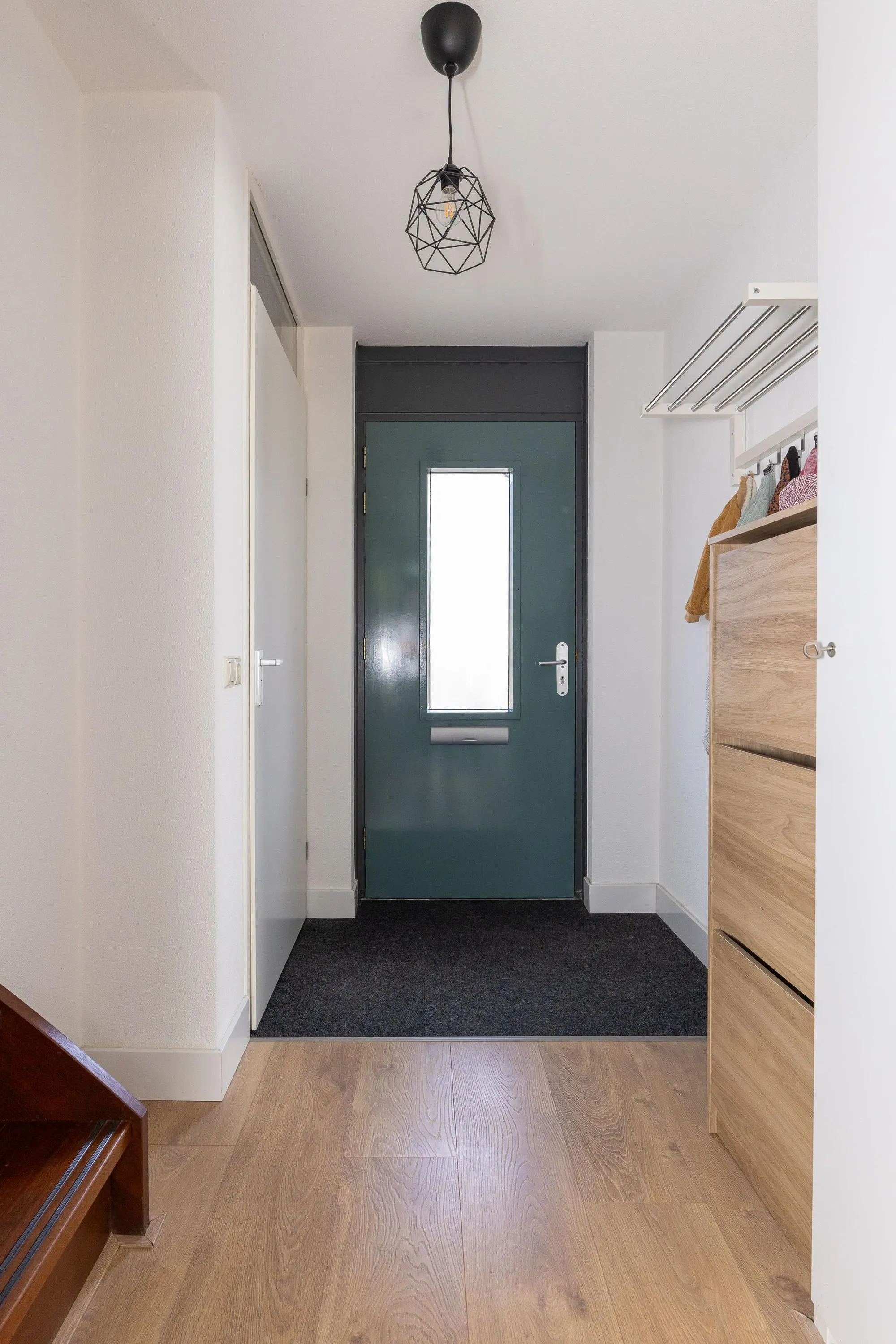 Je komt binnen in de hal met toilet en trapopgang. Vanuit daar stap je de ruime woonkamer binnen, een sfeervolle plek dankzij het hoge plafond, de nette vloer en de openslaande deuren naar de tuin. De praktische trapkast biedt extra opbergruimte.