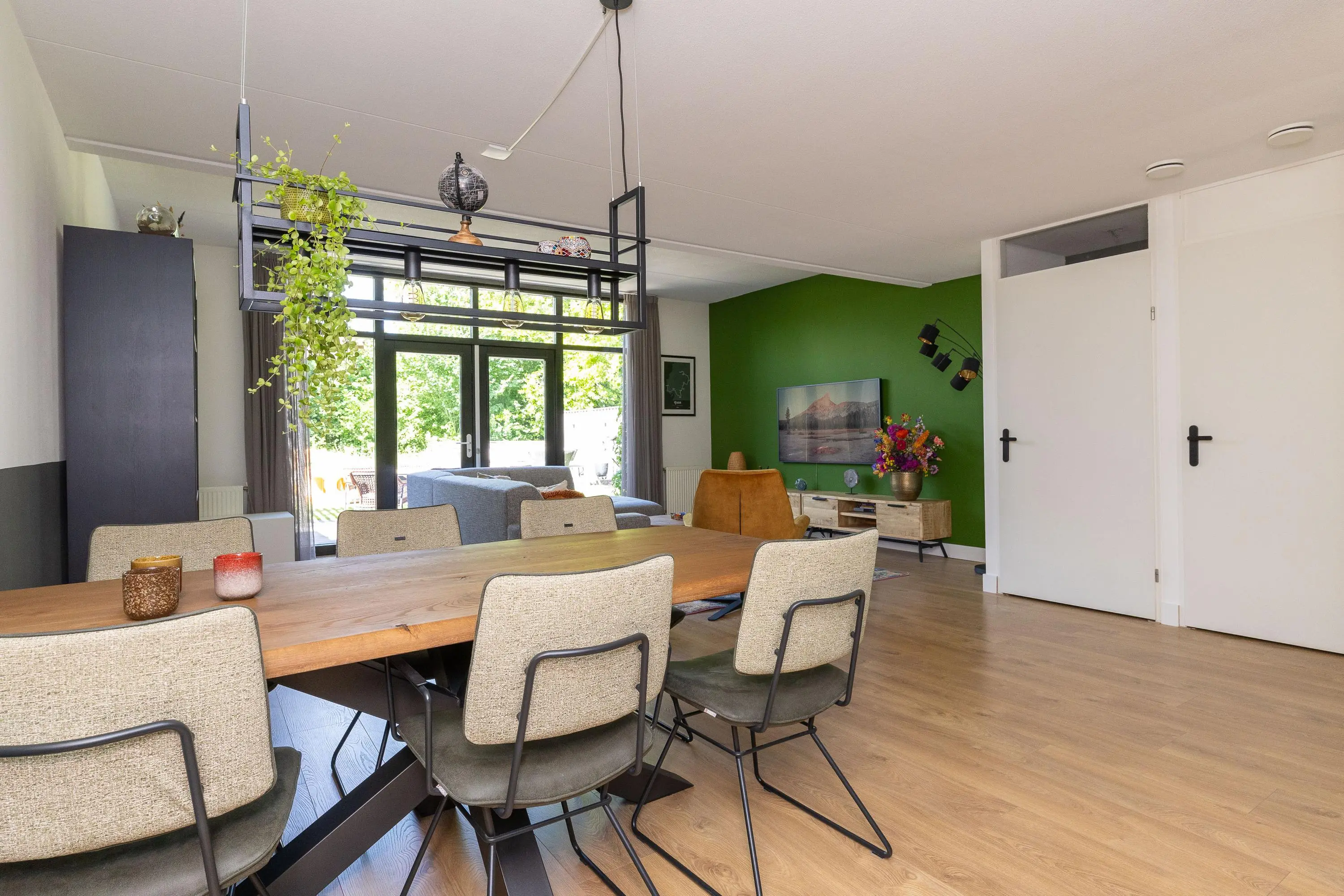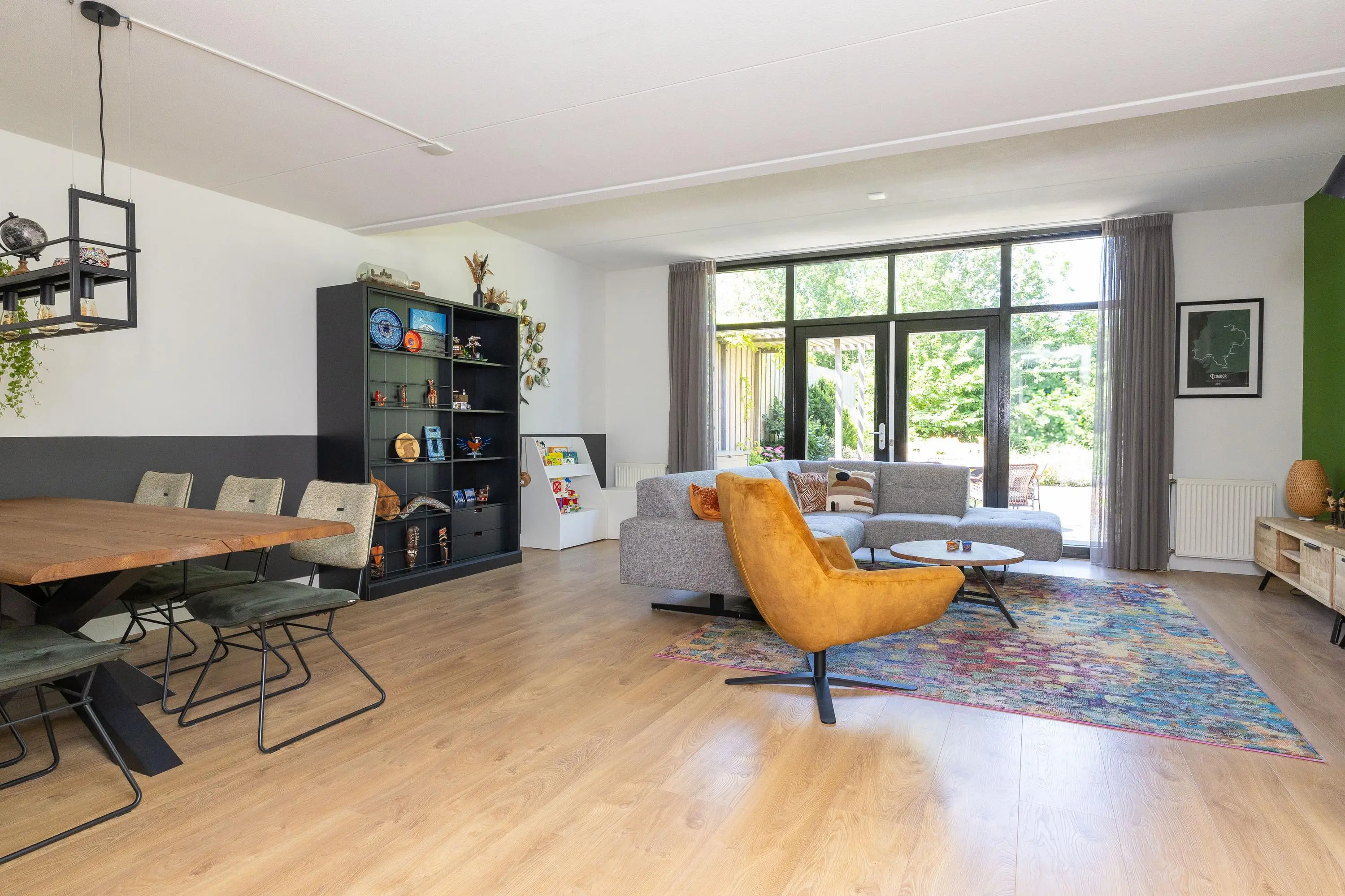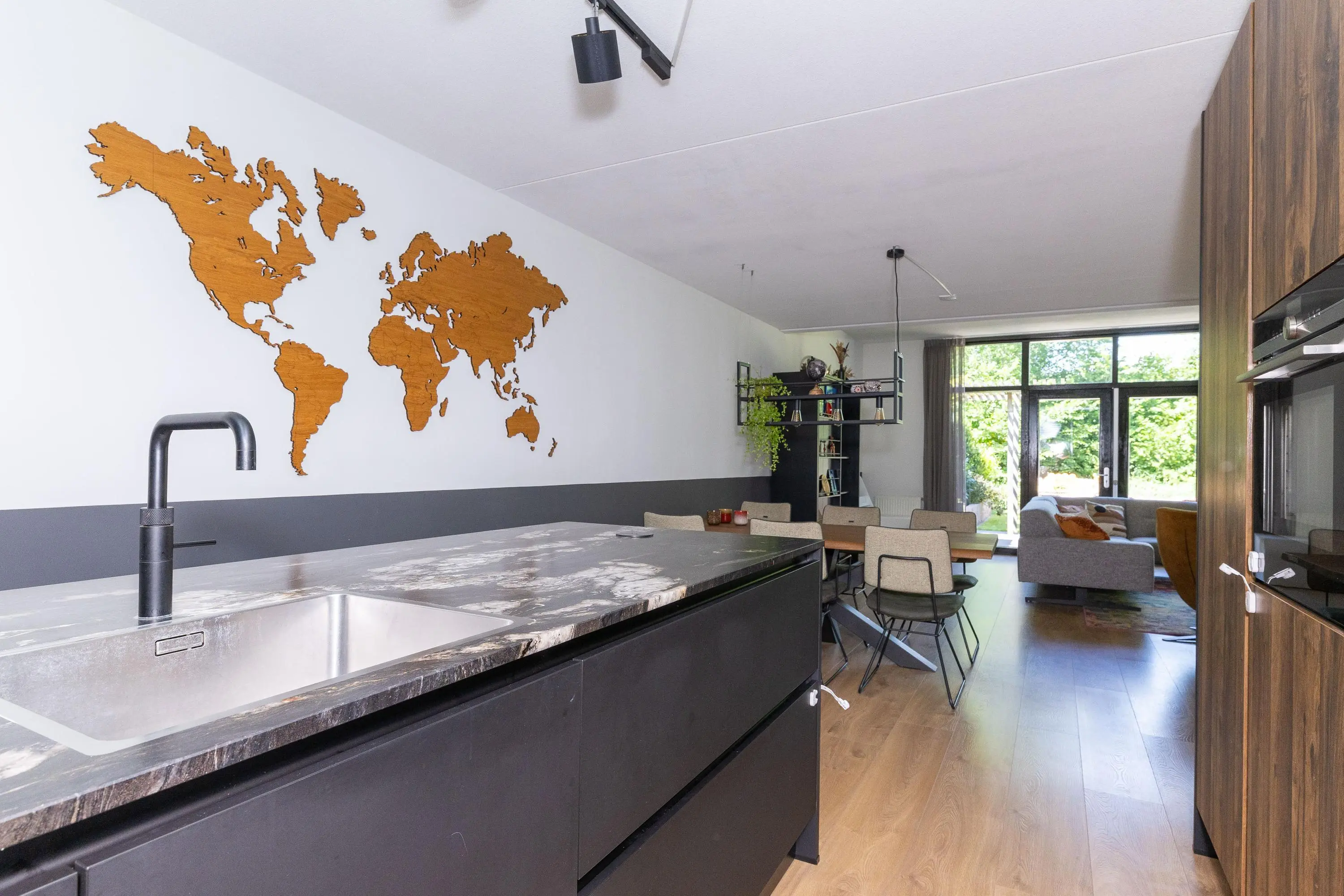 De moderne open keuken (2021) is een echte eyecatcher. Deze is voorzien van een kookeiland en uitgerust met hoogwaardige apparatuur zoals een inductiekookplaat van Bora, Quooker, een grote koelkast, combi-oven en vaatwasser. De garage is via de woonkamer binnendoor bereikbaar en beschikt over openslaande deuren aan beide zijden – praktisch én multifunctioneel!