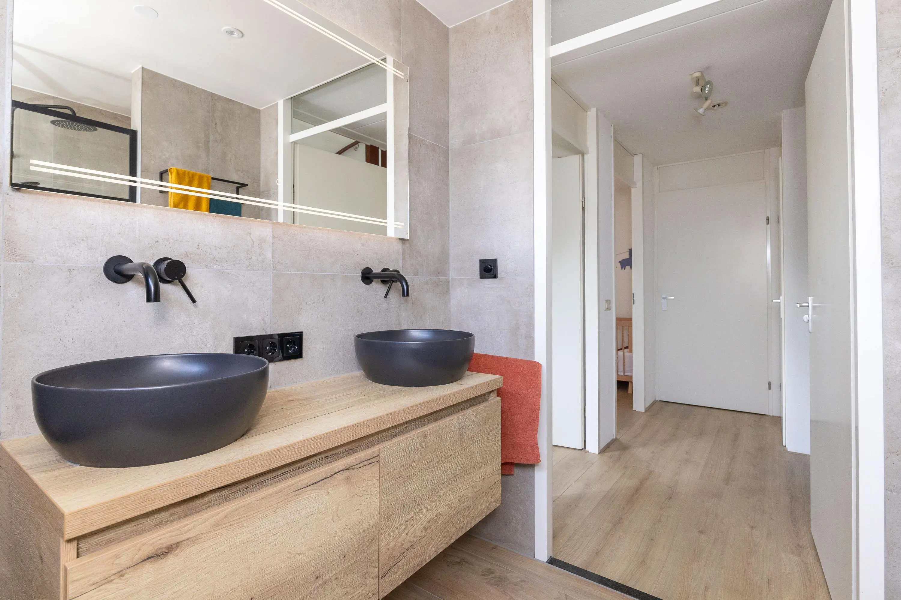 De overloop geeft toegang tot twee ruime slaapkamers, een apart tweede toilet en een modern afgewerkte badkamer (2021) met inloopdouche, dubbele wastafel en stijlvolle afwerking.