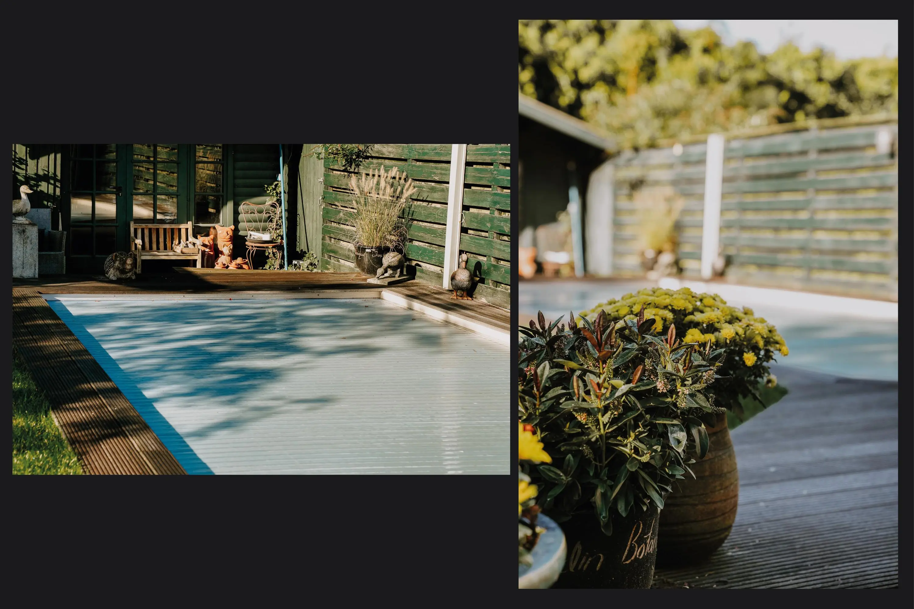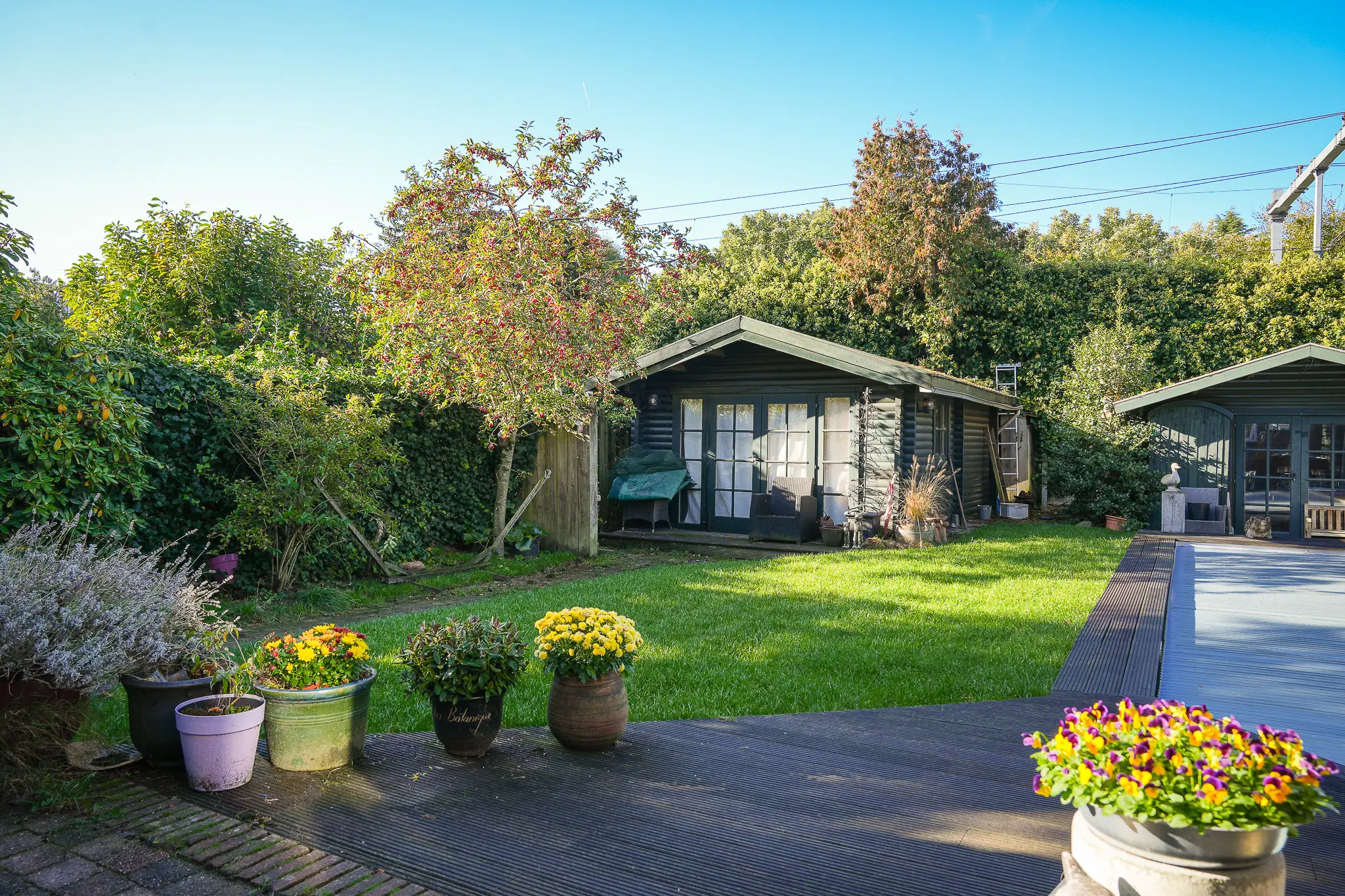 De achtertuin is werkelijk een verlengstuk van het woongenot. Gelegen op het zuiden, met volop zon en privacy, een zwembad en een jacuzzi als echte blikvangers. Het zwembad is voorzien van een elektrisch bedienbare solardek, pomphuis met glasfilterinstallatie en verlichting. Daarnaast zijn er meerdere zitgedeeltes en twee tuinhuisjes, het grote tuinhuis kan gebruikt worden als kantoorruimte, deze beschikt over een eigen toilet, wateraansluiting en een eigen verwarmingsketel (2020). Het kleinere tuinhuis is voorzien van opslagruimte en de 5 persoons jacuzzi. De oprit aan de voorzijde biedt ruimte voor twee auto’s.
