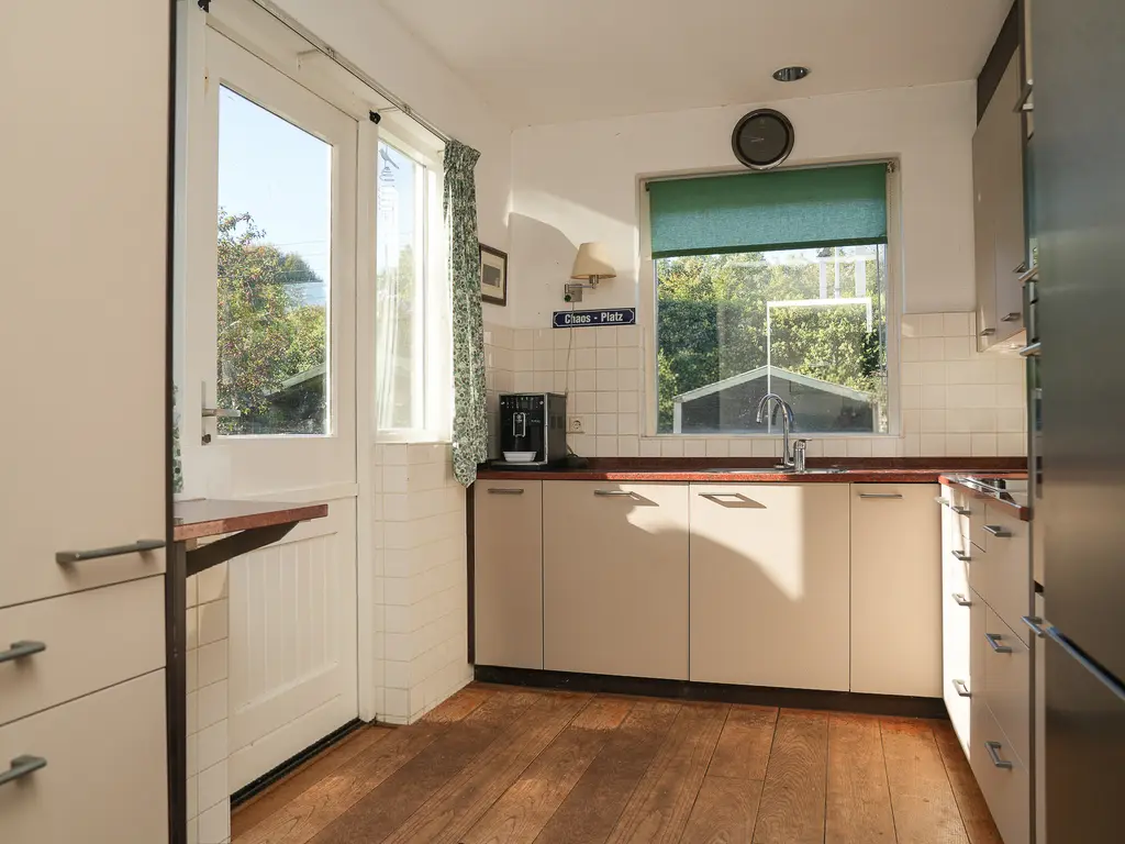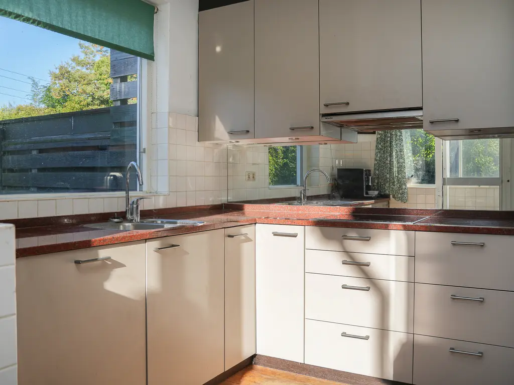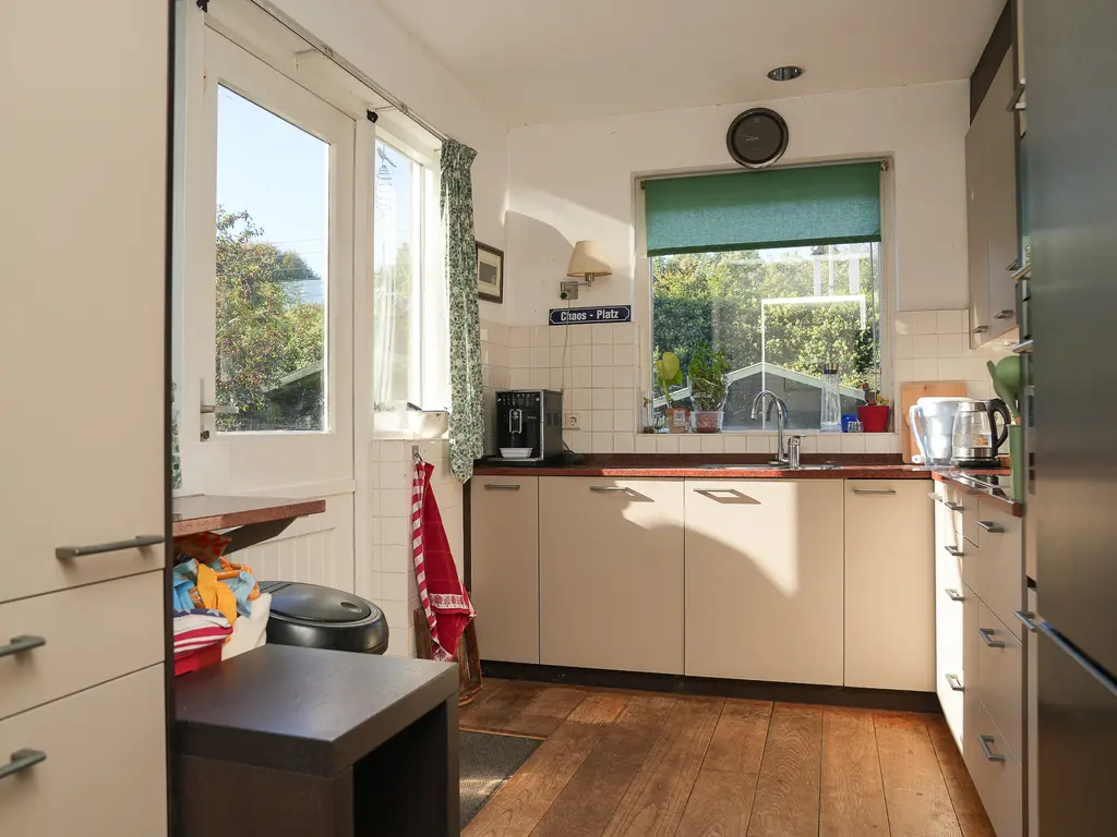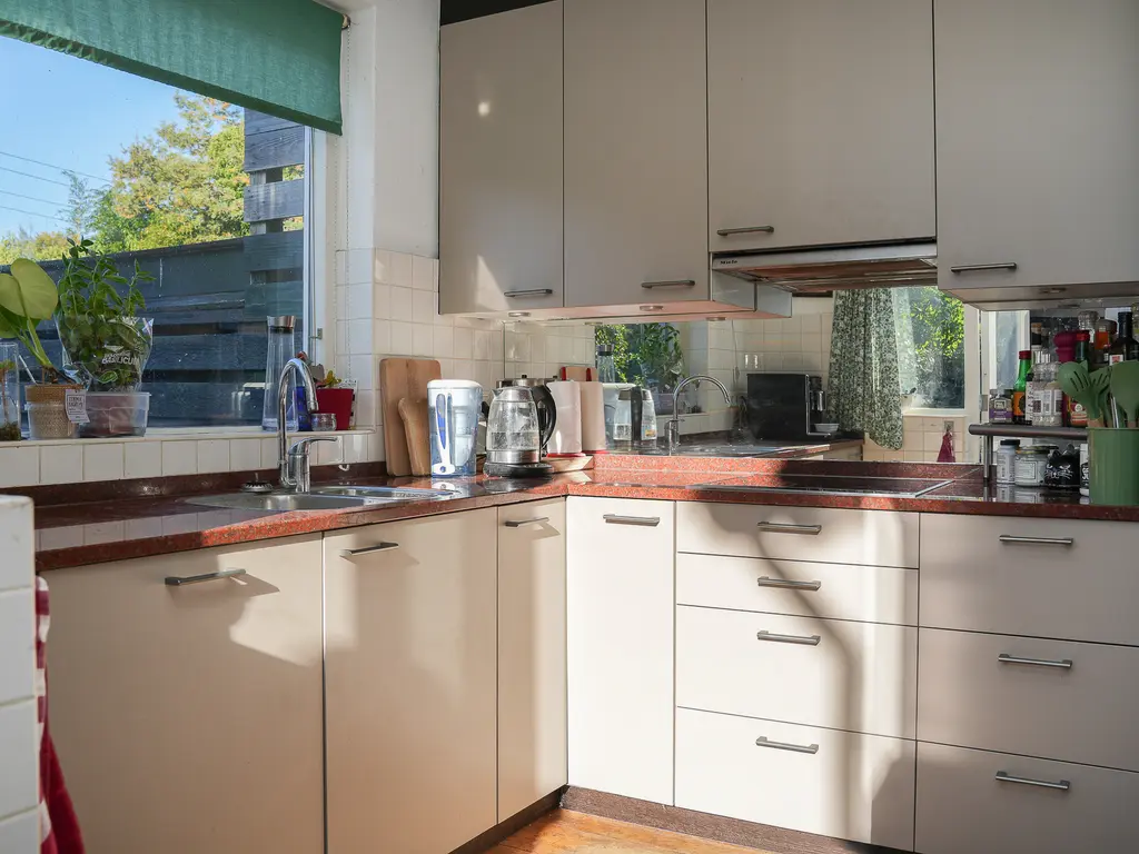 Aan de achterzijde ligt de keuken, uitgevoerd in taupe met een gemêleerd granieten werkblad. Voorzien van alle benodigde inbouwapparatuur, waaronder een keramische kookplaat, oven en steamer en toegang tot het terras. De praktische indeling en directe verbinding met de eethoek maken dit een heerlijke plek om samen te koken en te tafelen. Via de schuifpui stap je zo de tuin in.