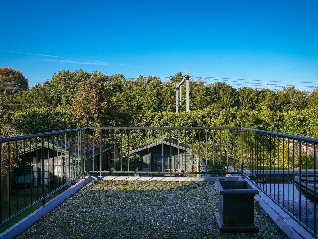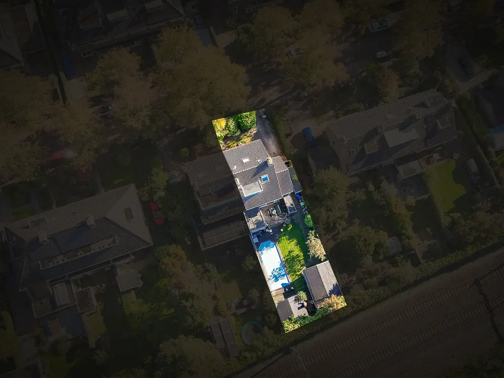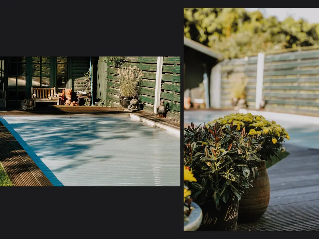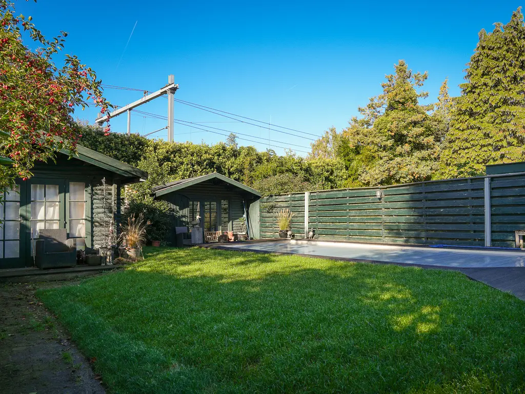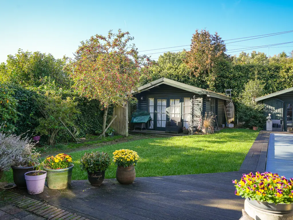 De achtertuin is werkelijk een verlengstuk van het woongenot. Gelegen op het zuiden, met volop zon en privacy, een zwembad en een jacuzzi als echte blikvangers. Het zwembad is voorzien van een elektrisch bedienbare solardek, pomphuis met glasfilterinstallatie en verlichting. Daarnaast zijn er meerdere zitgedeeltes en twee tuinhuisjes, het grote tuinhuis kan gebruikt worden als kantoorruimte, deze beschikt over een eigen toilet, wateraansluiting en een eigen verwarmingsketel (2020). Het kleinere tuinhuis is voorzien van opslagruimte en de 5 persoons jacuzzi. De oprit aan de voorzijde biedt ruimte voor twee auto’s.