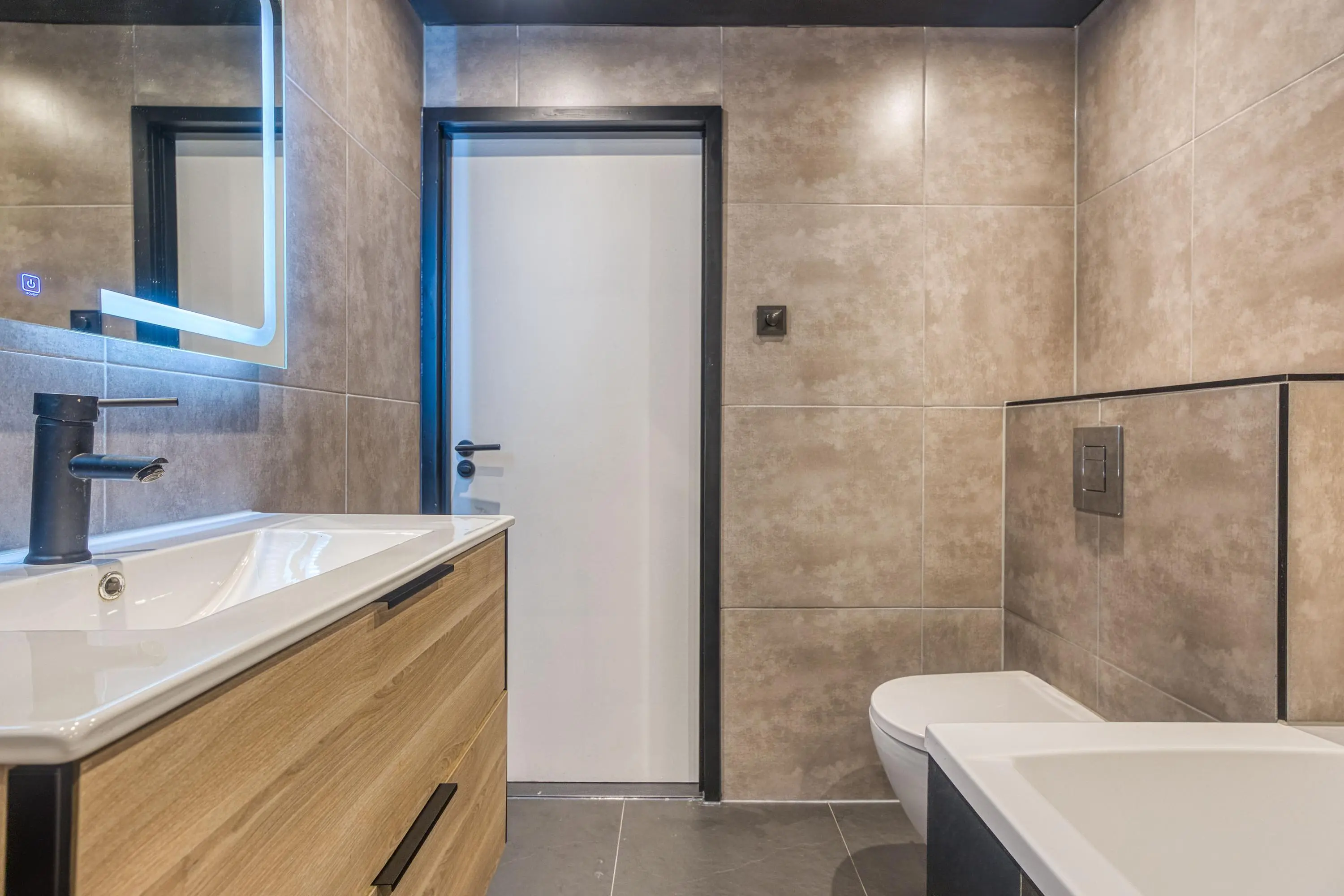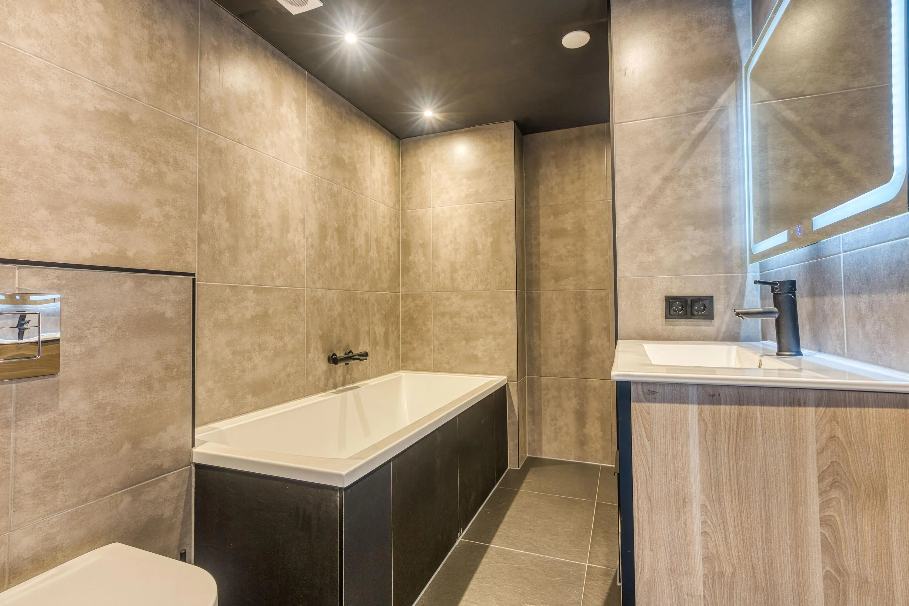 De comfortabele badkamer is uitgerust met vloerverwarming, ligbad, douche, wastafelmeubel en een tweede wandcloset.