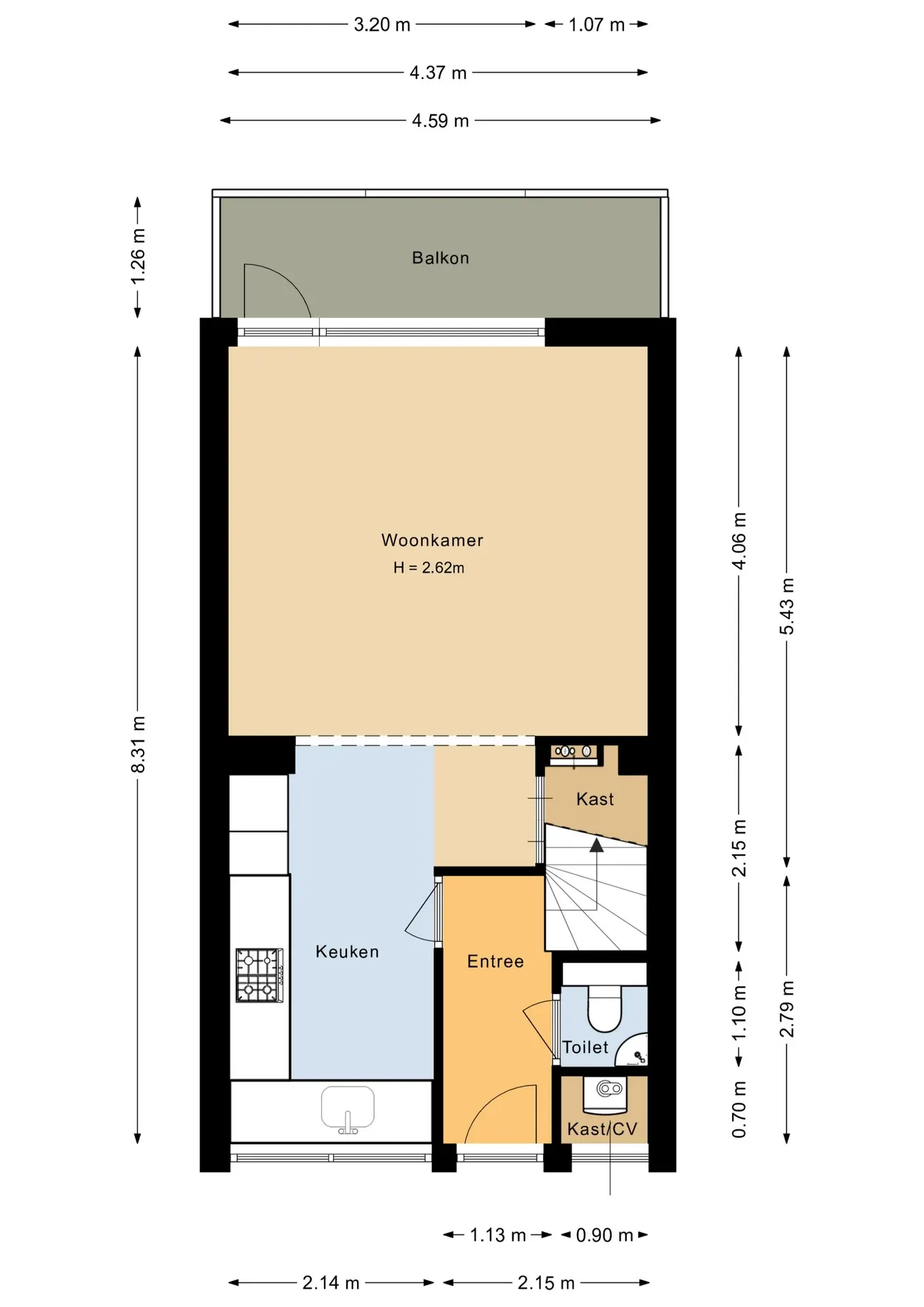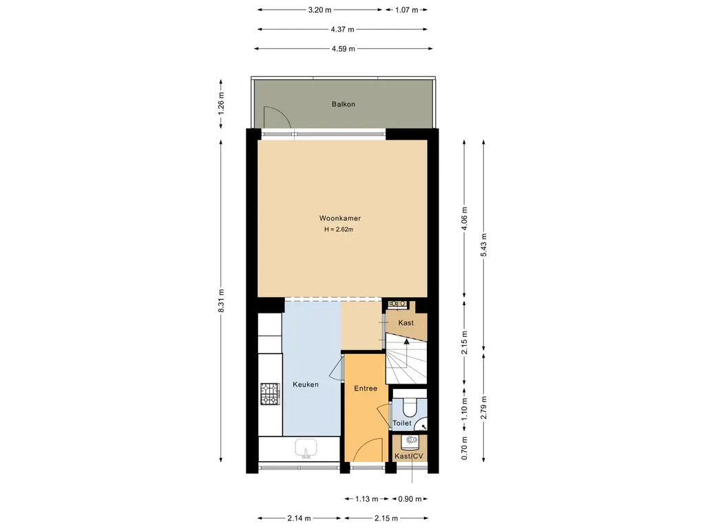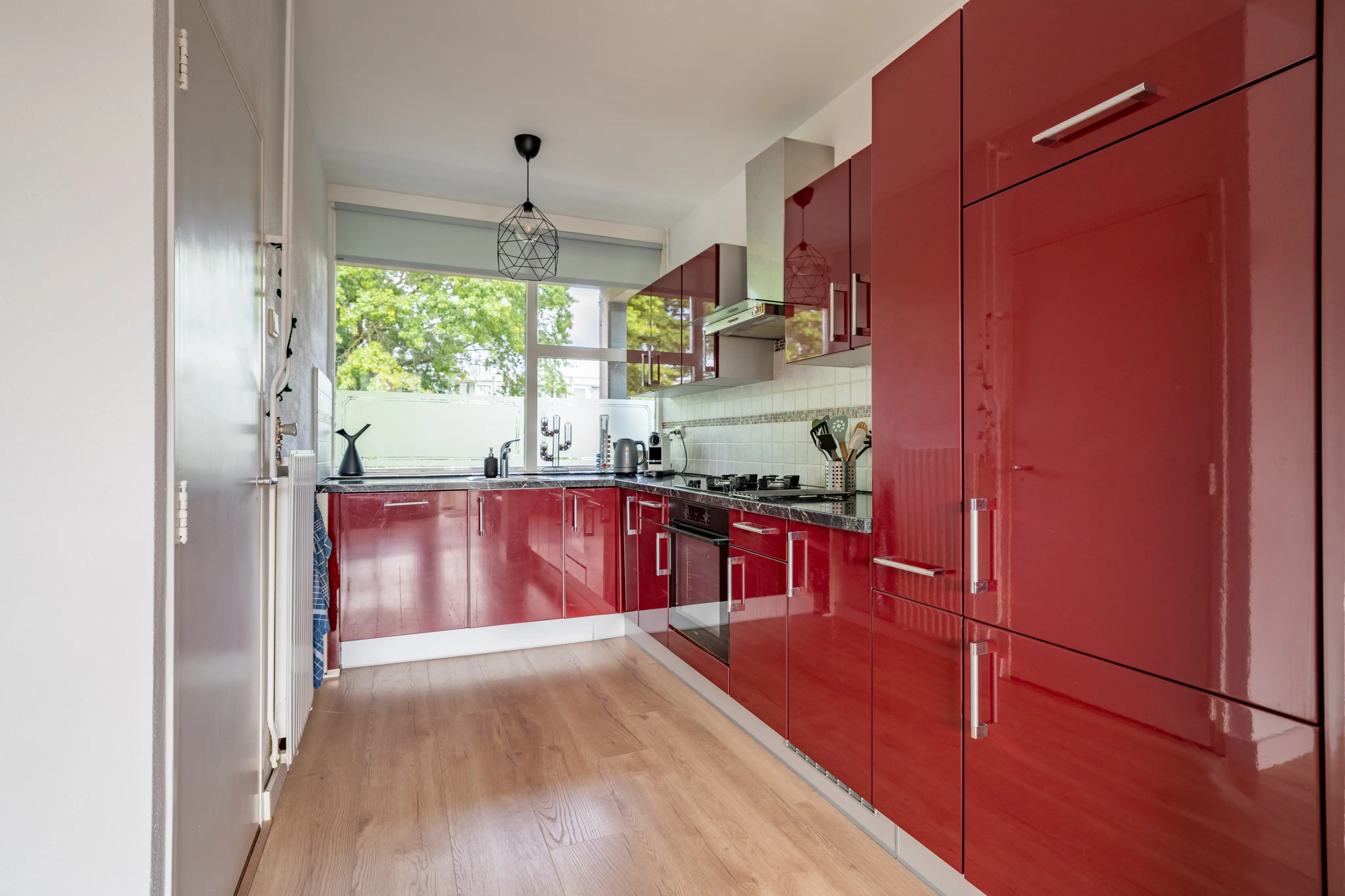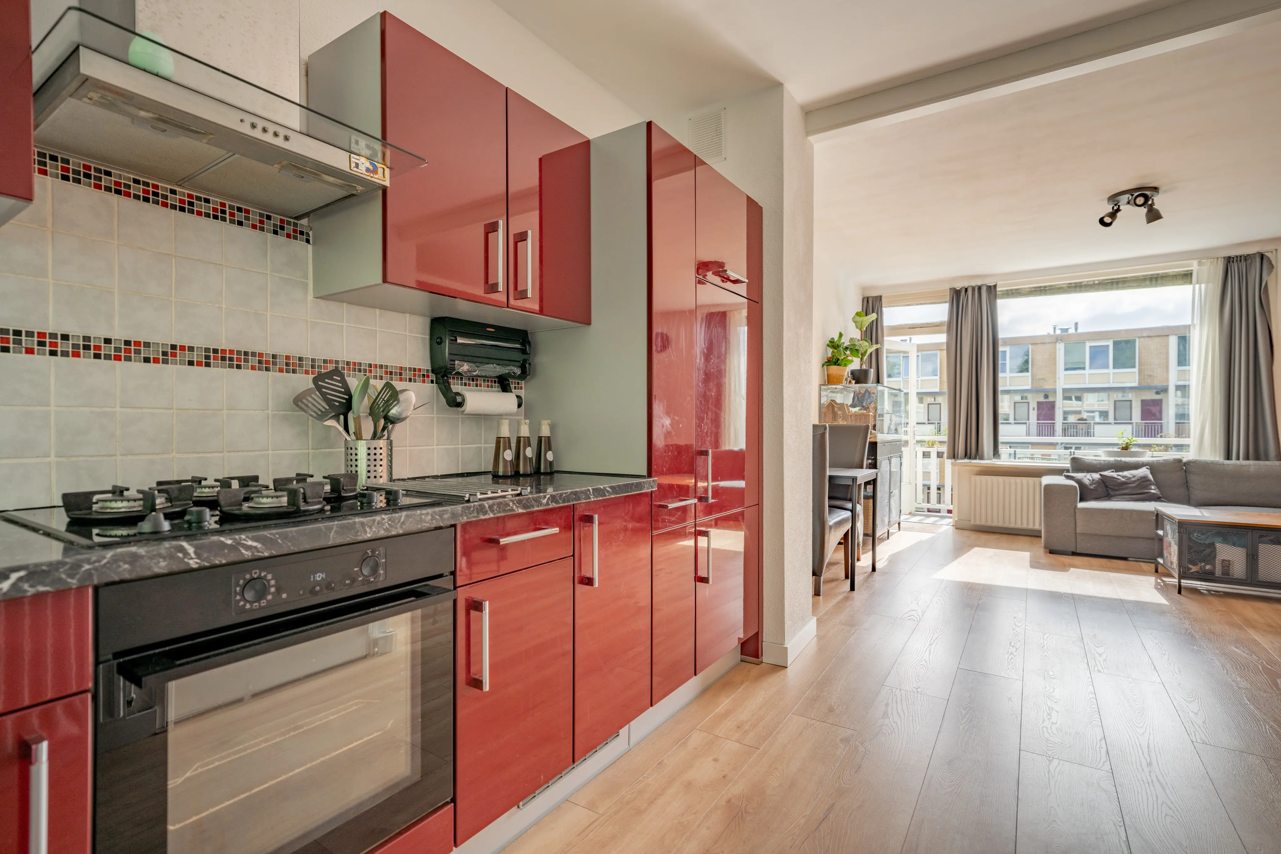 Via de galerij bereik je de entree van de woning. De hal biedt toegang tot het separaat toilet en de trap naar boven. Aan de linkerzijde bevindt zich de open keuken, die in directe verbinding staat met de ruime en lichte woonkamer. De grote raampartijen zorgen voor veel natuurlijk lichtinval en een prettige sfeer. Vanuit de woonkamer stap je zo het zonnige balkon op, waar je heerlijk kunt genieten van de buitenlucht en het vrije uitzicht.
