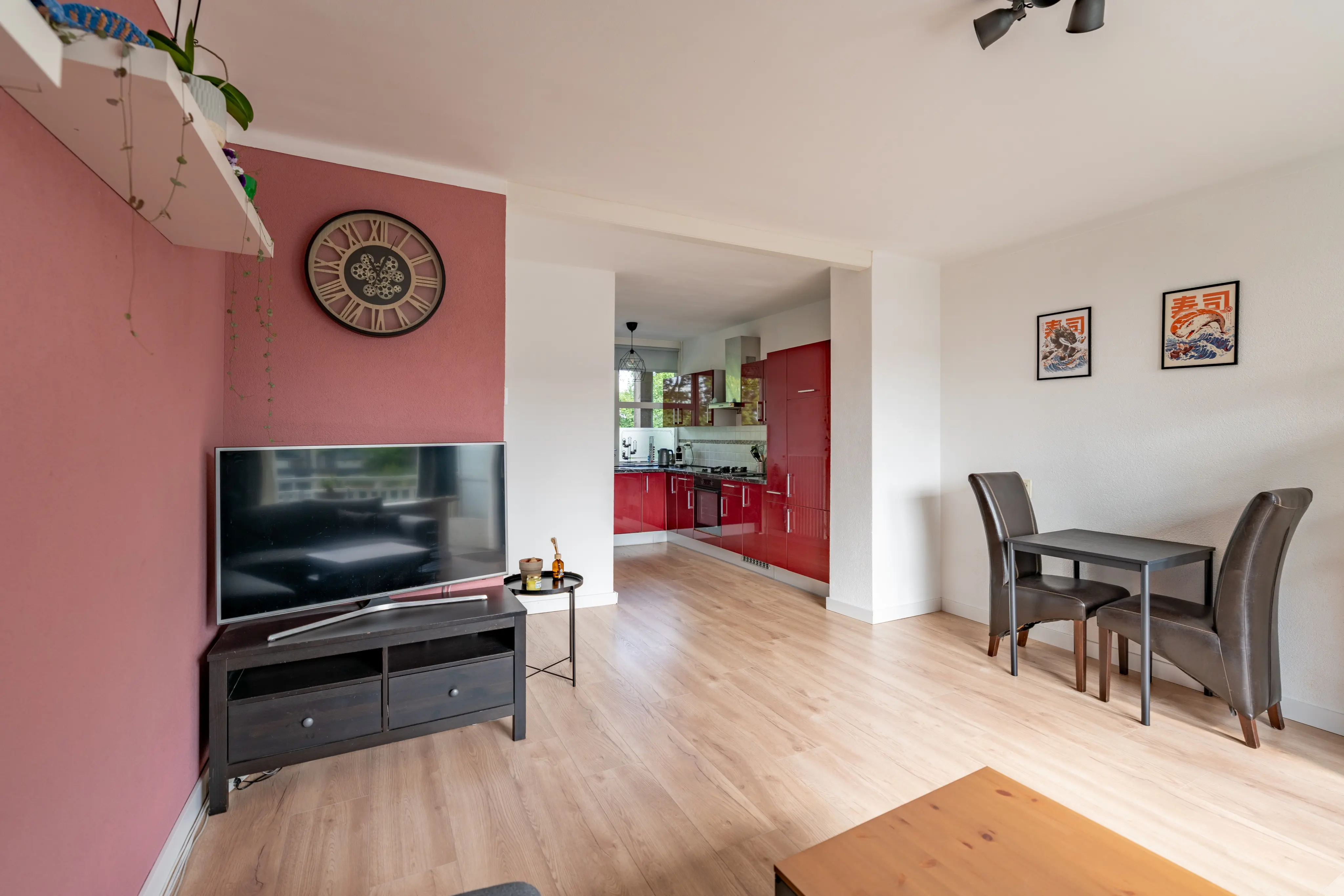The apartment is accessed via a gallery. The entrance hall leads to the separate toilet and the staircase to the upper floor. On the left-hand side you’ll find the open-plan kitchen, which seamlessly connects to the bright and spacious living room. Large windows allow plenty of natural light, creating a warm and inviting atmosphere. From the living room, you step out onto the sunny balcony, perfect for relaxing and enjoying the fresh air and open views.
