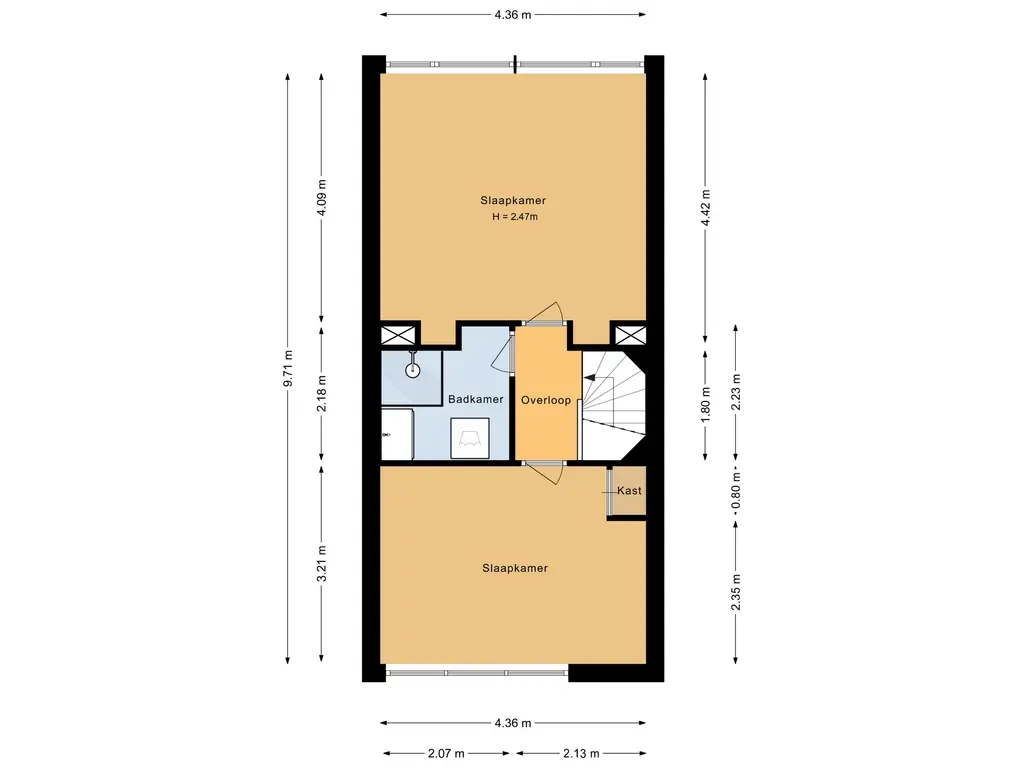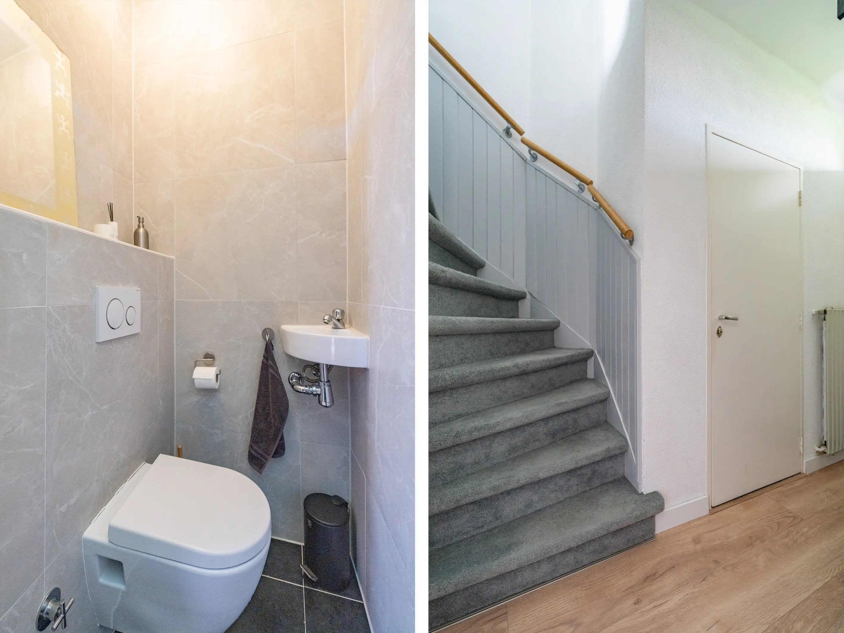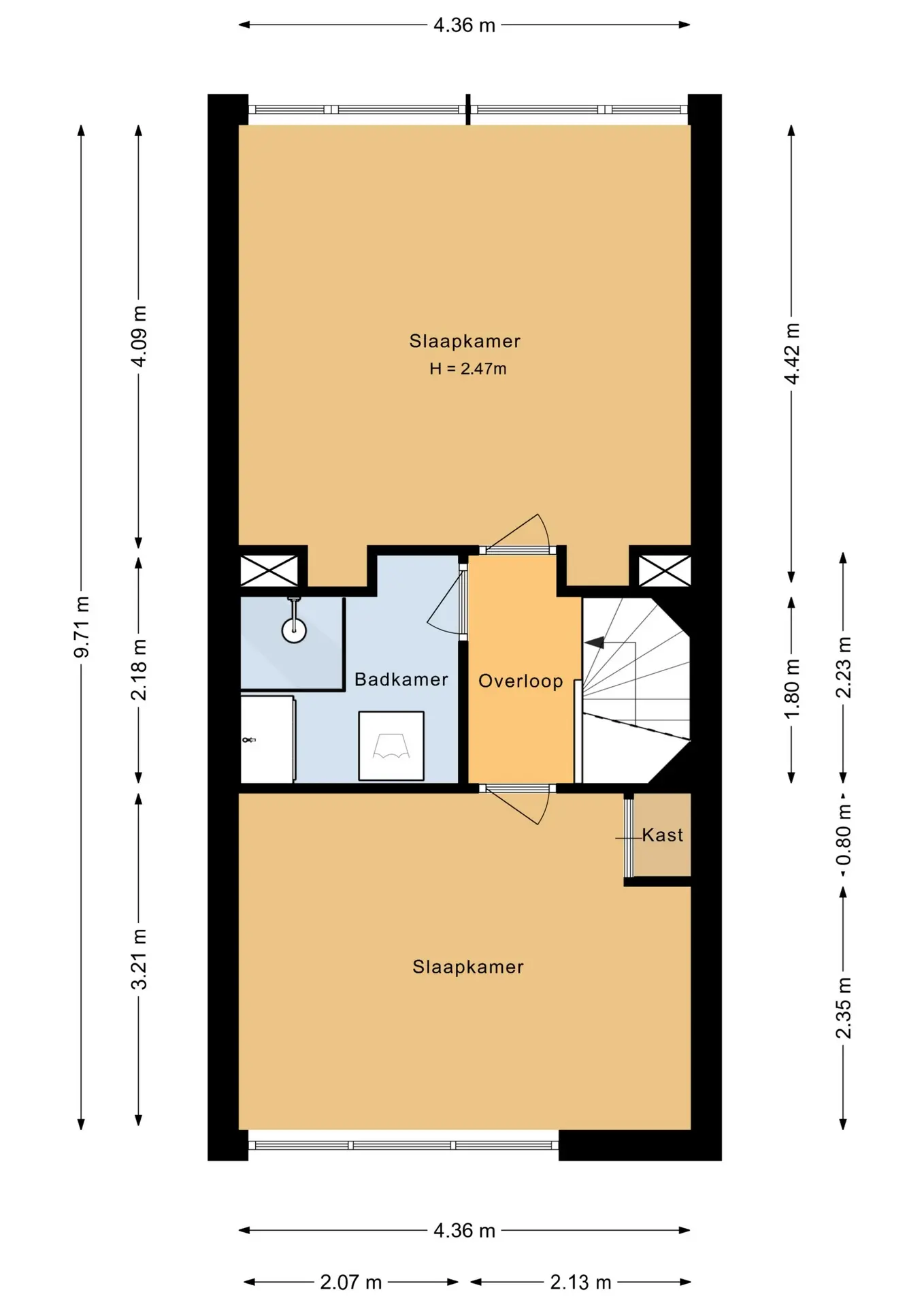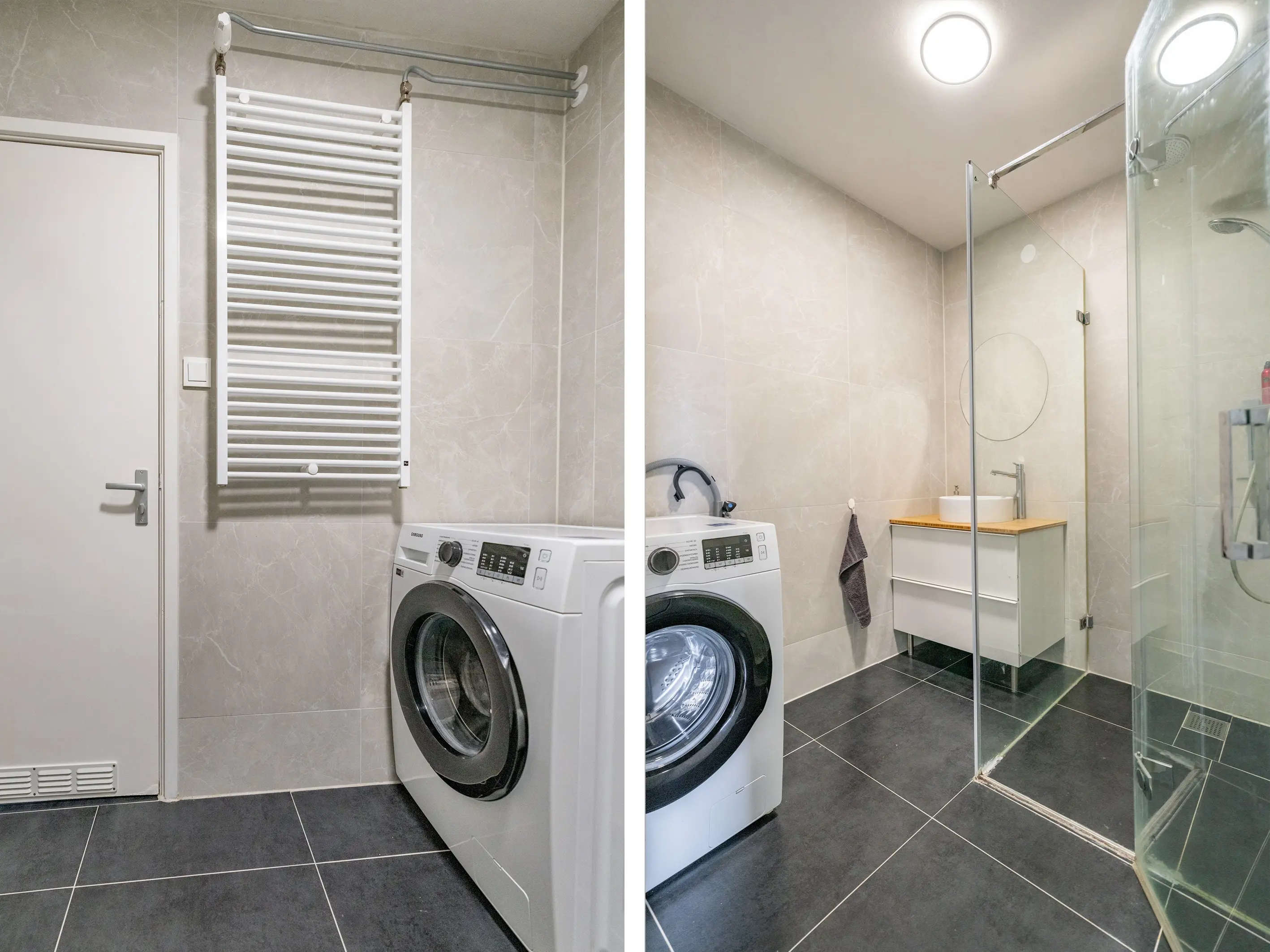 Op deze verdieping vind je twee goed bemeten slaapkamers, beide met voldoende ruimte voor een tweepersoonsbed en kastruimte. De badkamer is compleet uitgerust met een douche, modern wastafelmeubel en aansluitingen voor wasmachine en droger.