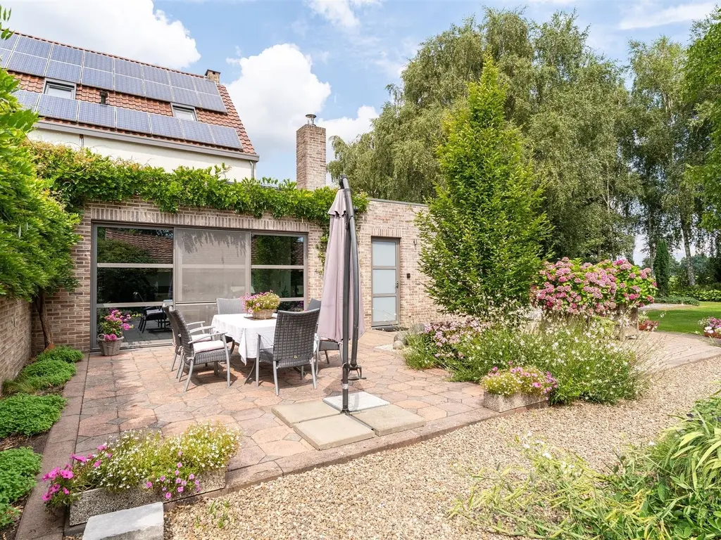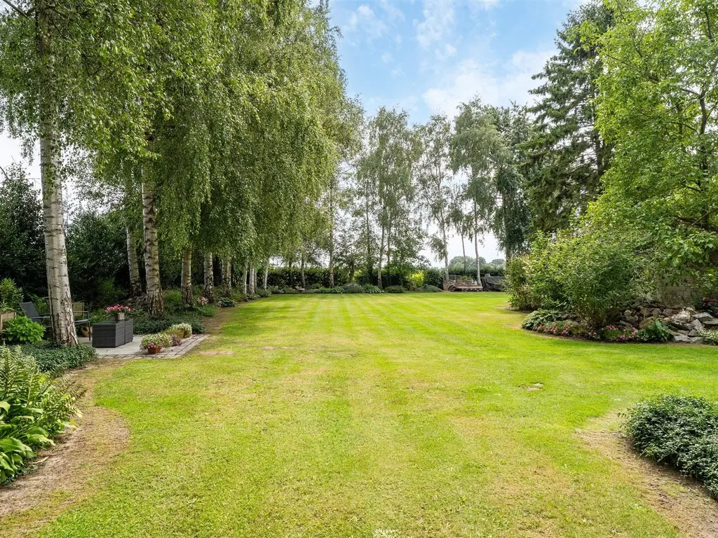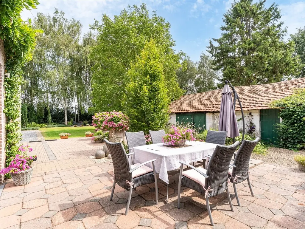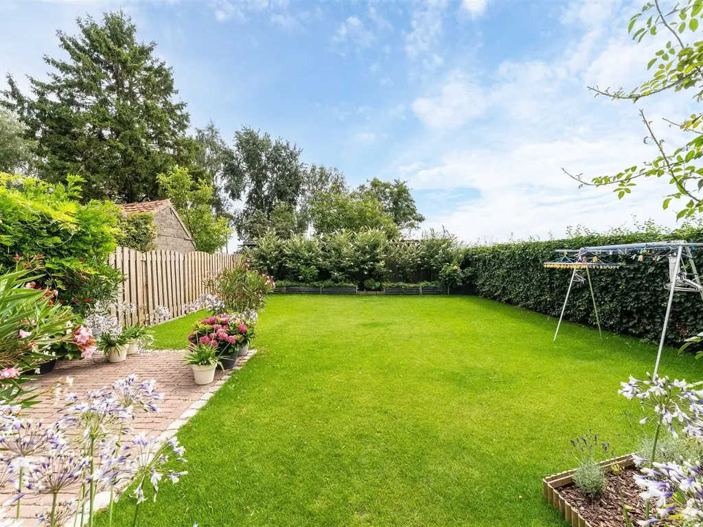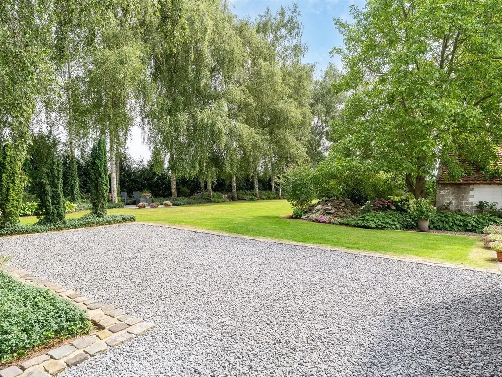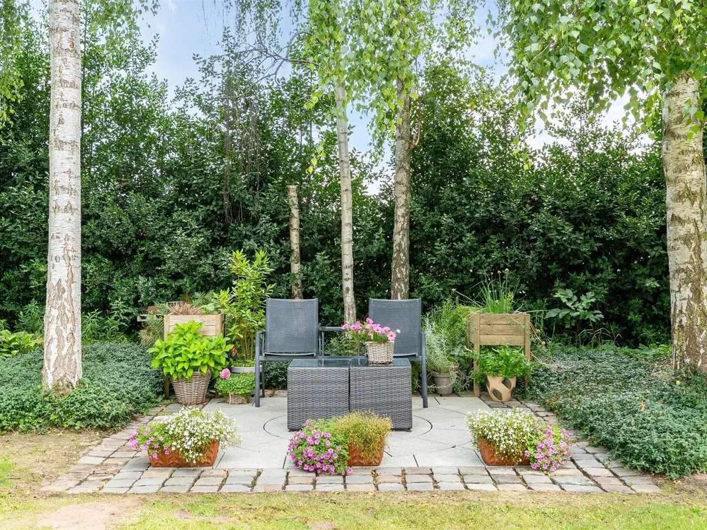 De tuin heeft een oppervlakte van 26a 34ca met een aangelegd terras, werkhuis en opslagplaats.