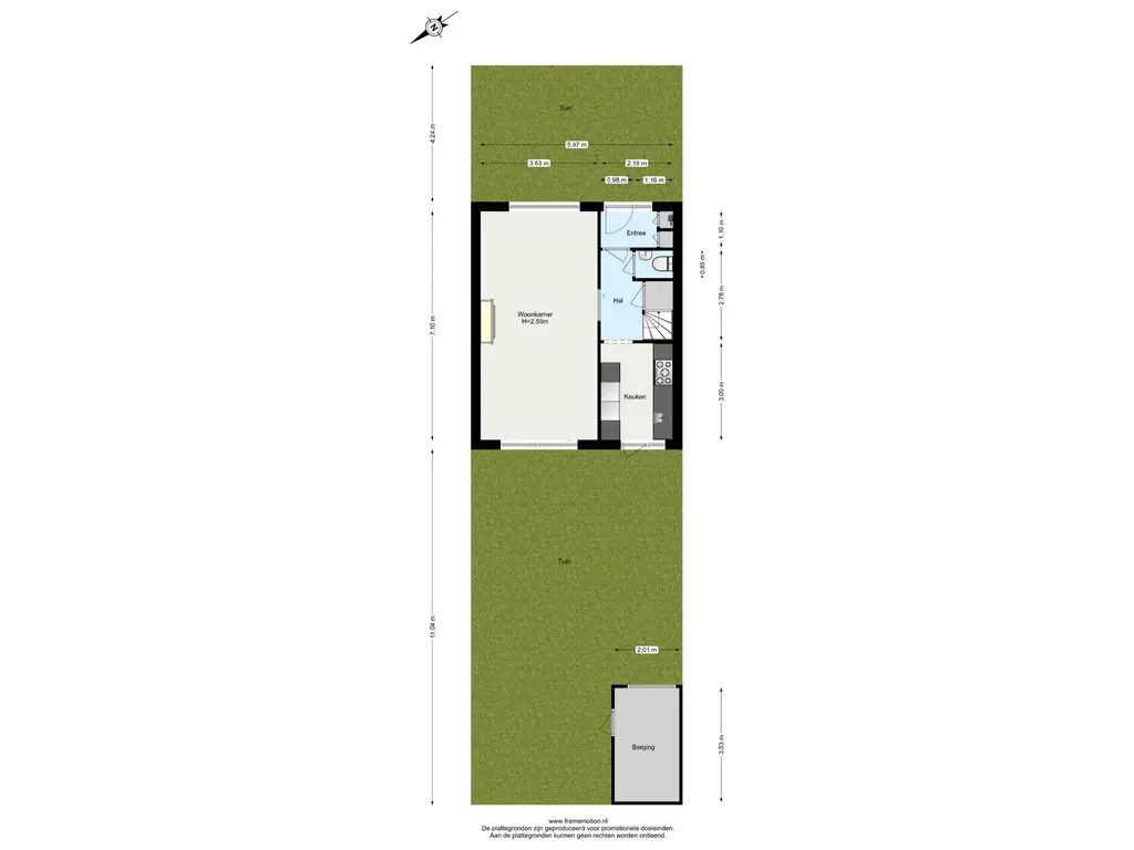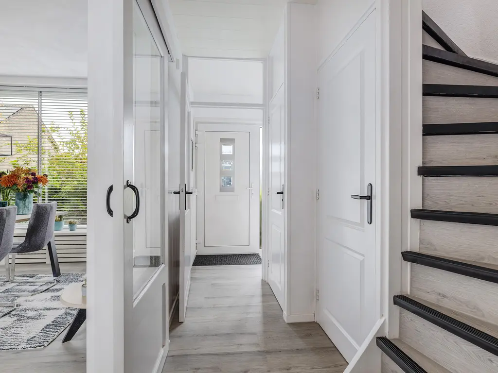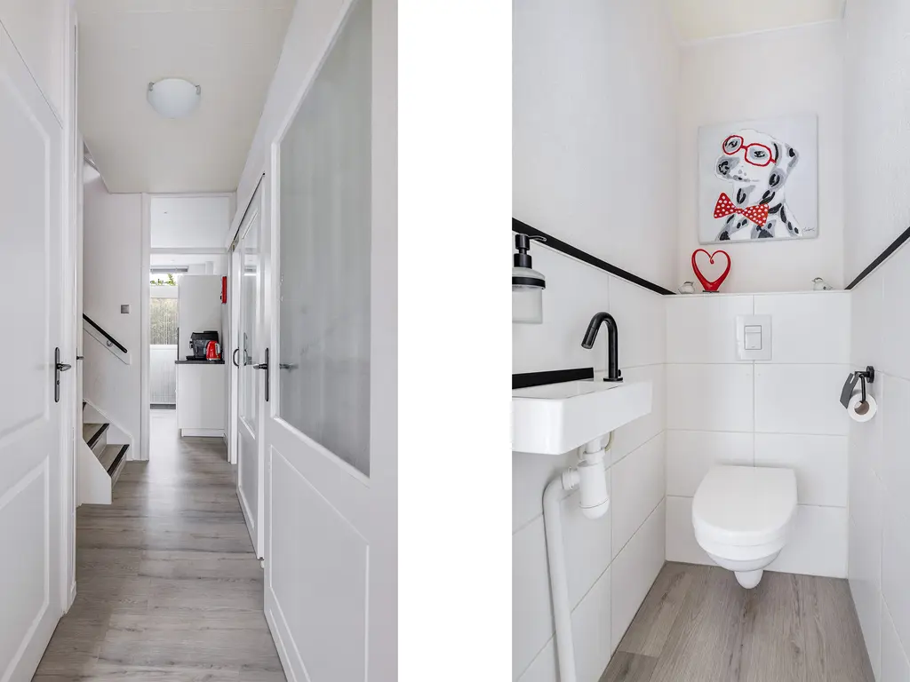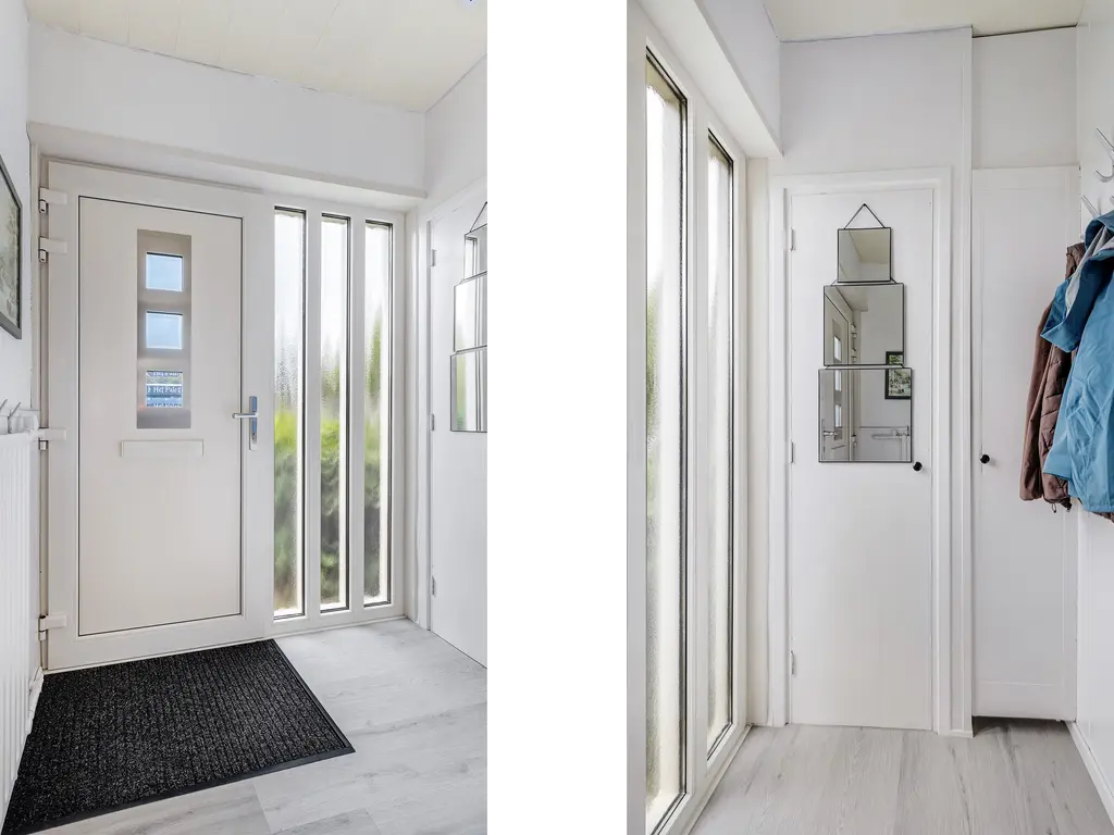 Via het voorportaal met meterkast en schoenenkast stap je de hal binnen, waar zich het toilet en de toegangen tot zowel de woonkamer als de keuken bevinden.