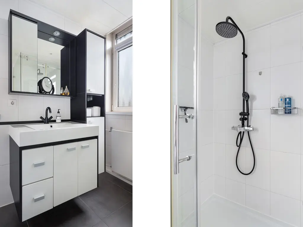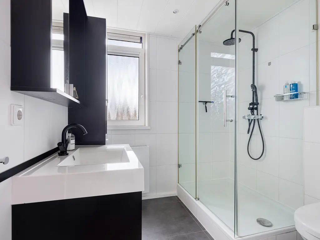 De badkamer is modern uitgevoerd met wit/antraciete betegeling en voorzien van een inloopdouche met glazen wand, een tweede hangend toilet, een wastafelmeubel en een spiegelkast.