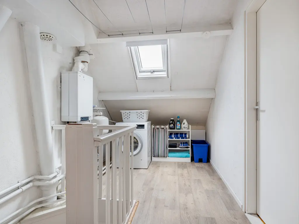 Op de tweede verdieping bevindt zich de overloop met aansluitingen voor wasmachine en droger en de CV-opstelling. Een kunststof Velux dakraam zorgt hier voor natuurlijke lichtinval.