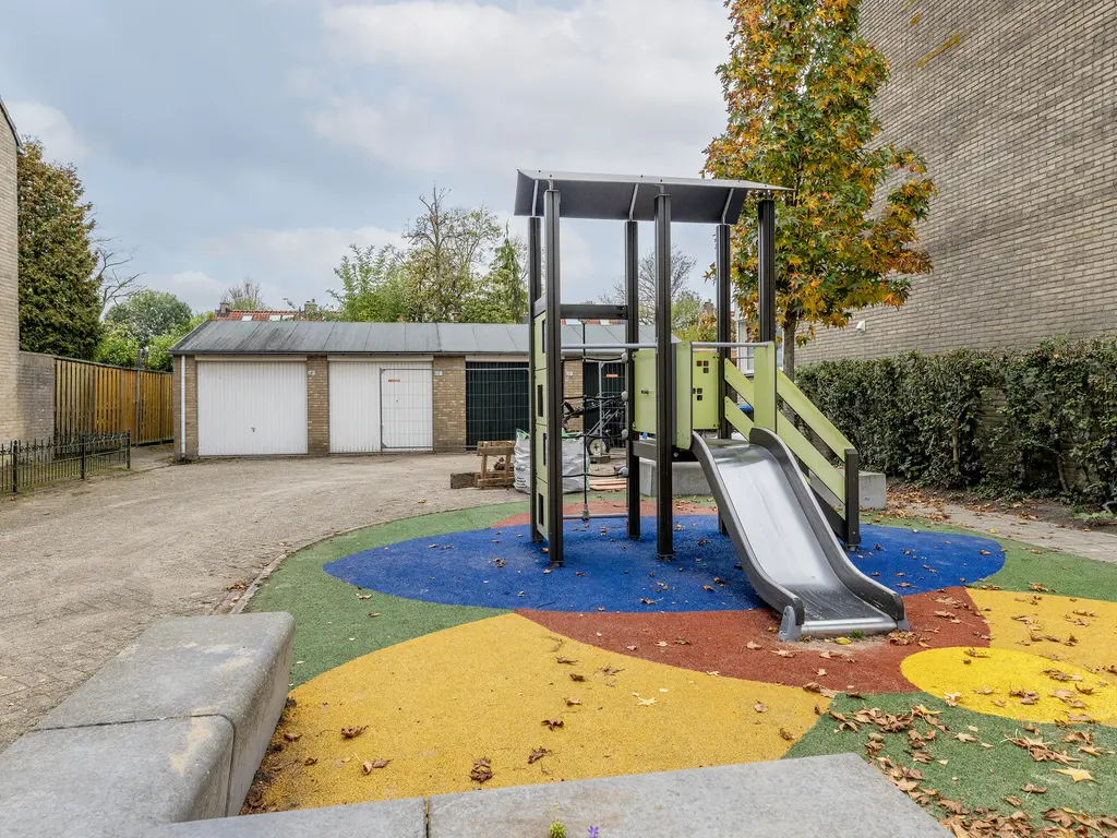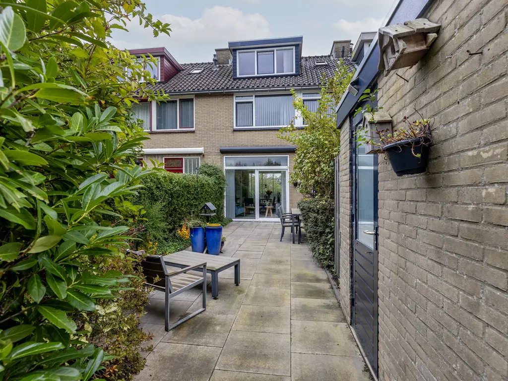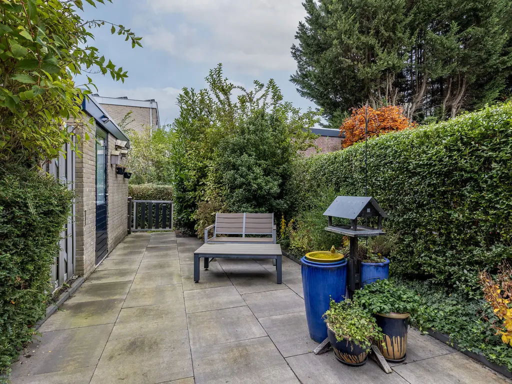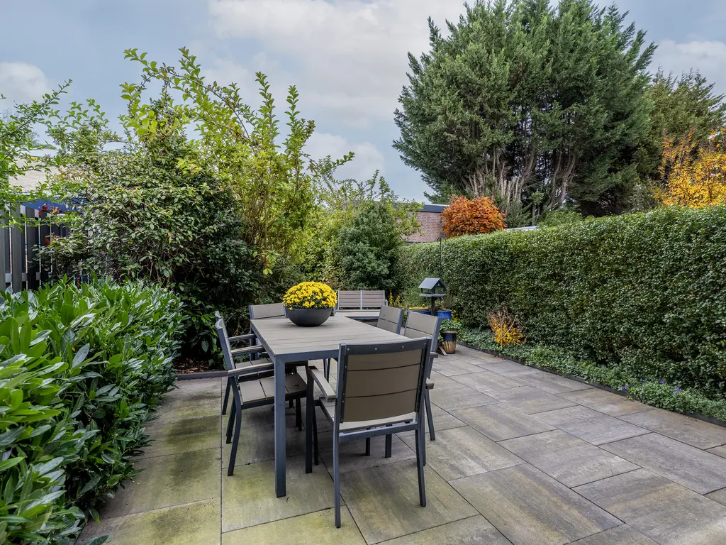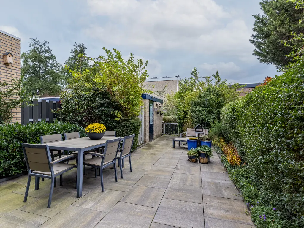 De achtertuin op het westen biedt veel privacy en groen. Hier geniet je volop van de middag- en avondzon. De tuin beschikt over een achterom, een elektrisch bedienbaar zonnescherm en een vrijstaande stenen berging voor fietsen en tuinspullen.