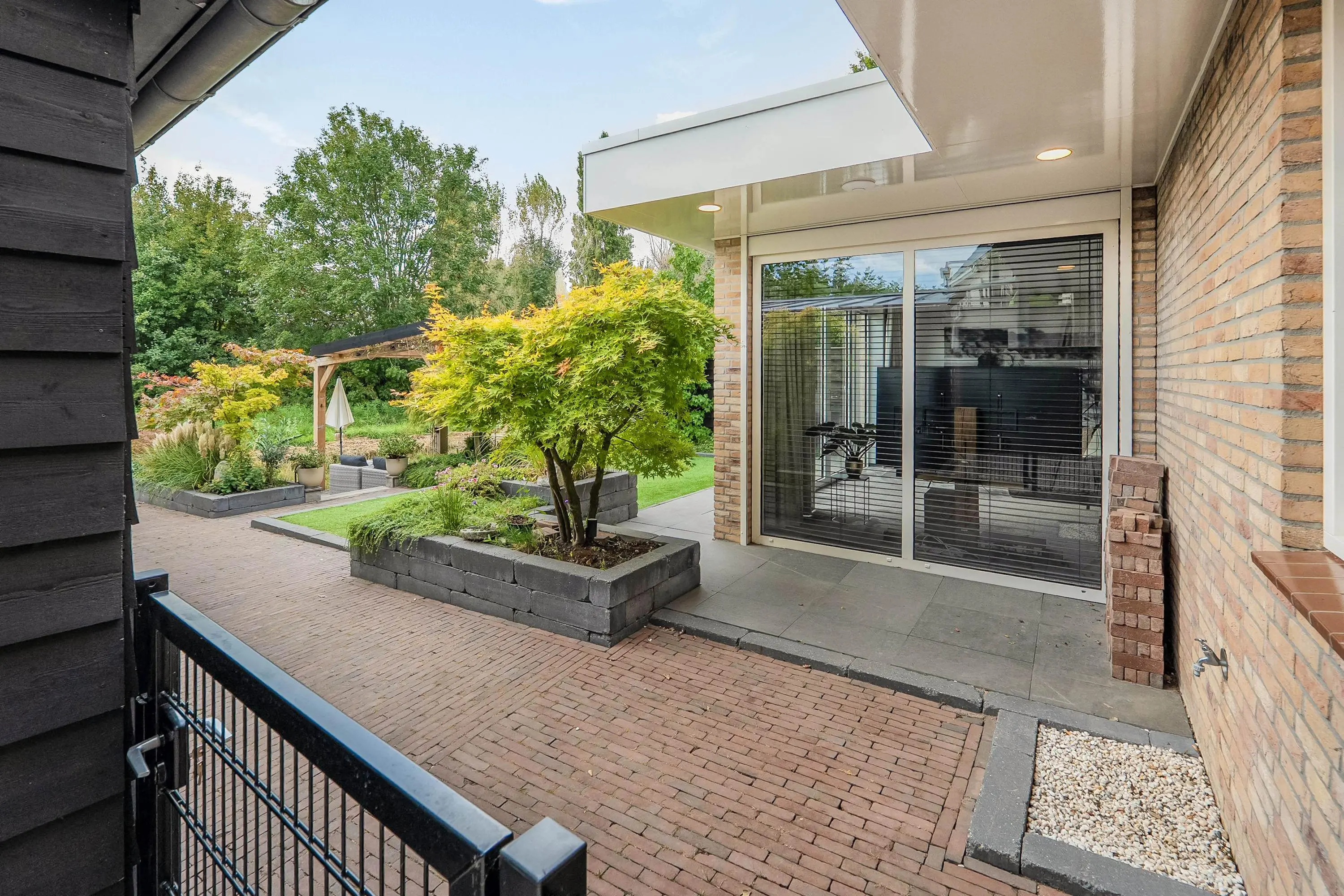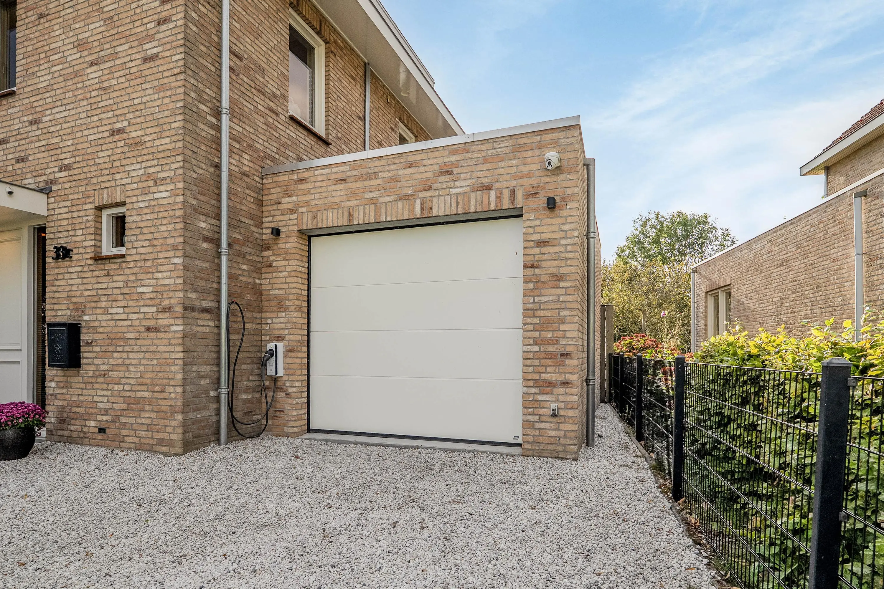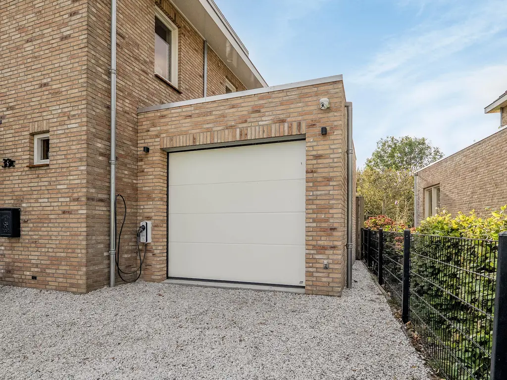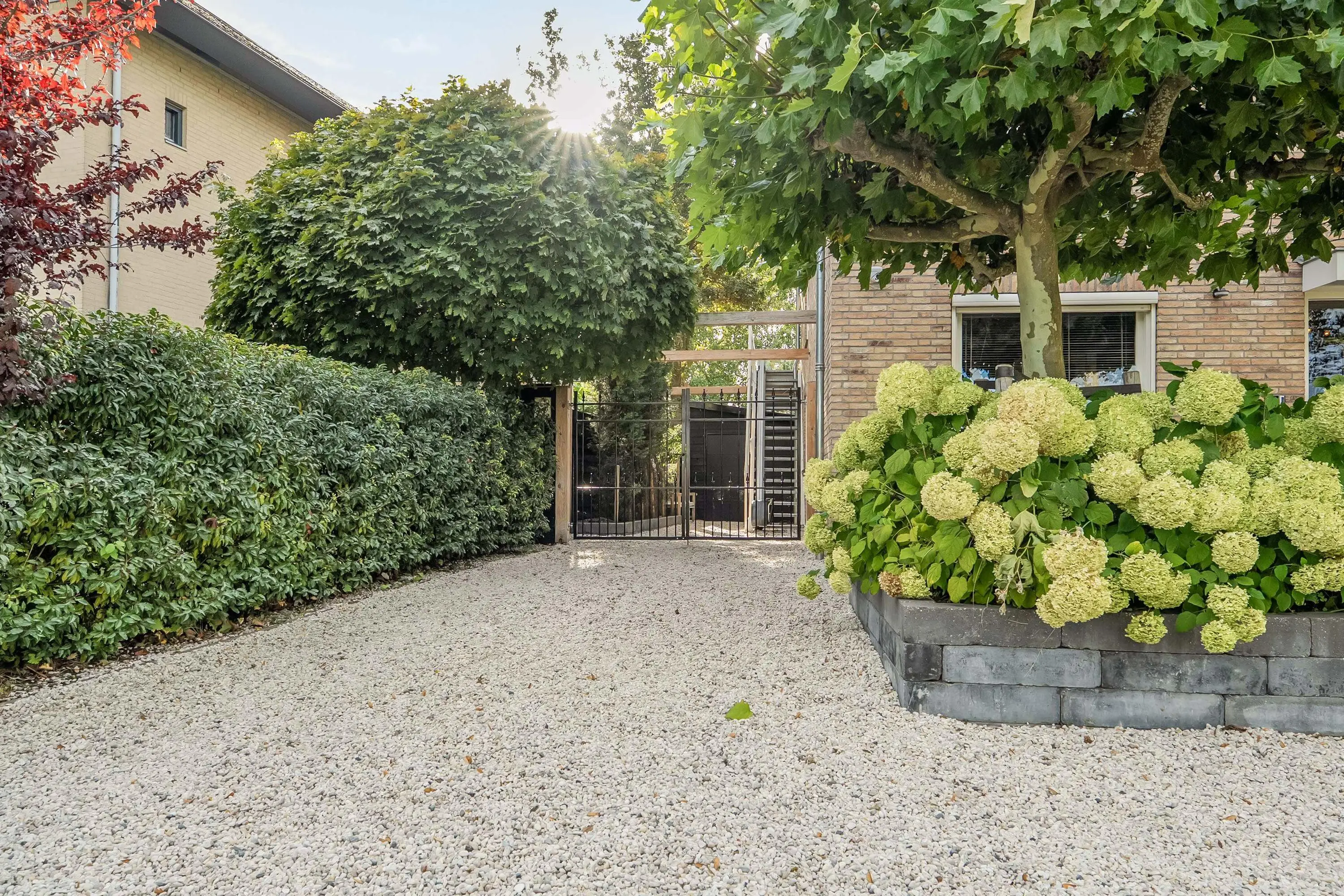 Fraai aangelegde voortuin met parkeergelegenheid voor drie auto's op eigen oprit. Tevens is de voortuin voorzien van een wandlader voor elektrische auto's, een handige buitenkraan, sfeerverlichting en stopcontacten. Via een openslaande poort heeft u toegang tot de achtertuin.