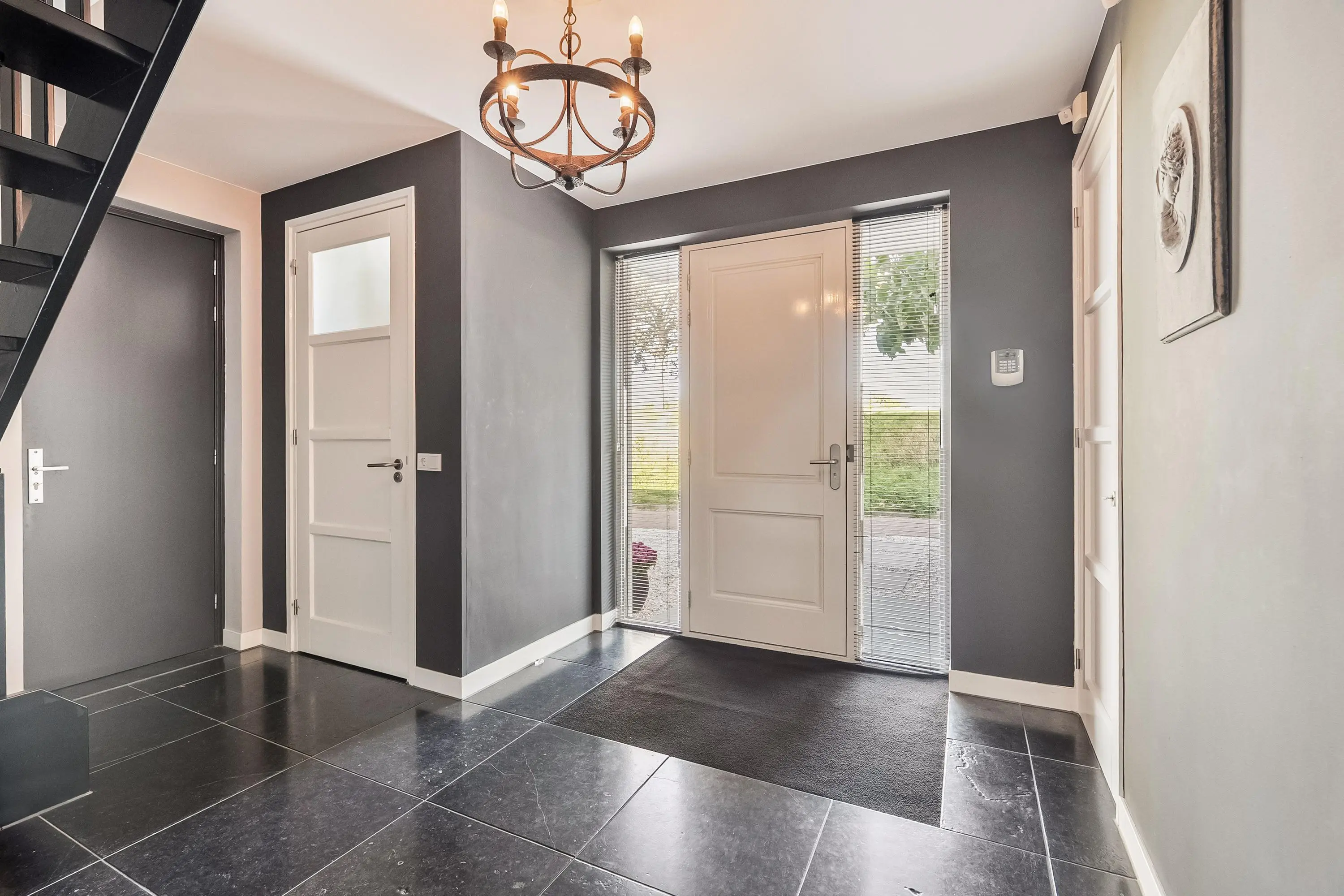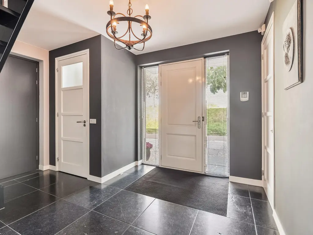 Entree met ruime hal, meterkast en trap naar de 1e verdieping. Vanuit de hal heeft u toegang tot de inpandige garage en een fraai afgewerkte toiletruimte, voorzien van een hangend toilet en fonteintje. De toiletruimte is geheel betegeld in een lichte kleurstelling.