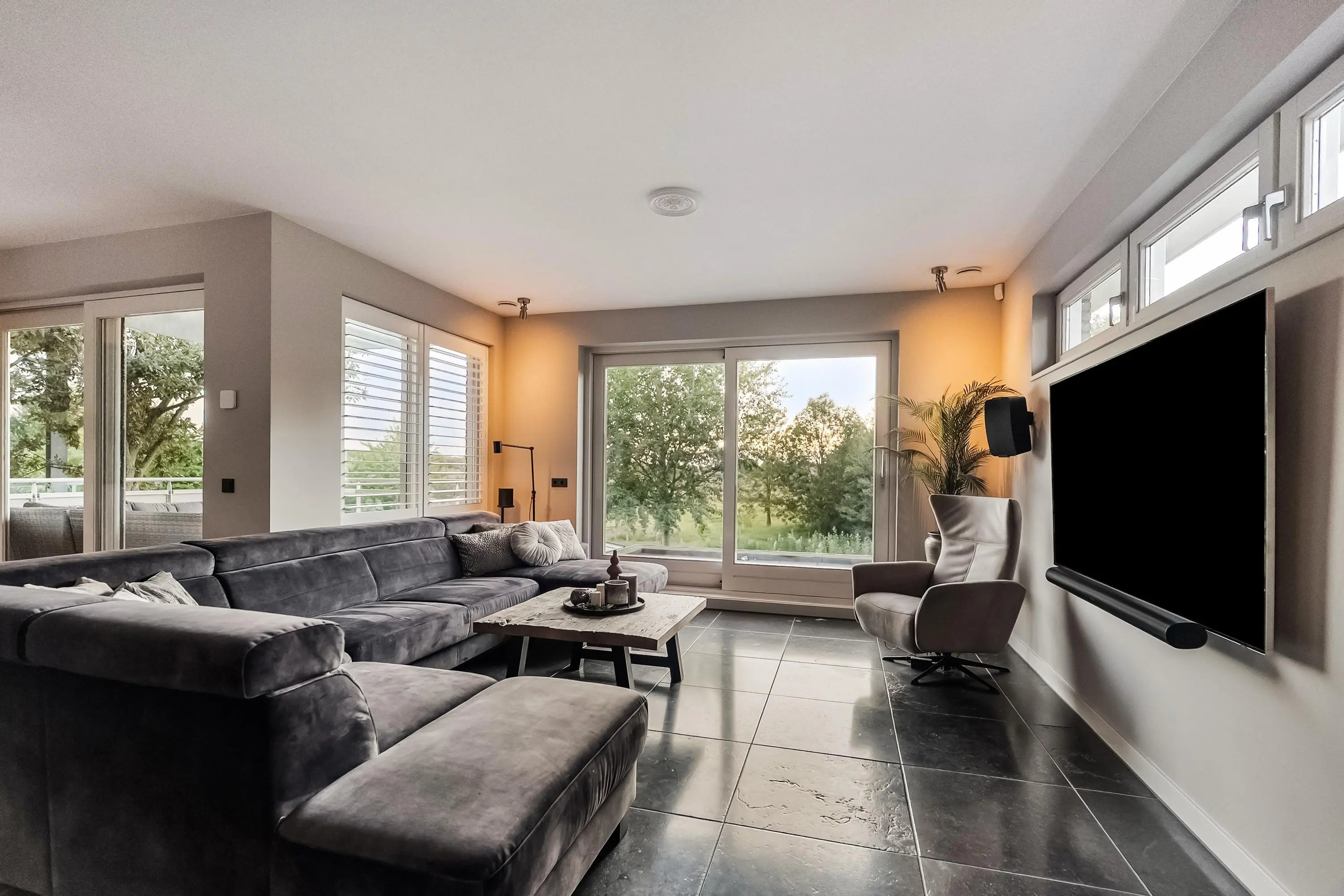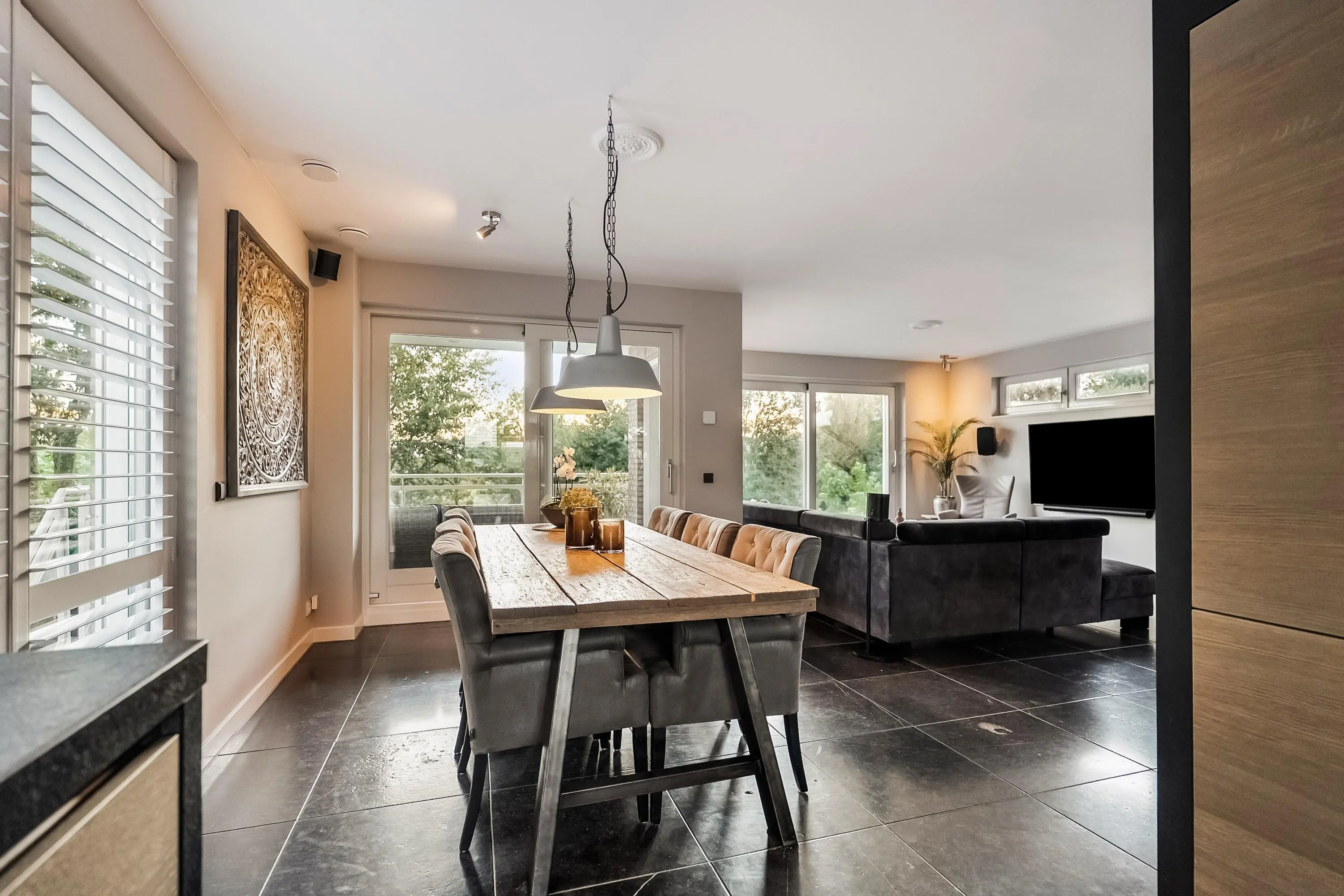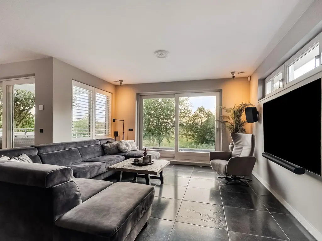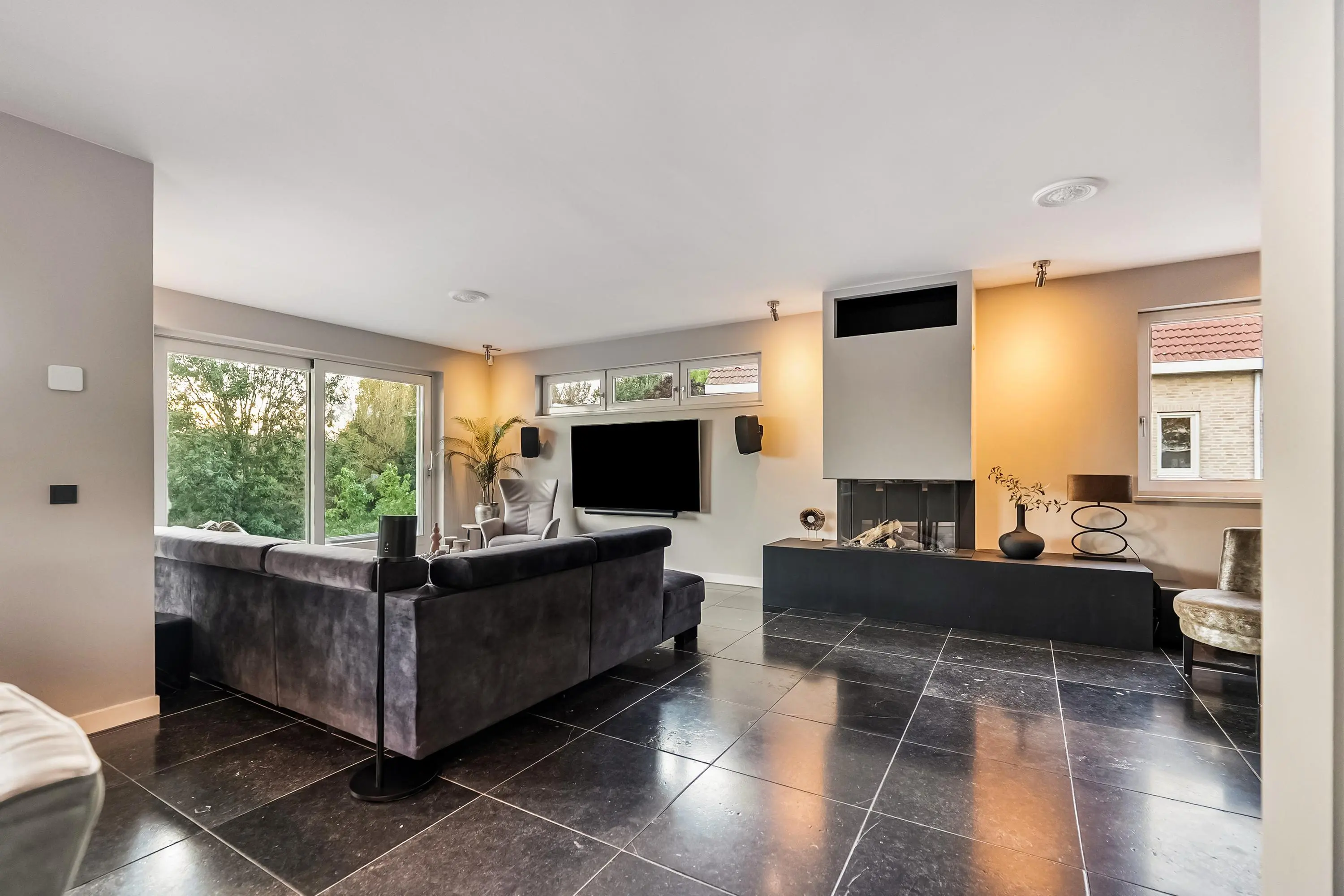 Sfeervol woongedeelte voorzien van een fraaie vloer van Belgisch hardsteen met vloerverwarming, een airconditioningsysteem dat zorgt voor de verwarming en koeling van de verdieping, een sfeervolle gashaard, elektrisch bedienbaar screen en shutter aan de zijkant van de woning. De elegante stalen glazen wand en de grote raampartijen in de woonkamer laten extra daglicht binnen en creëren een ruimtelijk gevoel. Het bedieningspaneel van het Domoticasysteem systeem waarmee u verlichting, verwarming, beveiliging en geluid eenvoudig bedient bevindt zich ook in de woonkamer. Middels openslaande deuren heeft u toegang tot het gezellige balkon met een mooi uitzicht over de achtertuin en het natuurgebied.