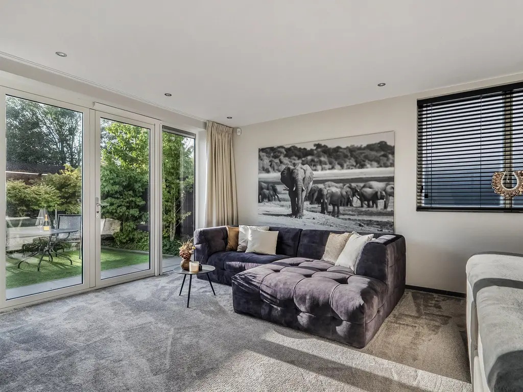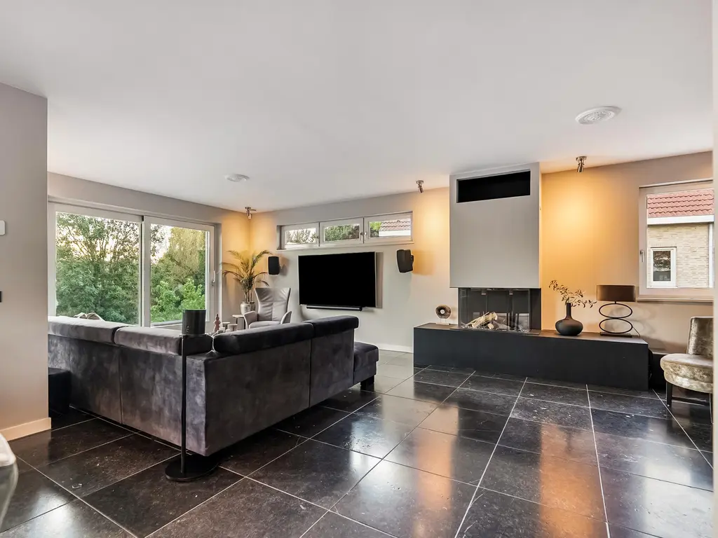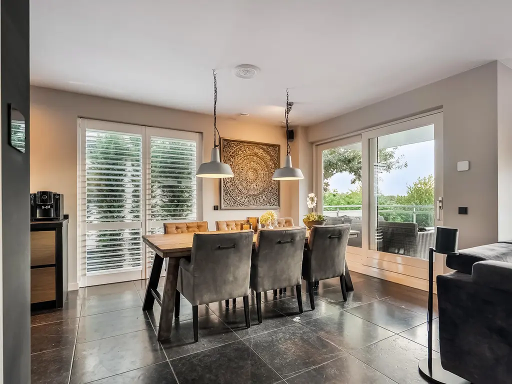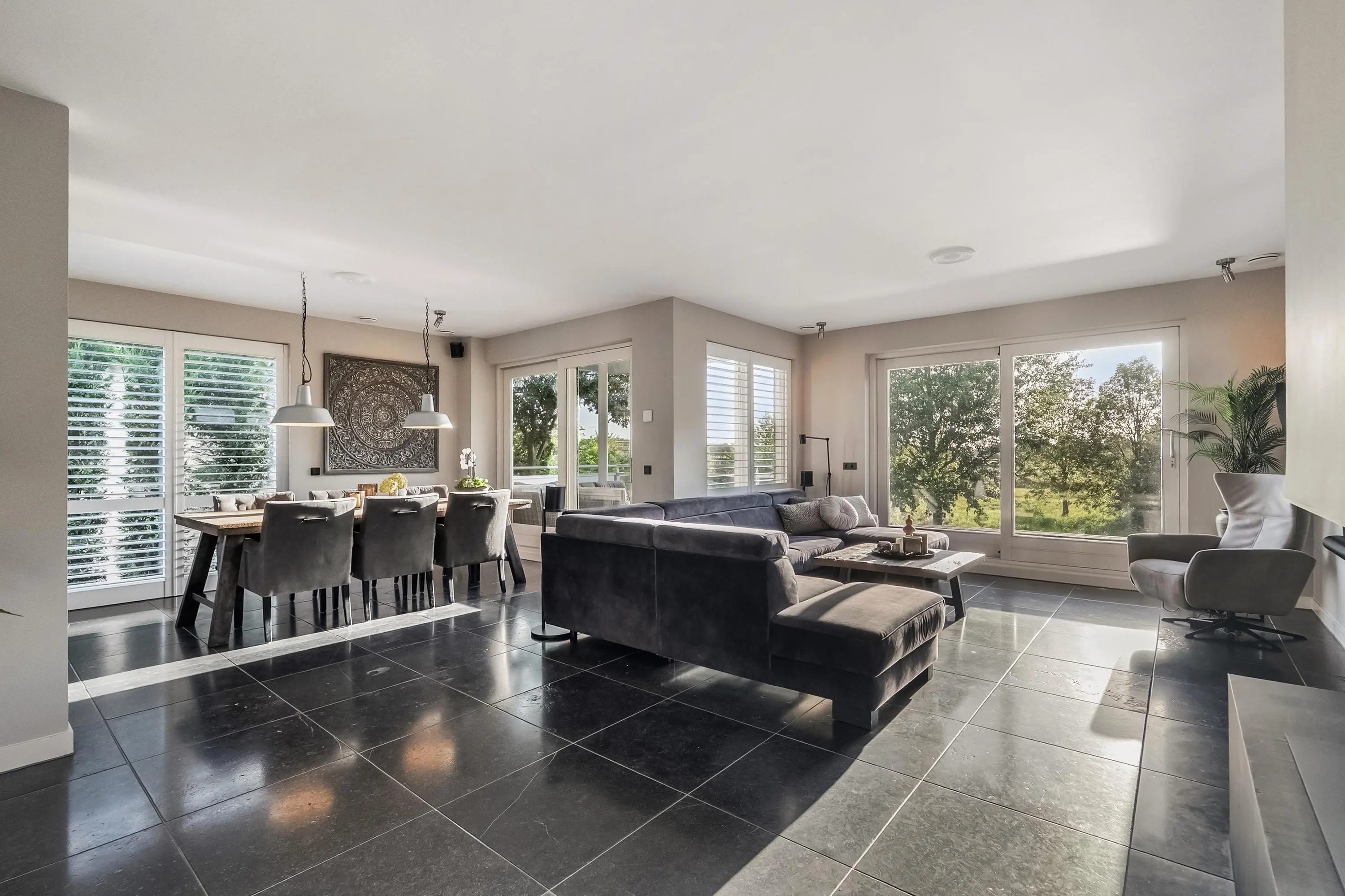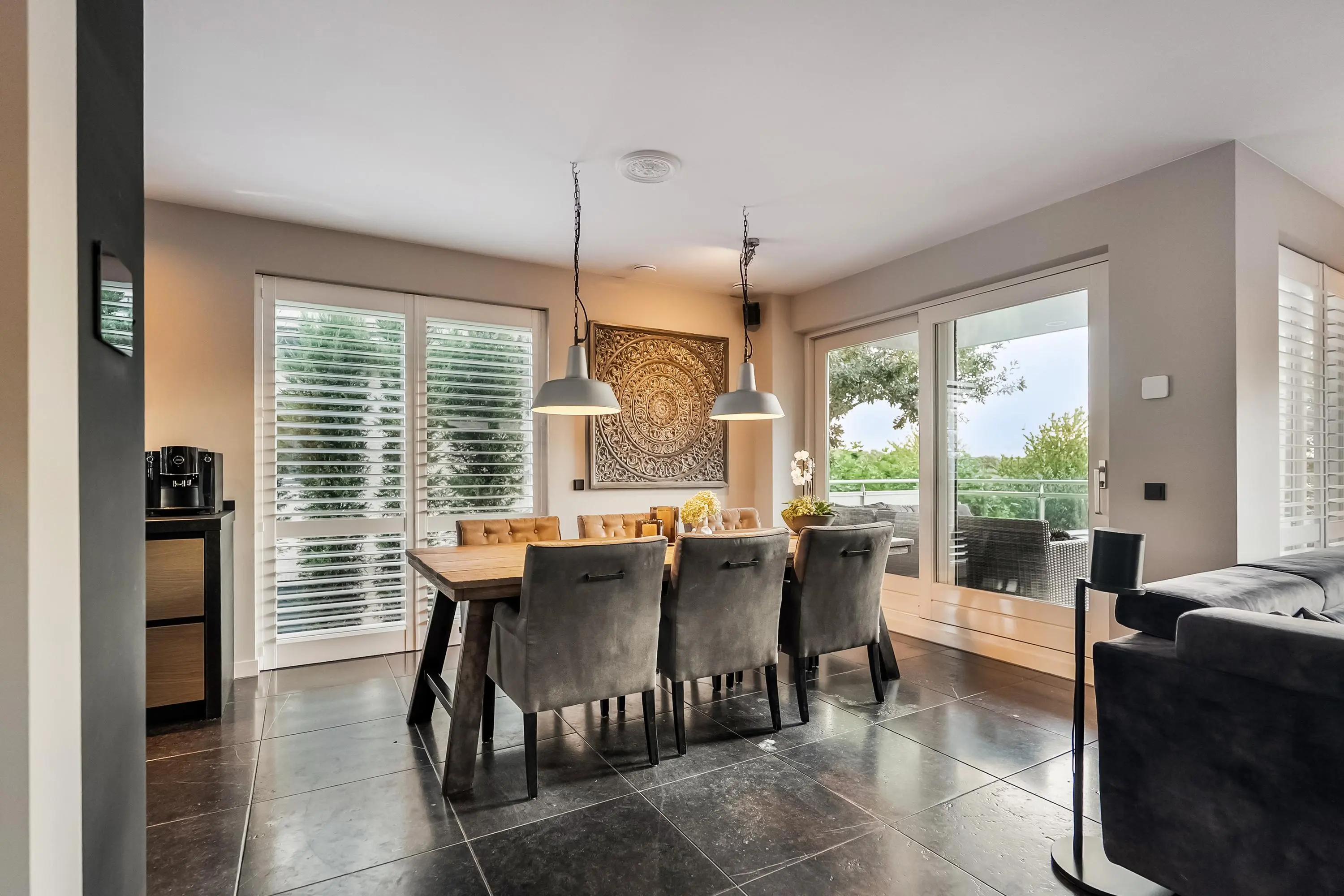 Sfeervol woongedeelte voorzien van een fraaie vloer van Belgisch hardsteen met vloerverwarming, een airconditioningsysteem dat zorgt voor de verwarming en koeling van de verdieping, een sfeervolle gashaard, elektrisch bedienbaar screen en shutter aan de zijkant van de woning. De elegante stalen glazen wand en de grote raampartijen in de woonkamer laten extra daglicht binnen en creëren een ruimtelijk gevoel. Het bedieningspaneel van het Domoticasysteem systeem waarmee u verlichting, verwarming, beveiliging en geluid eenvoudig bedient bevindt zich ook in de woonkamer. Middels openslaande deuren heeft u toegang tot het gezellige balkon met een mooi uitzicht over de achtertuin en het natuurgebied.