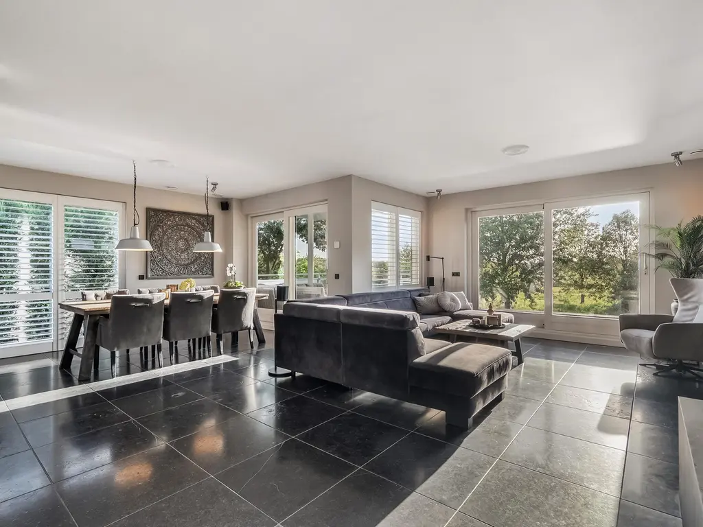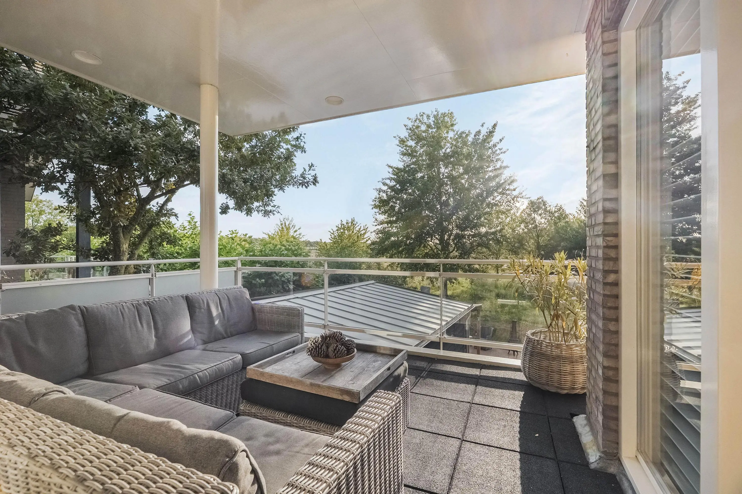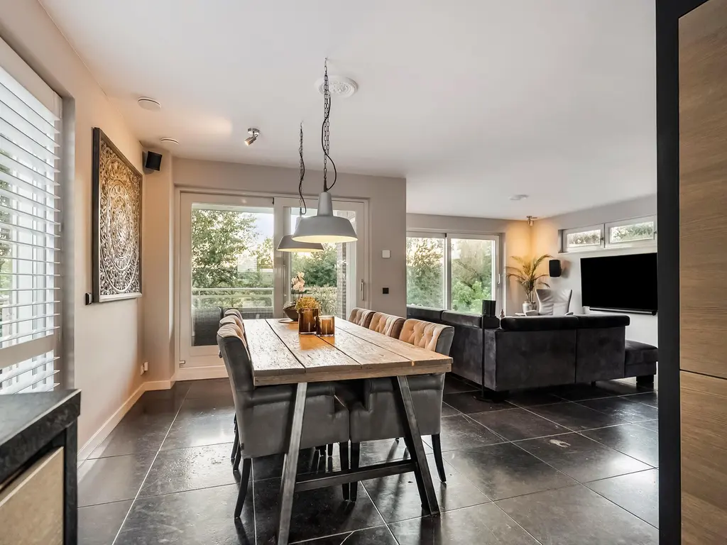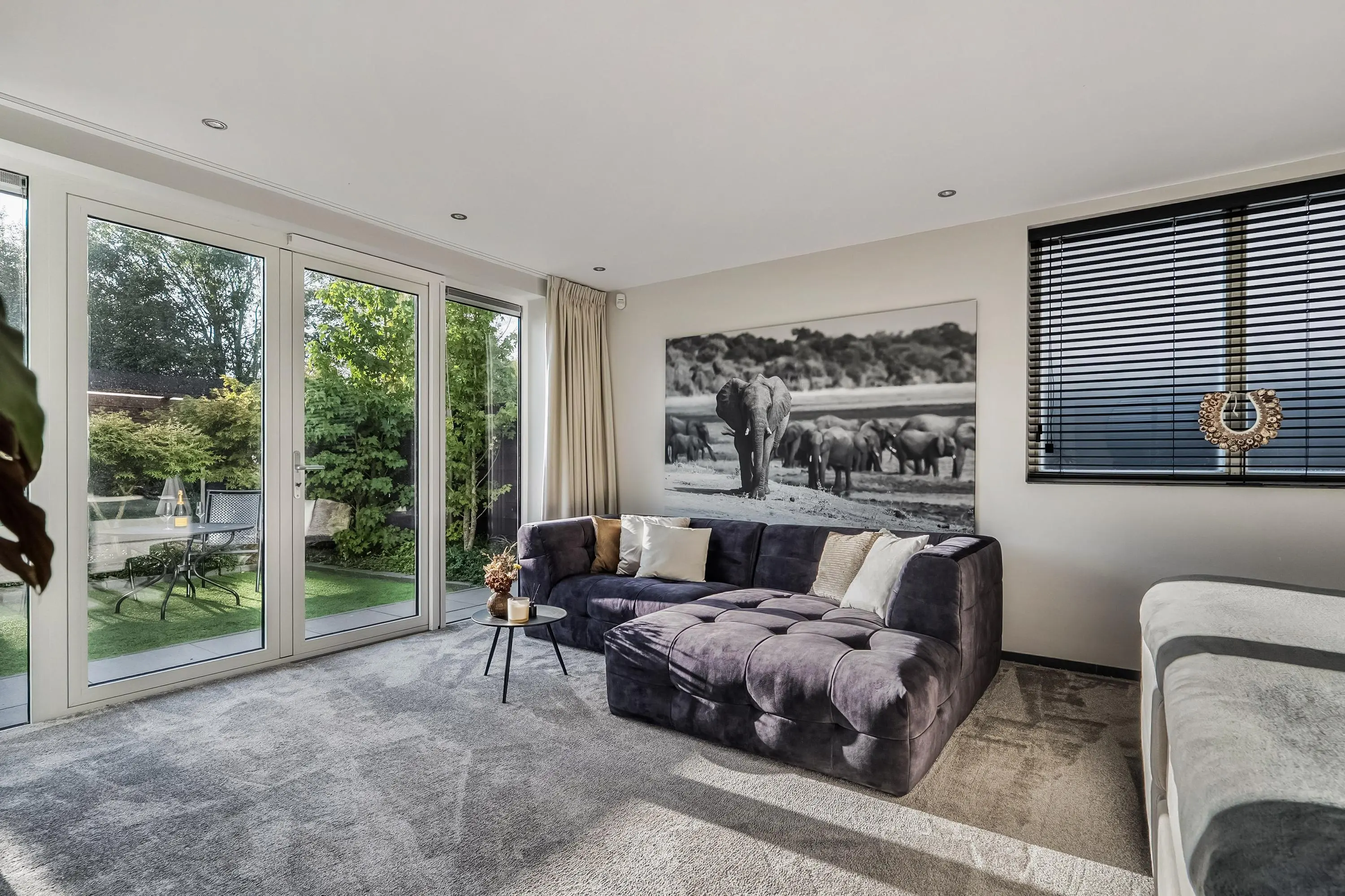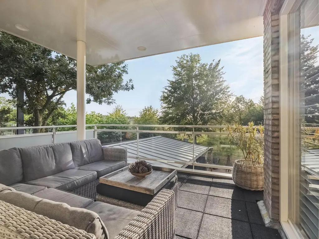 Sfeervol woongedeelte voorzien van een fraaie vloer van Belgisch hardsteen met vloerverwarming, een airconditioningsysteem dat zorgt voor de verwarming en koeling van de verdieping, een sfeervolle gashaard, elektrisch bedienbaar screen en shutter aan de zijkant van de woning. De elegante stalen glazen wand en de grote raampartijen in de woonkamer laten extra daglicht binnen en creëren een ruimtelijk gevoel. Het bedieningspaneel van het Domoticasysteem systeem waarmee u verlichting, verwarming, beveiliging en geluid eenvoudig bedient bevindt zich ook in de woonkamer. Middels openslaande deuren heeft u toegang tot het gezellige balkon met een mooi uitzicht over de achtertuin en het natuurgebied.