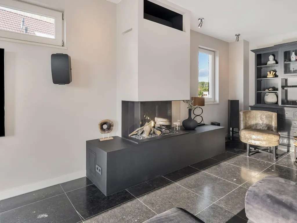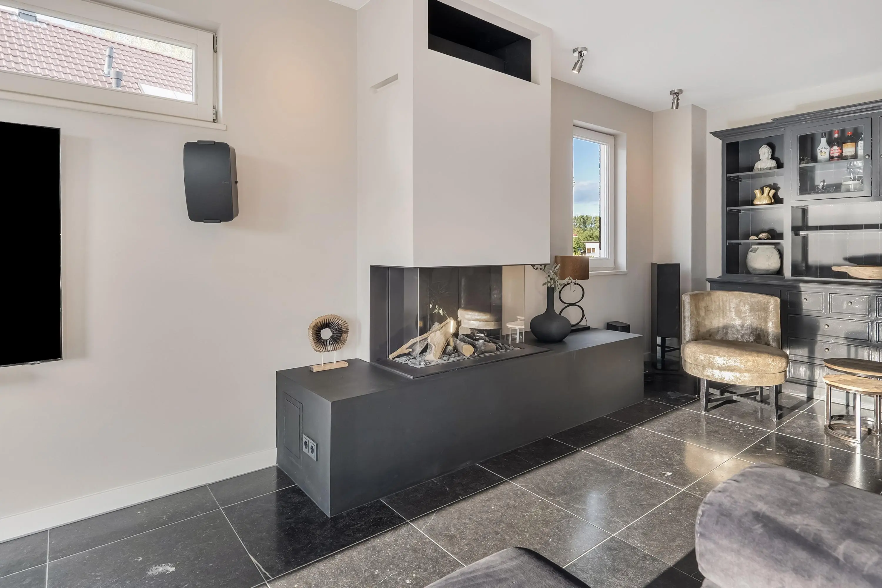 - Ruime woonkamer met sfeervolle gashaard en schuifpui naar het balkon;