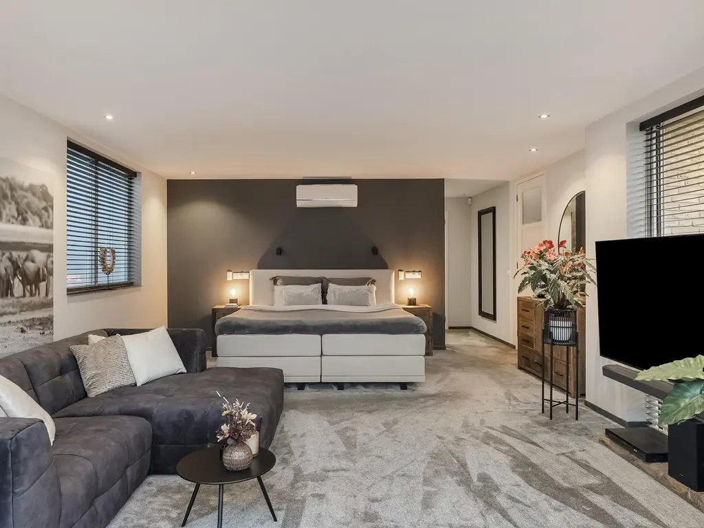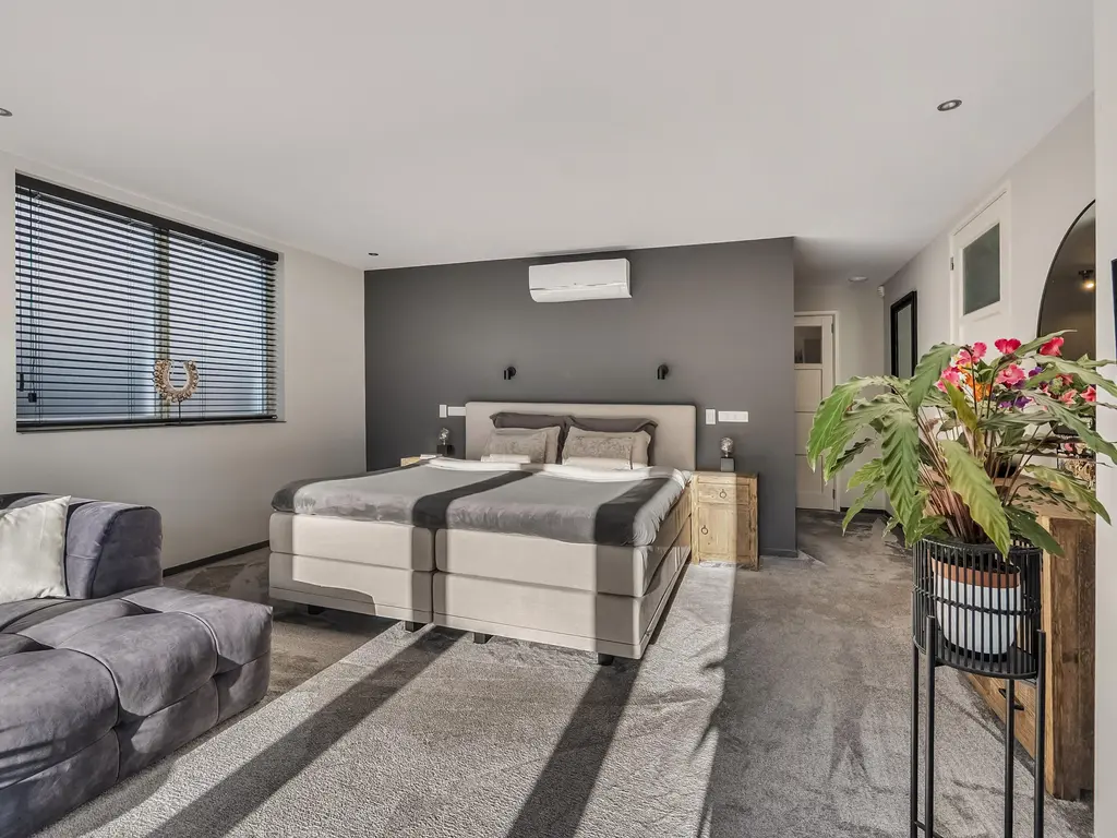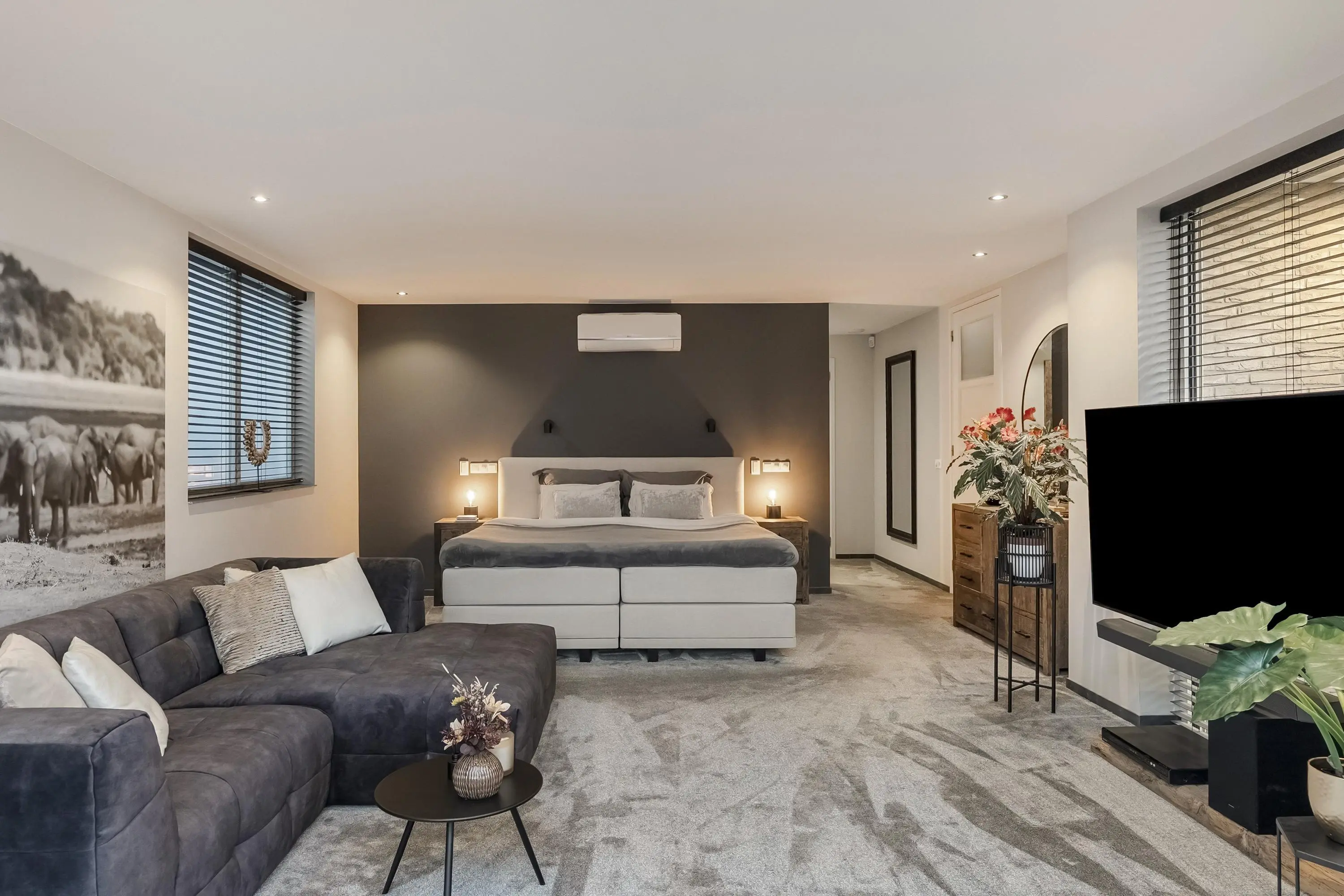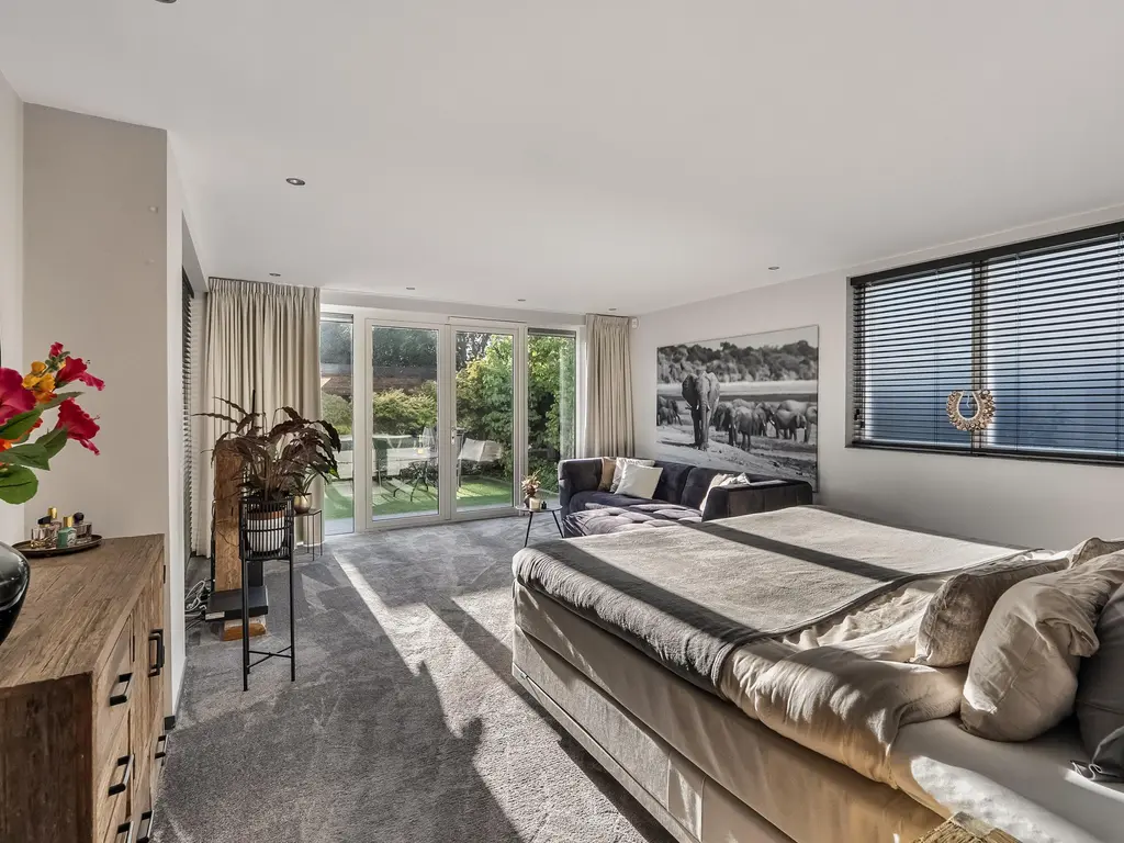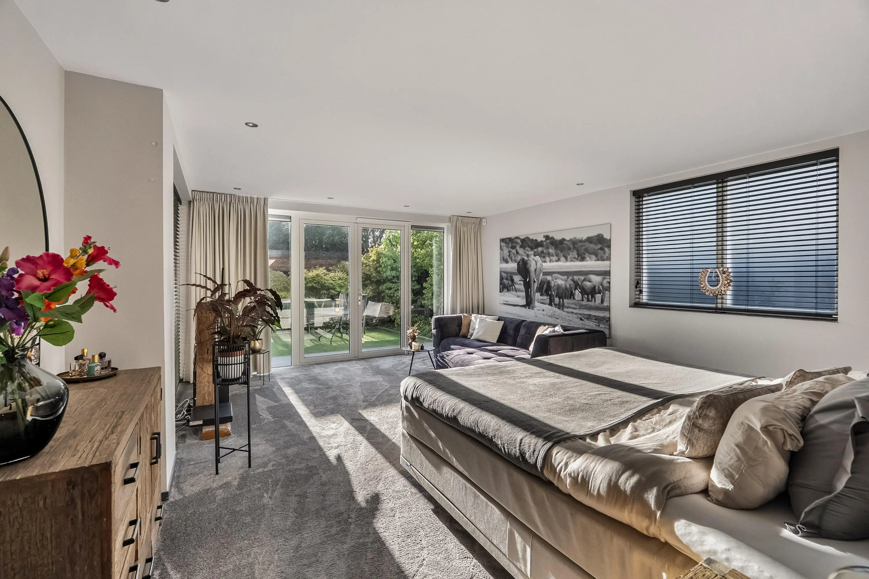 De master bedroom (ca. 26 m2) is een droom op zich. Deze royale kamer beschikt over openslaande deuren die direct toegang geven tot de prachtig aangelegde achtertuin. Dankzij de grote raampartijen geniet de kamer van een overvloed aan natuurlijk licht en een rustgevend uitzicht op het groen. Deze slaapkamer is afgewerkt met airconditioningsysteem, elektrisch bedienbaar rolluik, horren, vloerbedekking met vloerverwarming en sfeerverlichting.