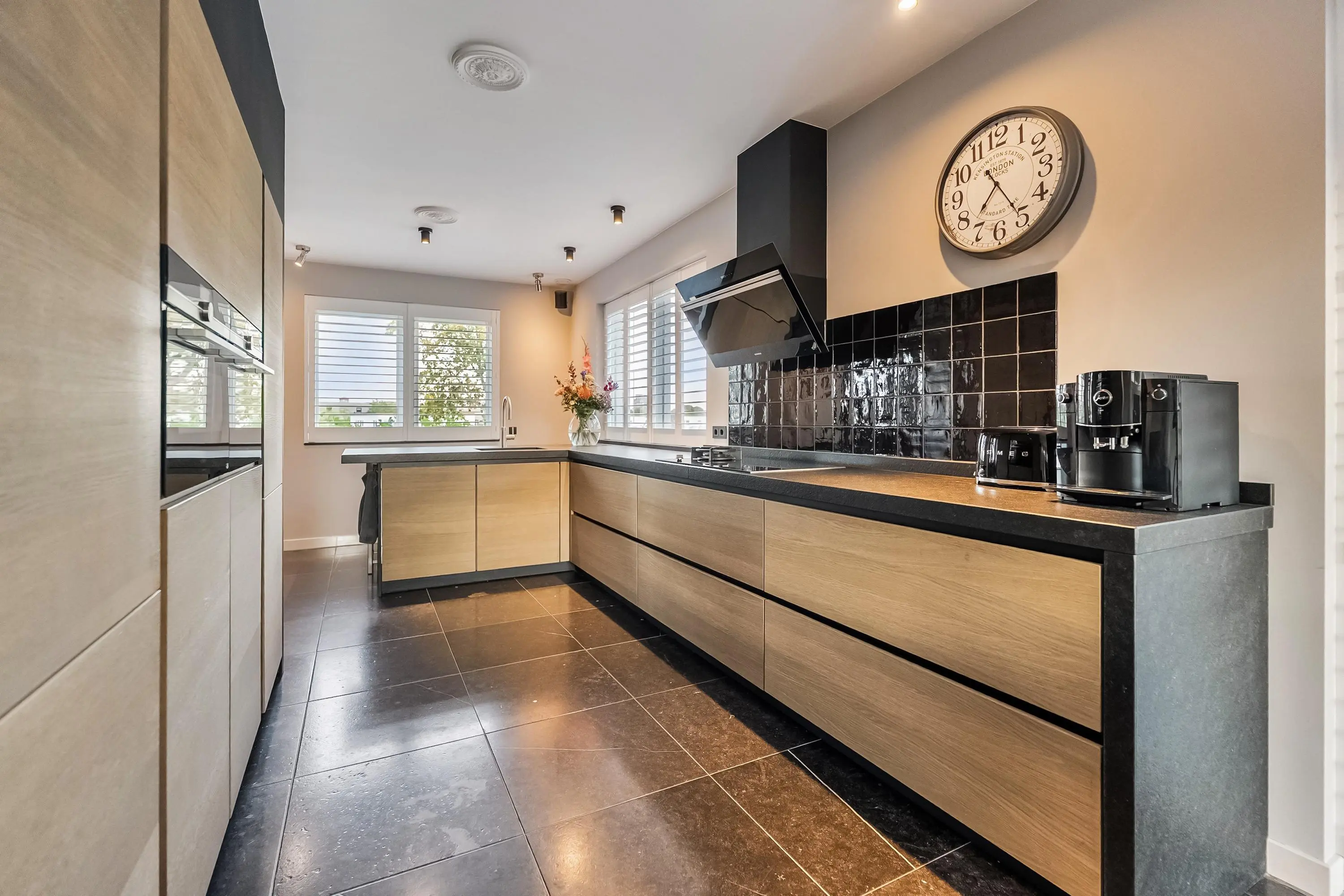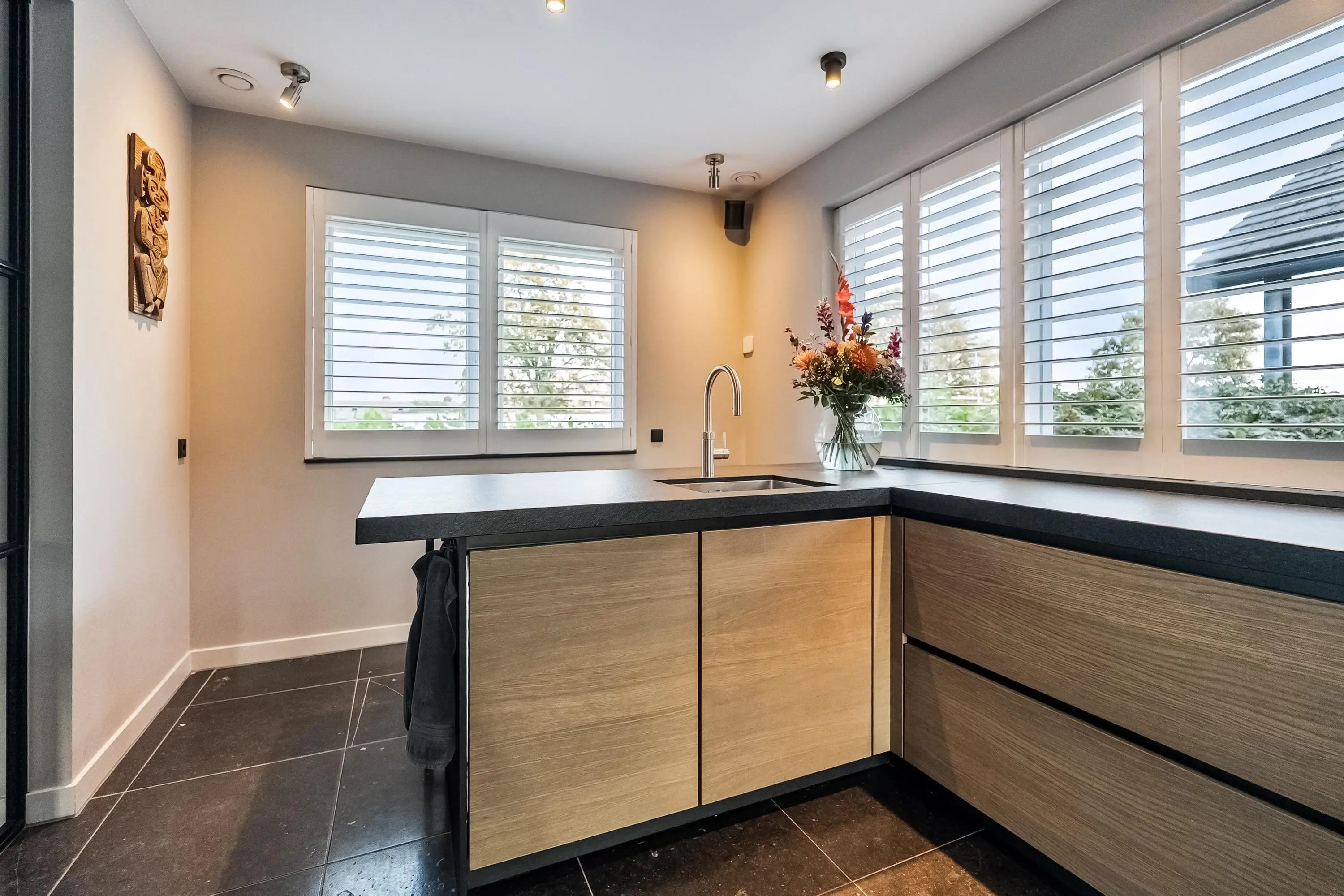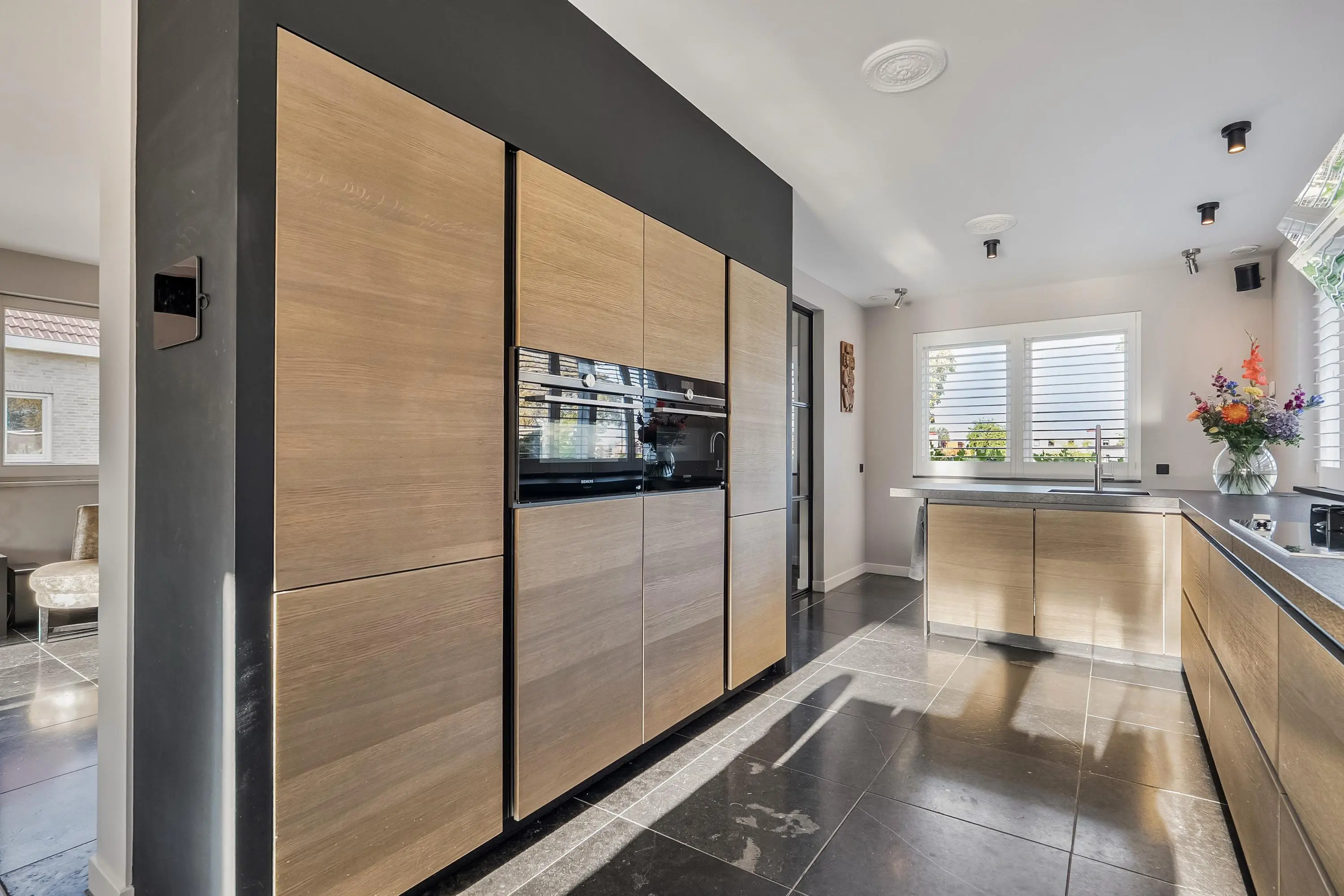 De moderne open keuken (bouwjaar 2021) is gelegen aan de voorzijde van de woning en is uitgevoerd in een L-opstelling met een gezellige ontbijtbar. Deze complete keuken is voorzien van diverse inbouwapparatuur van het merk Siemens zoals koelkast, vrieskast, inductie kookplaat met een wokbrander op gas, design afzuigkap, stoomoven, combi-ovenmagnetron en een vaatwasser. Tevens is de keuken voorzien van een enkele spoelbak met een heet/bruisend Quooker kraan, ingebouwde USB-aansluiting, stopcontacten voor uw keukenmachines op het keukenblad en voldoende kastruimte met grote laden. Het geheel is uitgevoerd in zwarte en houten kleurstelling en is afgewerkt met een natuurstenen aanrechtblad. De vloer bestaat uit Belgisch hardsteen met vloerverwarming en shutters op de raampartijen aan de voor- en zijkant. De open keuken vormt het kloppend hart van de woning en sluit moeiteloos aan op het woongedeelte.