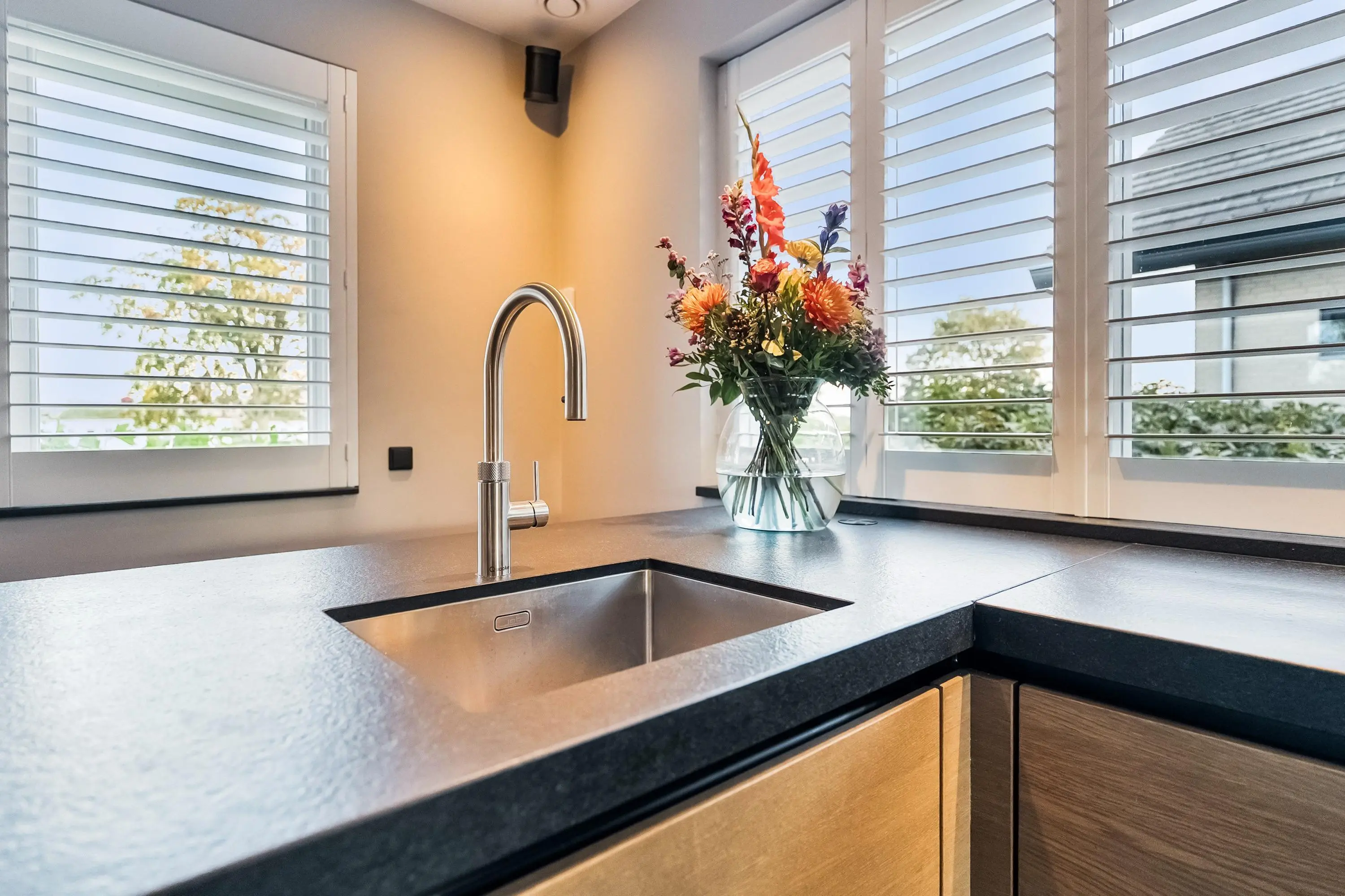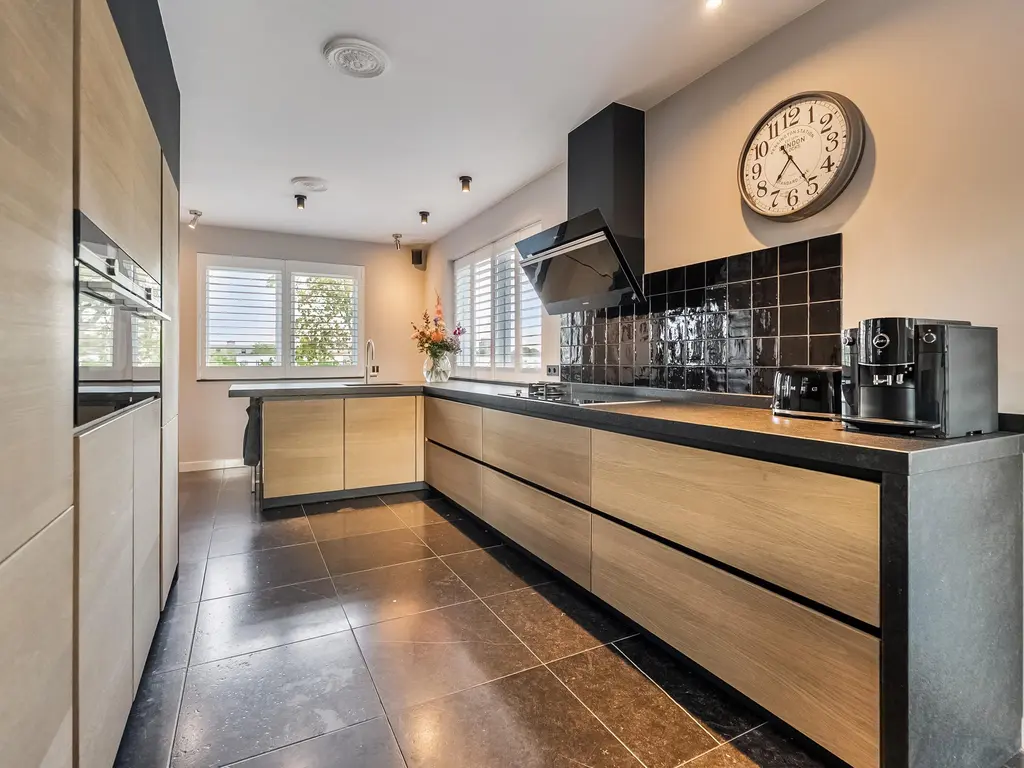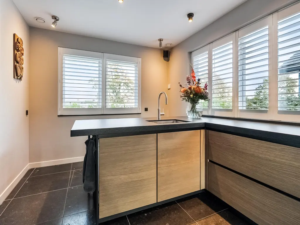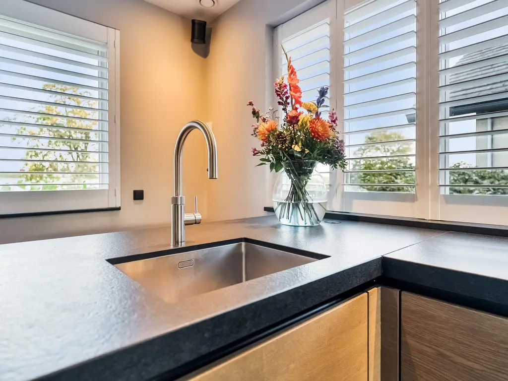De moderne open keuken (bouwjaar 2021) is gelegen aan de voorzijde van de woning en is uitgevoerd in een L-opstelling met een gezellige ontbijtbar. Deze complete keuken is voorzien van diverse inbouwapparatuur van het merk Siemens zoals koelkast, vrieskast, inductie kookplaat met een wokbrander op gas, design afzuigkap, stoomoven, combi-ovenmagnetron en een vaatwasser. Tevens is de keuken voorzien van een enkele spoelbak met een heet/bruisend Quooker kraan, ingebouwde USB-aansluiting, stopcontacten voor uw keukenmachines op het keukenblad en voldoende kastruimte met grote laden. Het geheel is uitgevoerd in zwarte en houten kleurstelling en is afgewerkt met een natuurstenen aanrechtblad. De vloer bestaat uit Belgisch hardsteen met vloerverwarming en shutters op de raampartijen aan de voor- en zijkant. De open keuken vormt het kloppend hart van de woning en sluit moeiteloos aan op het woongedeelte.