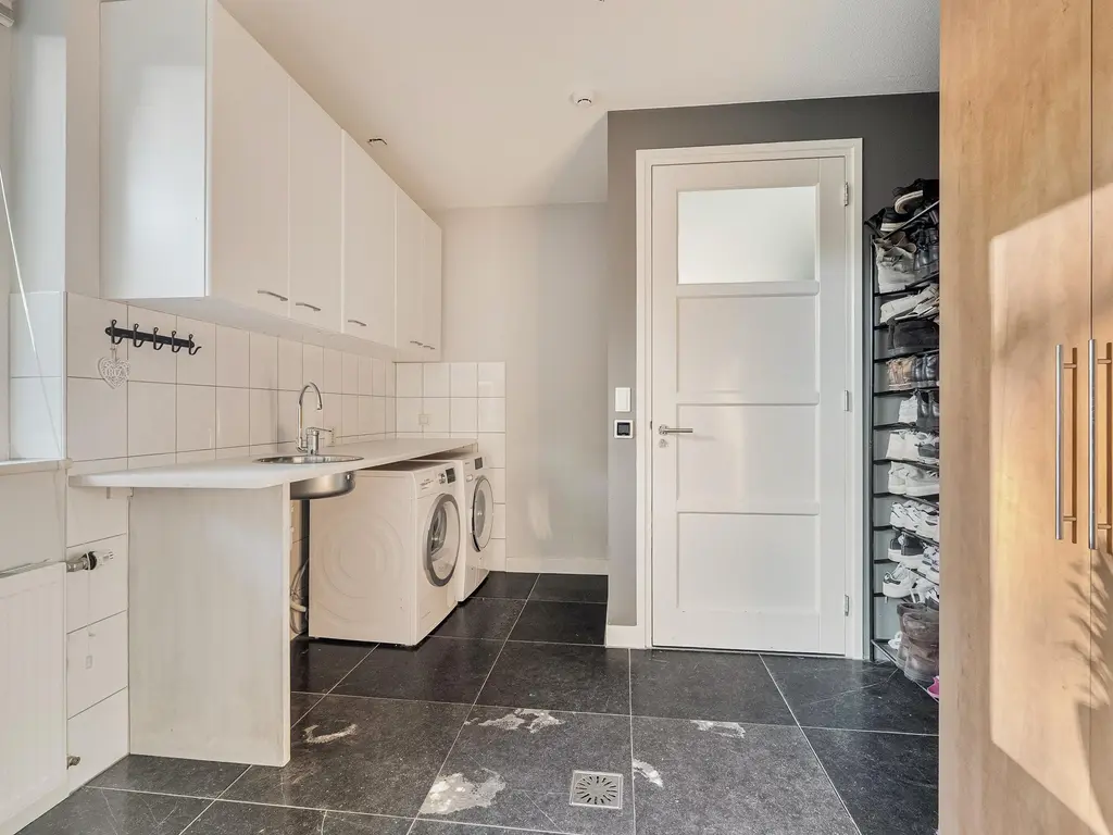 Wasruimte (ca. 12 m2) is gelegen aan de achterzijde van de woning en beschikt over een vloer van Belgisch hardsteen met vloerverwarming, 4-deuren vaste kasten en een pantry met de aansluiting voor de wasapparatuur, een wasbak met een koud- en warmwaterkraan en extra kastruimte. Middels openslaande deuren met elektrisch bedienbaar rolluik heeft u toegang tot de zij/achtertuin.