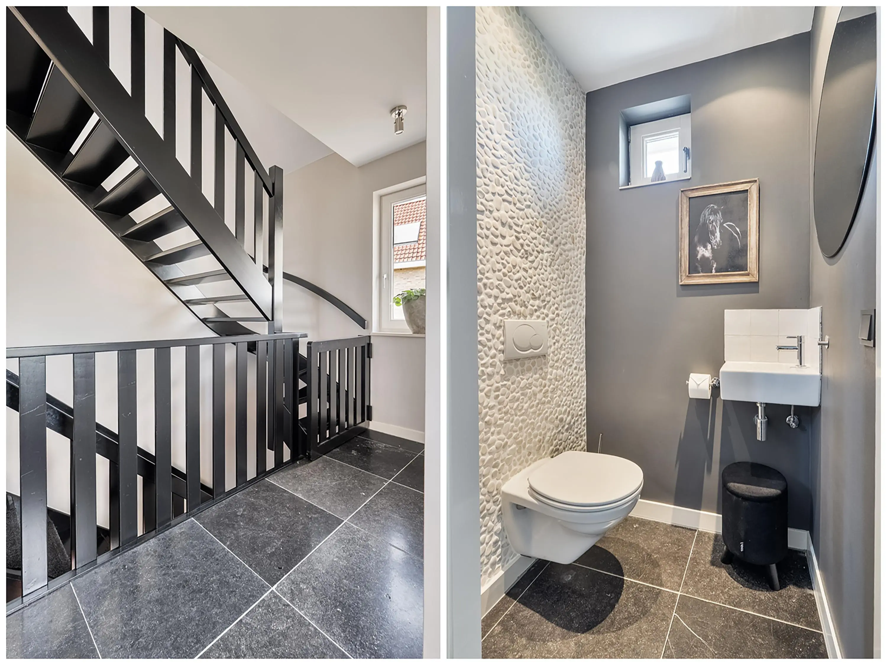Overloop met trap naar de tweede verdieping, bergkast, fraai afgewerkte toiletruimte voorzien van een hangend toilet en fonteintje. De toiletruimte is geheel betegeld in een lichte kleurstelling en afgewerkt met spotjes. Middels een sfeervolle stalen deur heeft u toegang tot het woongedeelte.