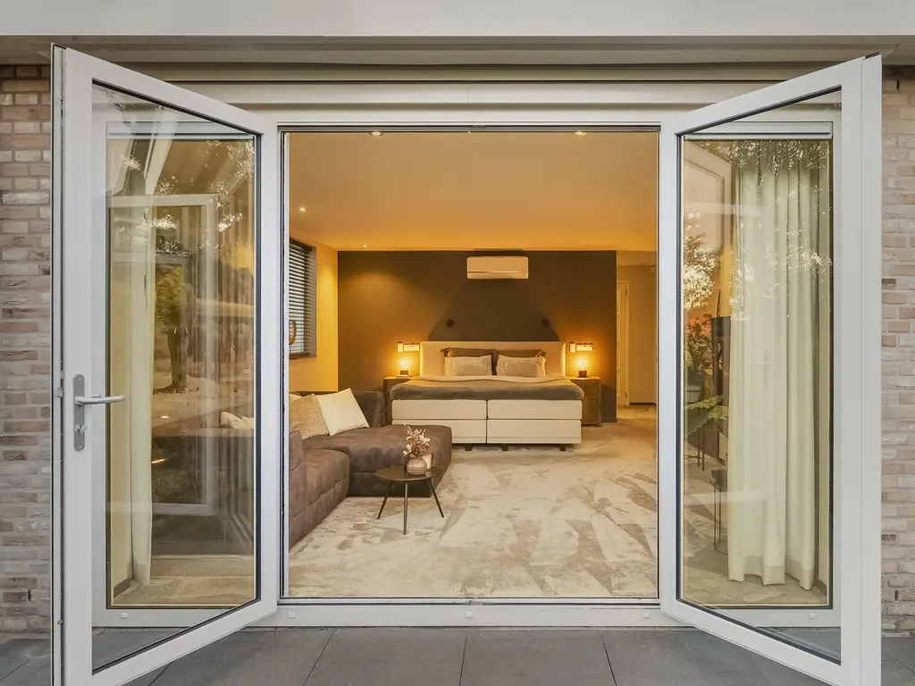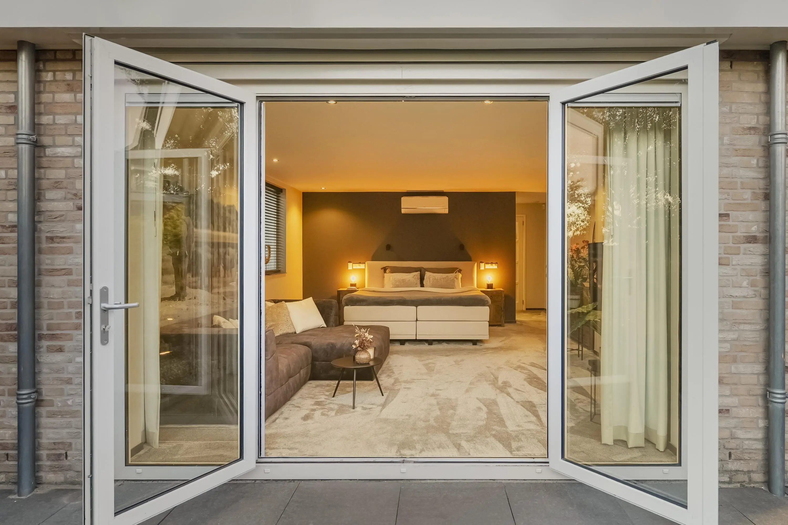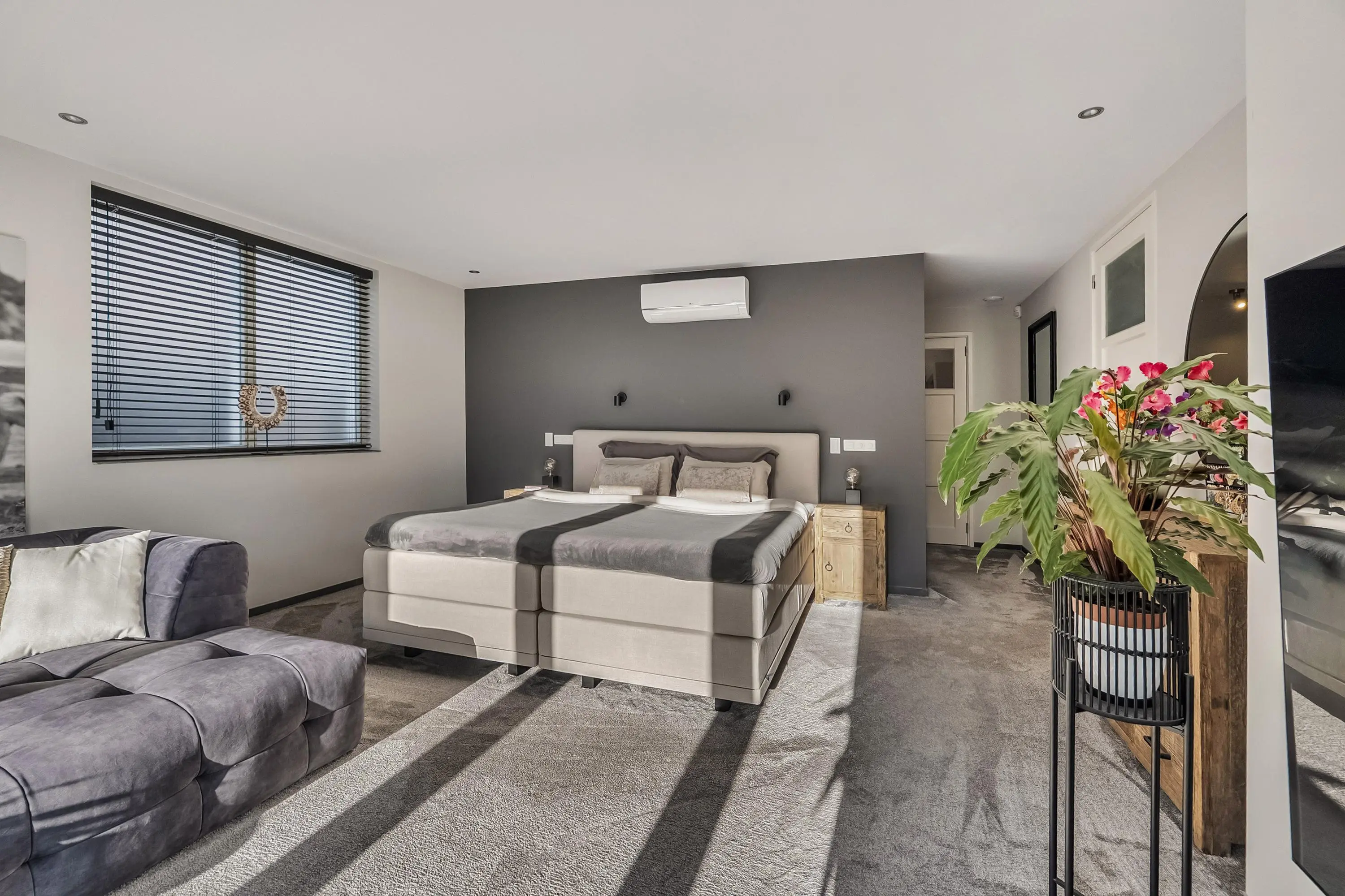 - Master bedroom met inloopkast, openslaande deuren naar de tuin en eigen luxe badkamer met whirlpool;